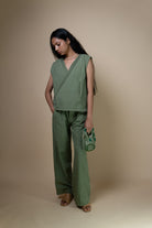 The design highlights the natural texture of Kala Cotton requiring only minimal embellishment to tie it all together. Featuring a high waist, slightly tapered silhouette, and front pleats, the pants offer a relaxed yet neat fit. A foldable hem reveals olive checkered fabric underneath, while discreet drawstrings ensures an adjustable fit. Traditional Kantha lines adds to the understated appeal of the pants.