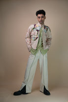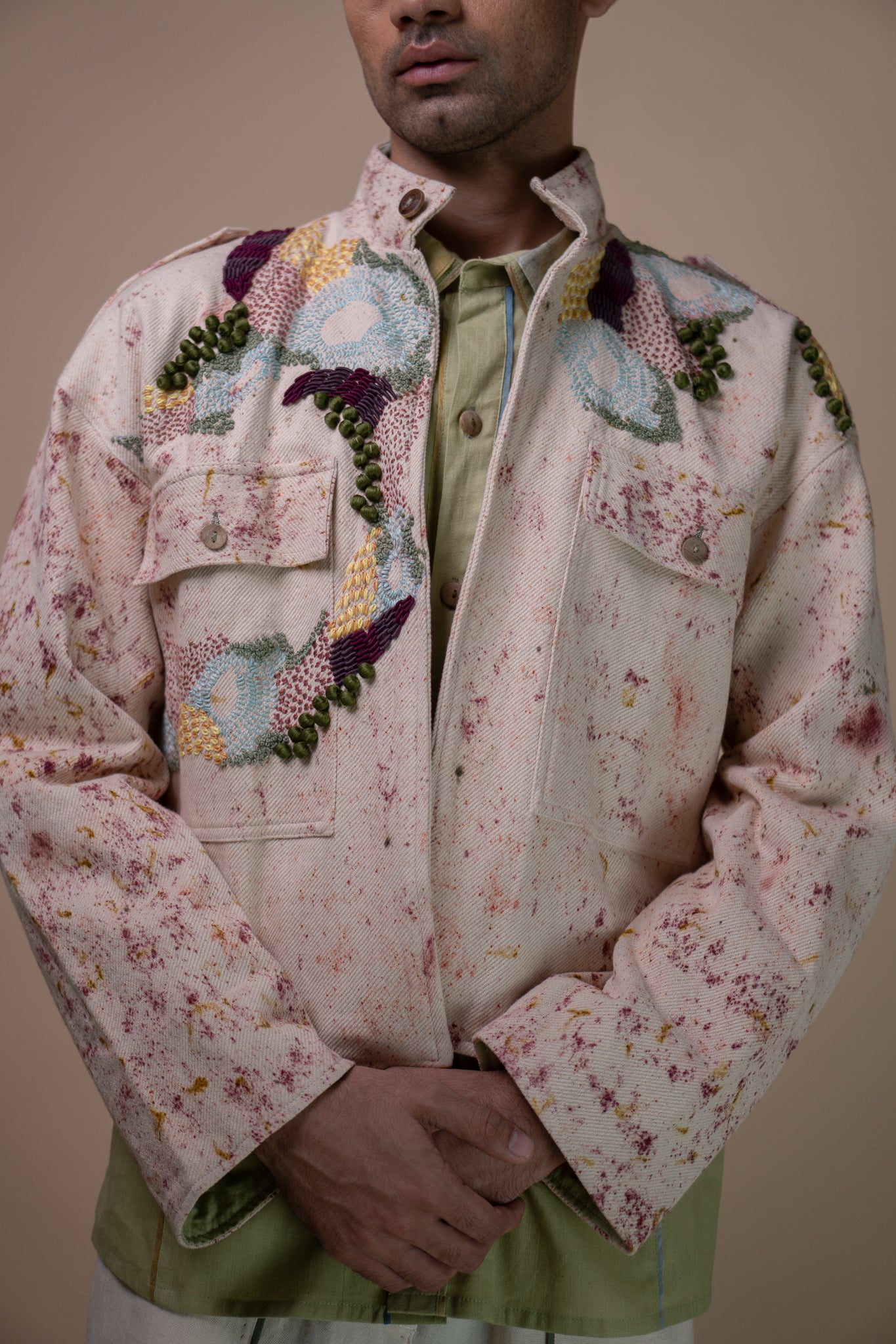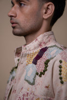Intricate hand embroidery combines embellishments with wooden beads, French knots, bullion knots, lazy daisy stitches, and traditional Kantha work. The embroidery flows organically, mimicking the natural spread of moss, giving each jacket a unique, handcrafted finish.