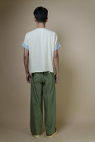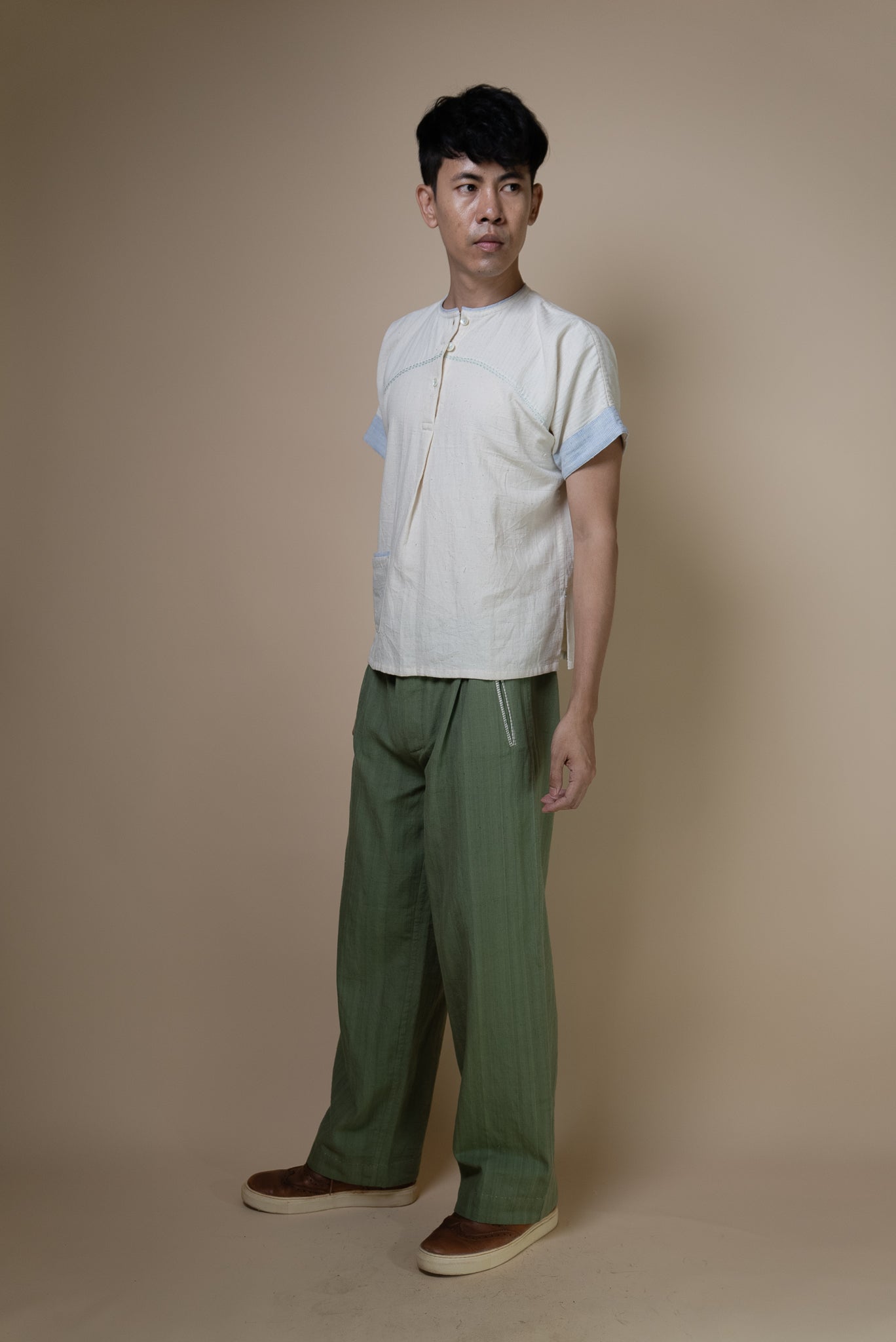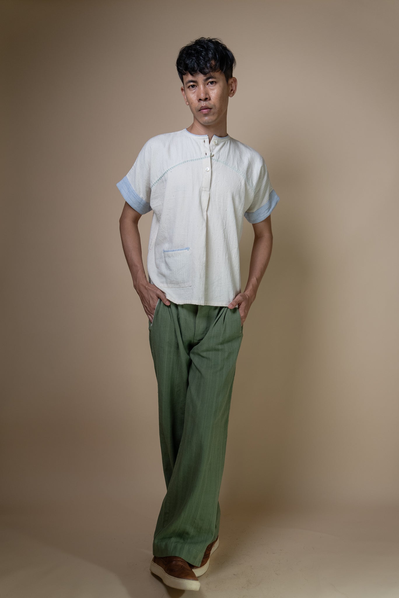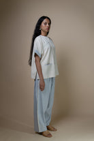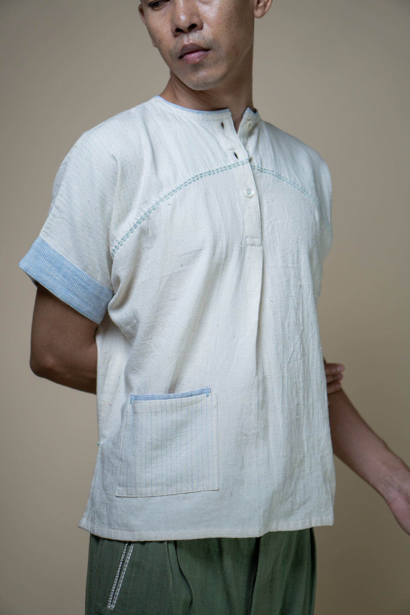 This minimal shirt features wide sleeves, a round neckline, and yoke detailing for a relaxed yet sleek look. A functional patch pocket, along with intricate hand-embroidered Kantha lines along the yoke and neckline, add to this simple piece making it a versatile separate or ideal for layering.