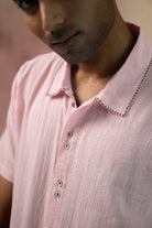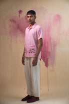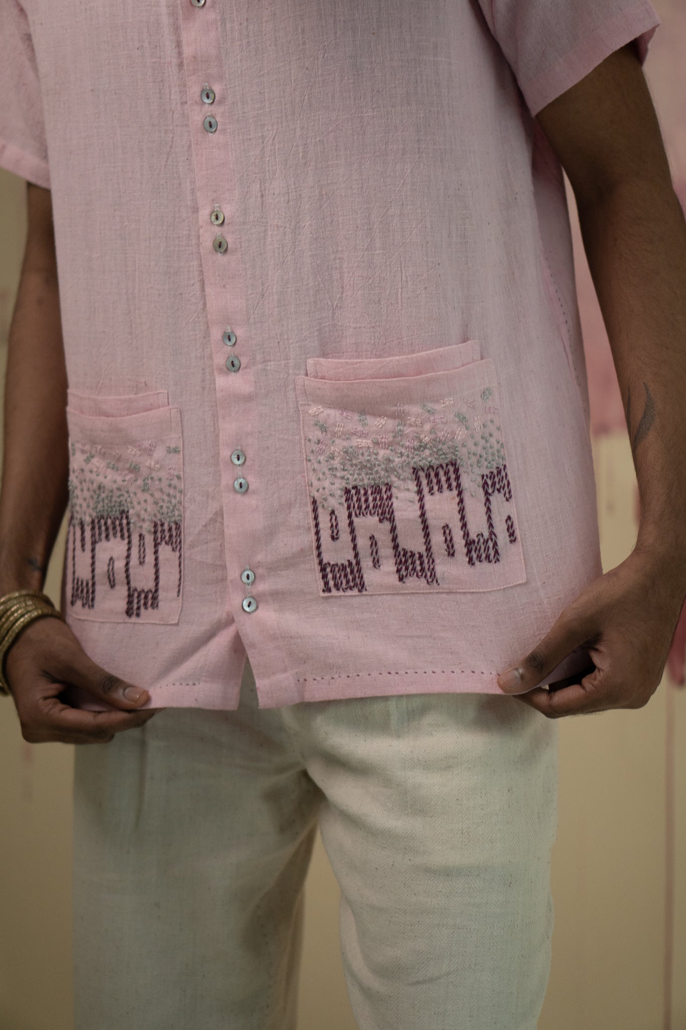 Elevate your wardrobe with a classic spread collar shirt silhouette that stands out effortlessly. This half-sleeve shirt features pleats at the back and two double patch pockets embroidered with a captivating mix of Kantha, Couching and French knots. The meticulous tucking of pleats and pockets with notches adds a distinctive finishing touch.