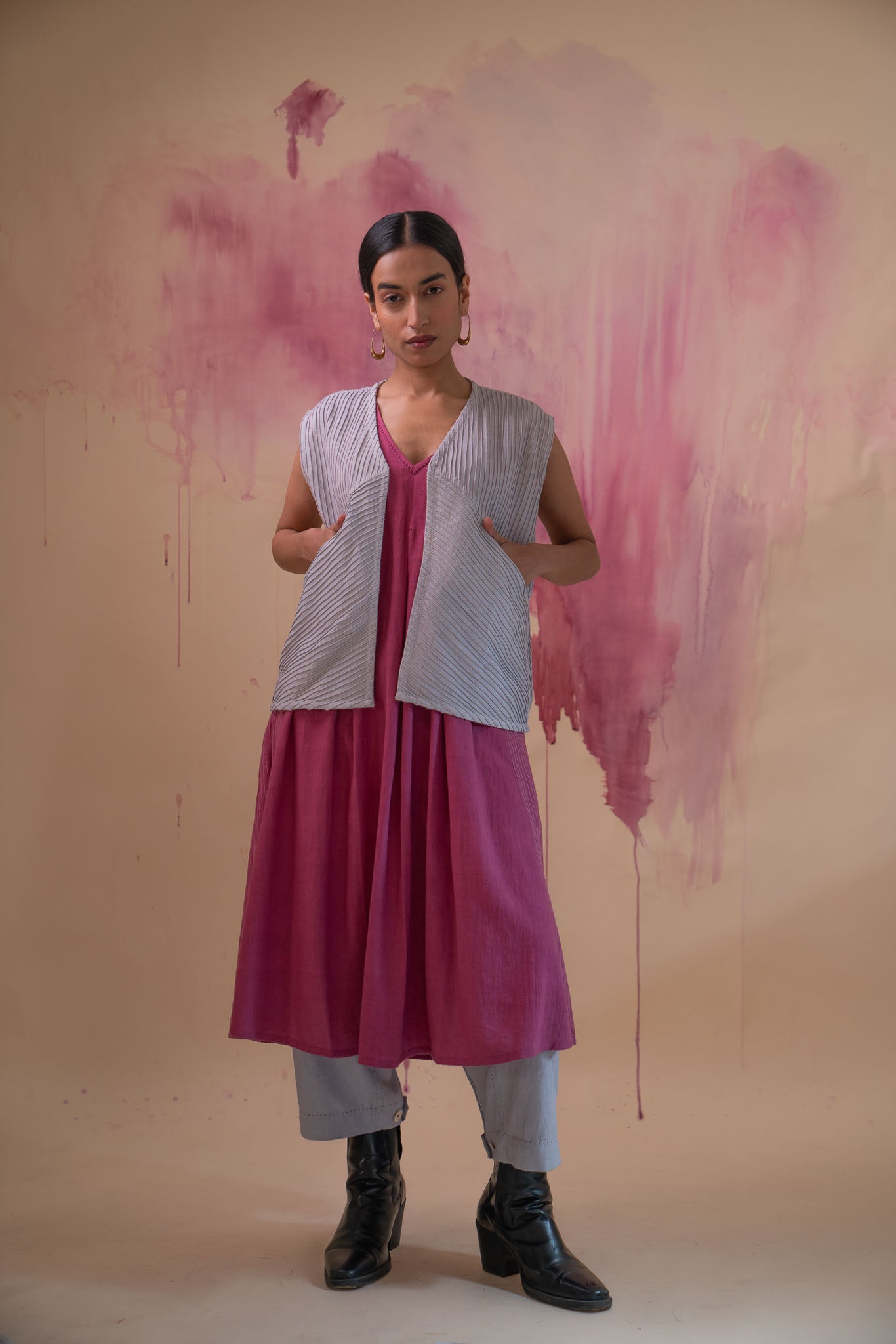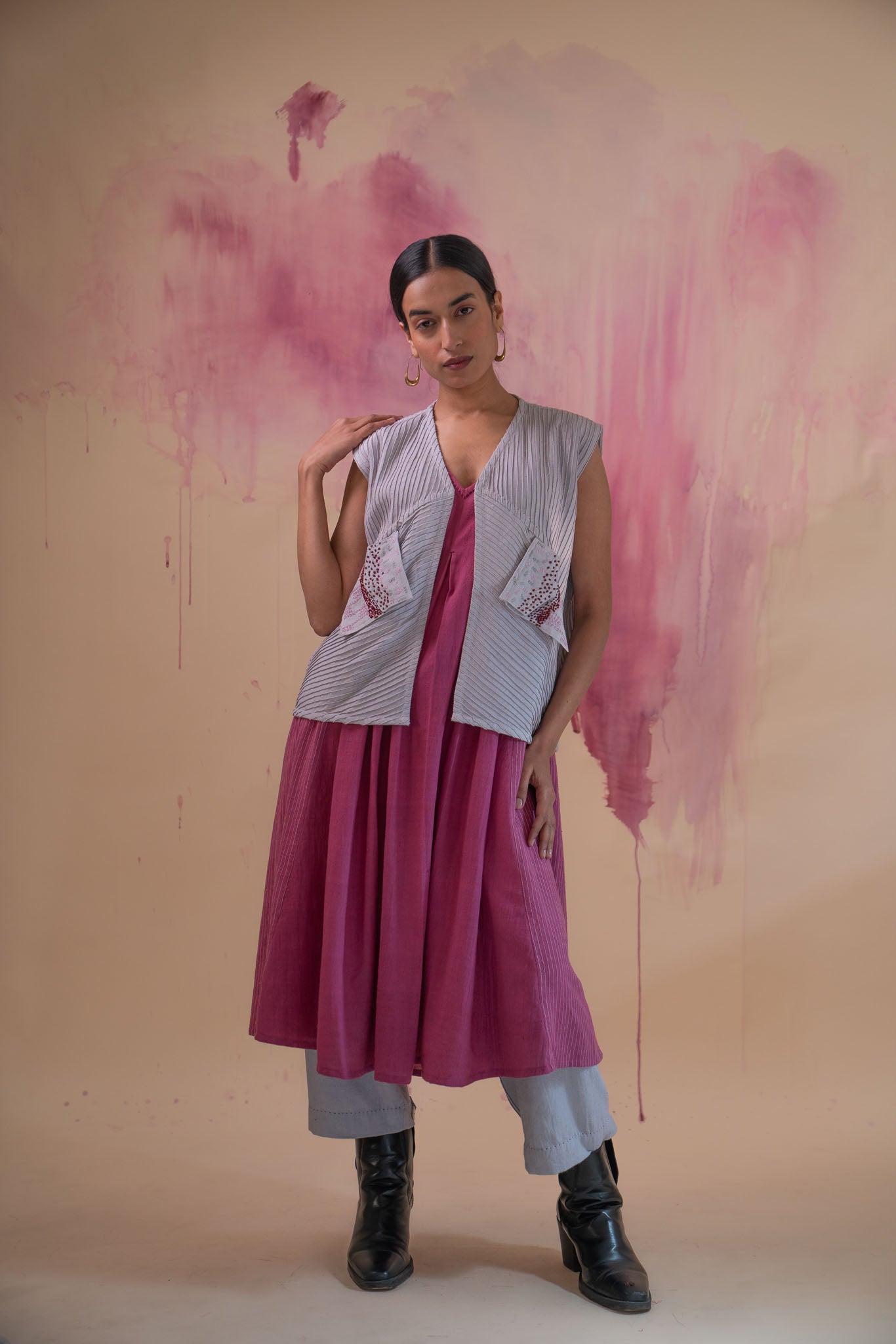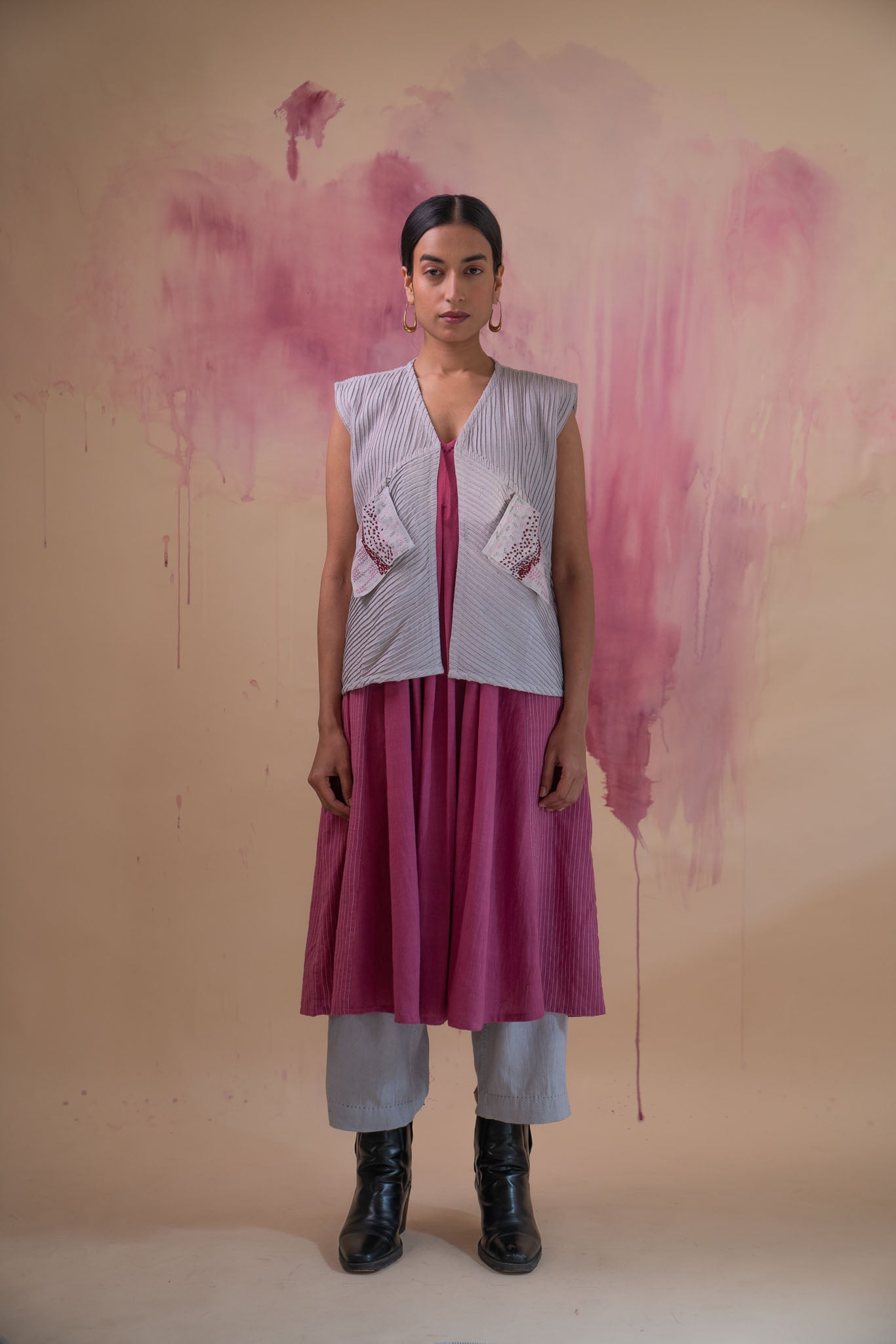 Our unisex vest, featuring pintucks with maroon stitch lines throughout that create a visually dynamic and textured surface. This versatile piece includes a combination of patch and flap pockets. The flap pockets are intricately embroidered with a combination of Kantha, Couching and French knots.