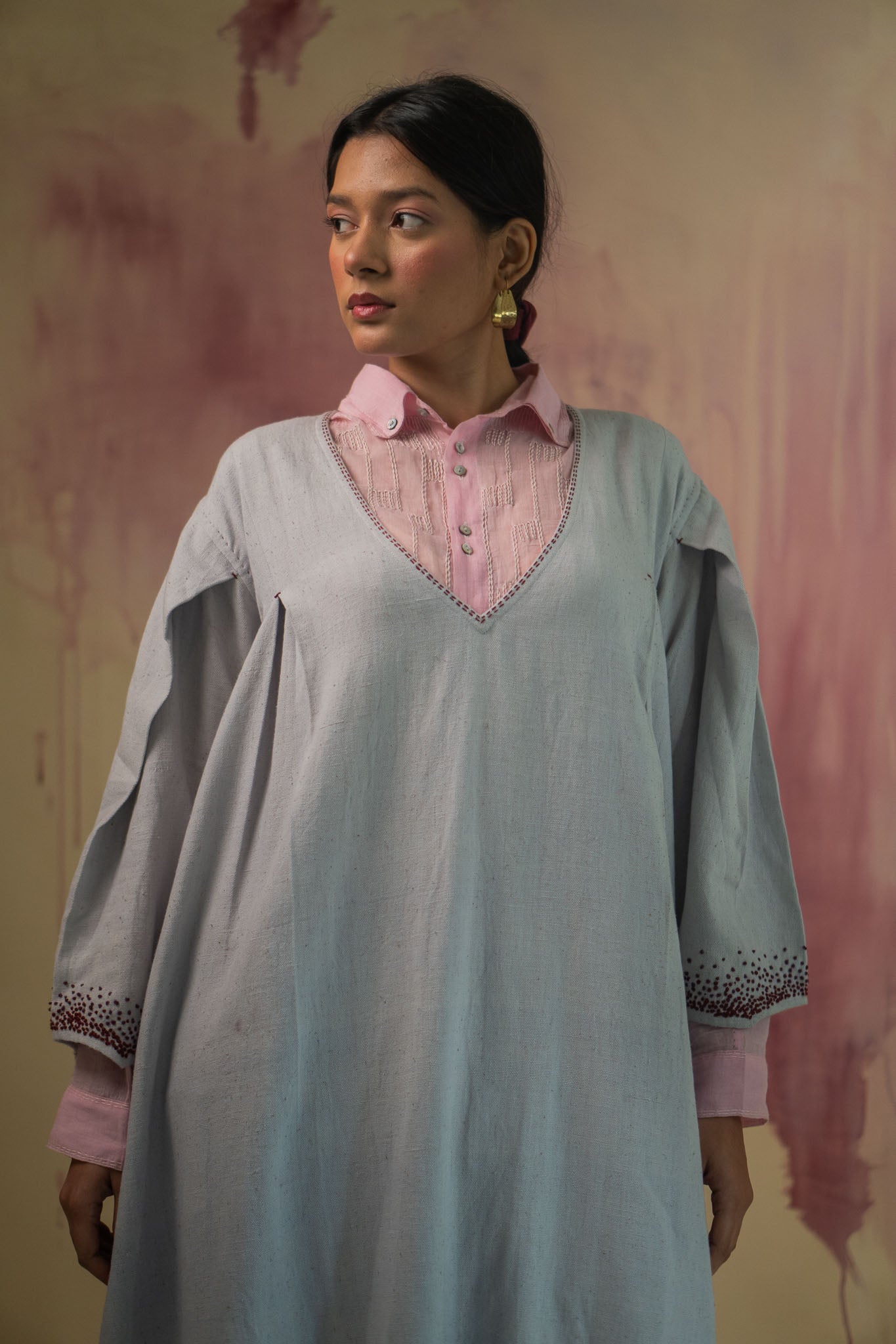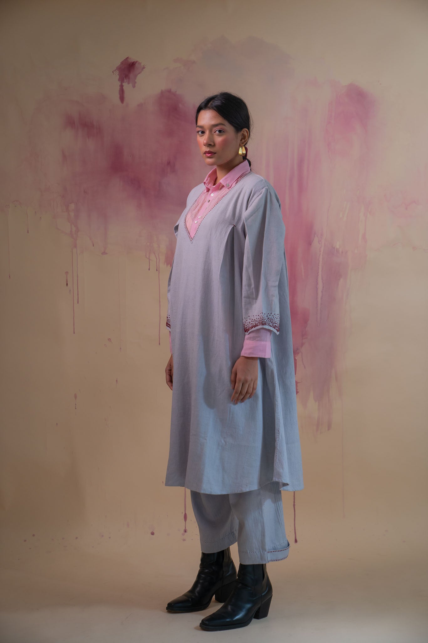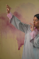 The first layer features a sheer Mul Mul pink shirt, naturally dyed from madder root & turmeric. Adorned with intricate embroidery, including French knots, Couching, and Kantha lines cascading from the shoulders to the back, details like double collars & cuffs add a distinctive touch.
