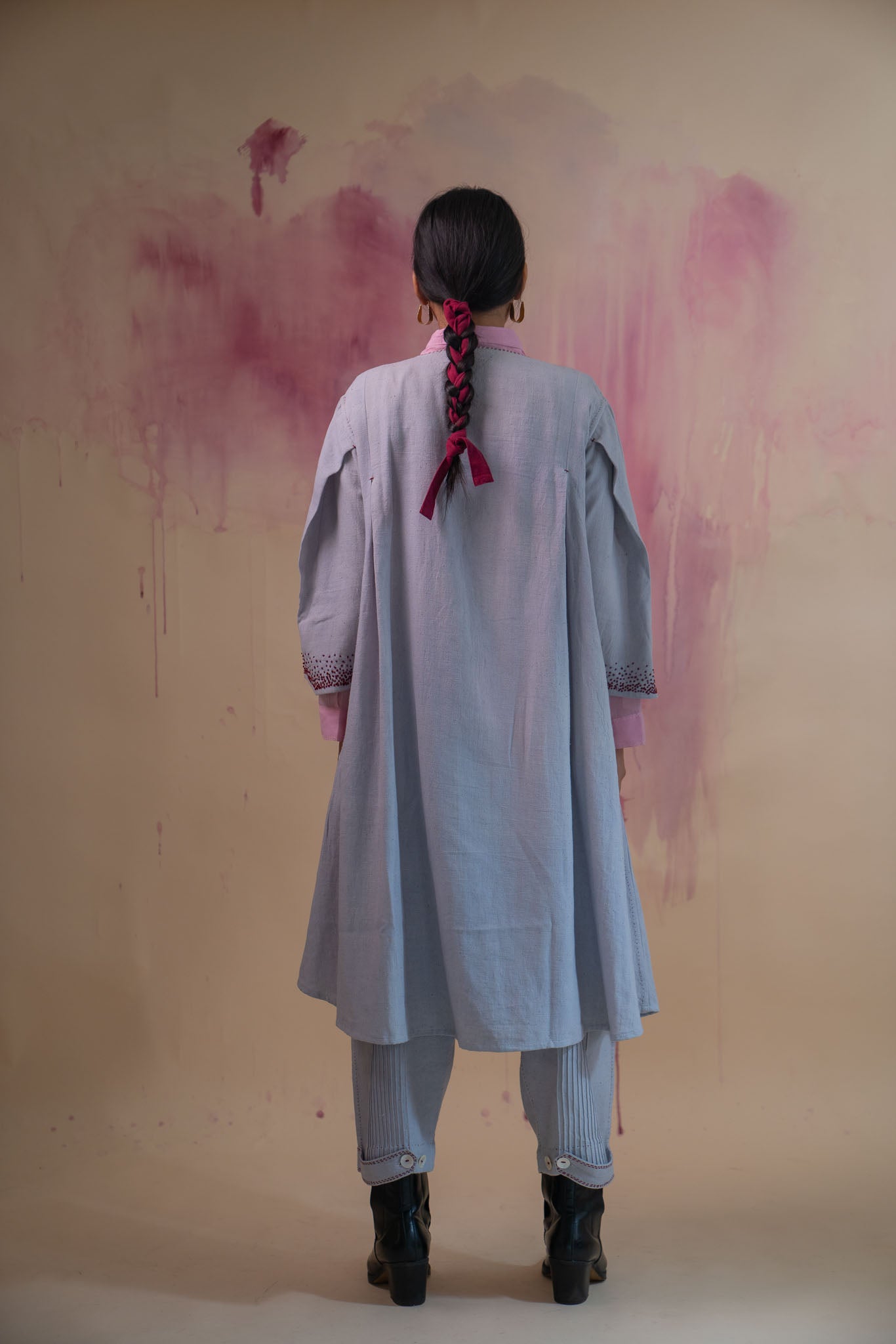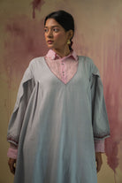 The second layer is a flared A-line grey dress naturally dyed from jaggery & iron rust. Tailored with inverted pleats and functional pockets, this dress is a perfect balance of form and utility. The deep V-neck ensures visibility of the Mul Mul shirt, crafting a beautiful palette. Pair it with our straight pants for a trans seasonal and effortless look.