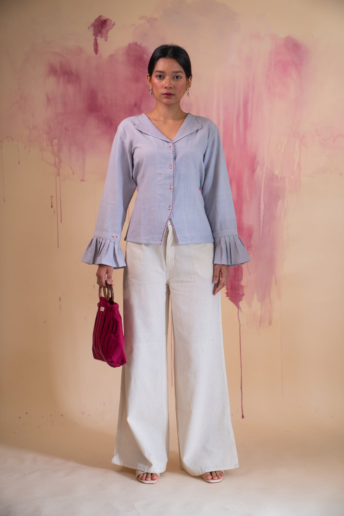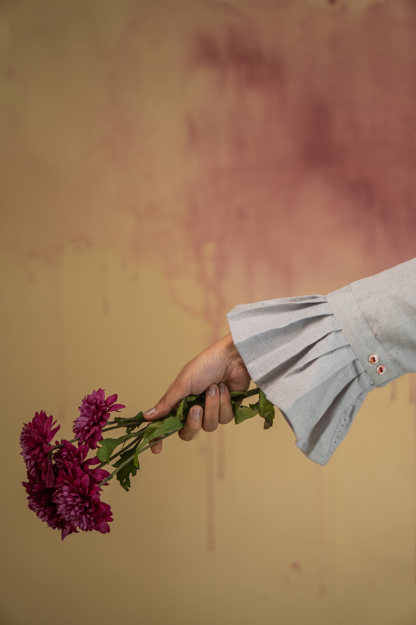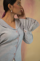 Crafted from 100% cotton fibers and natural materials. This Kala Cotton Pintuck Blouse comes in a calm and soothing colour that we call Shoreline naturally dyed from jaggery & iron rust.