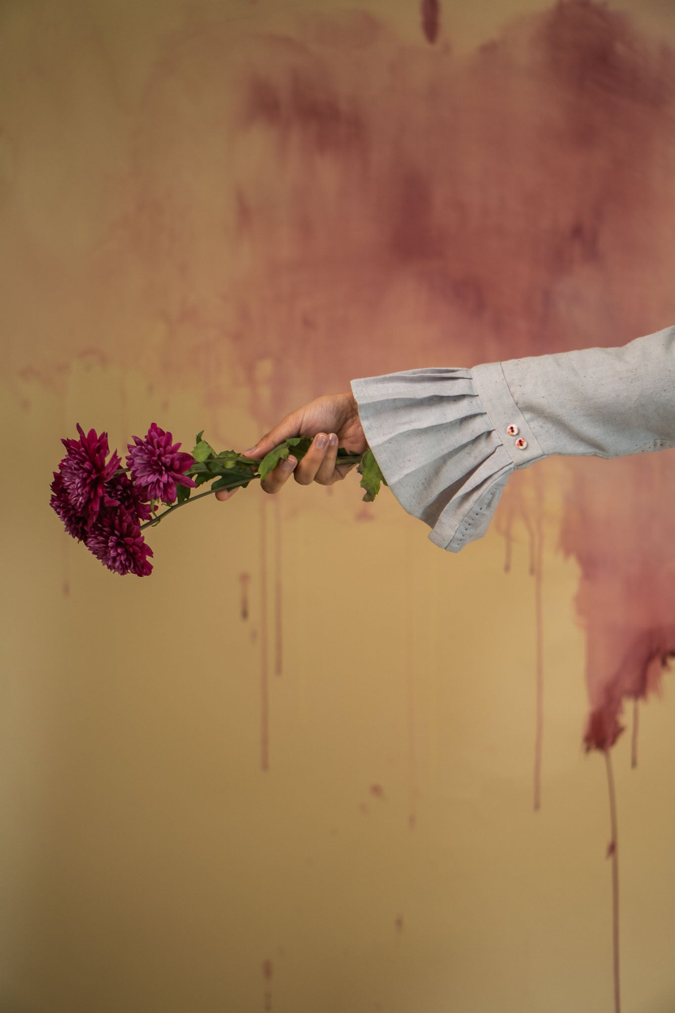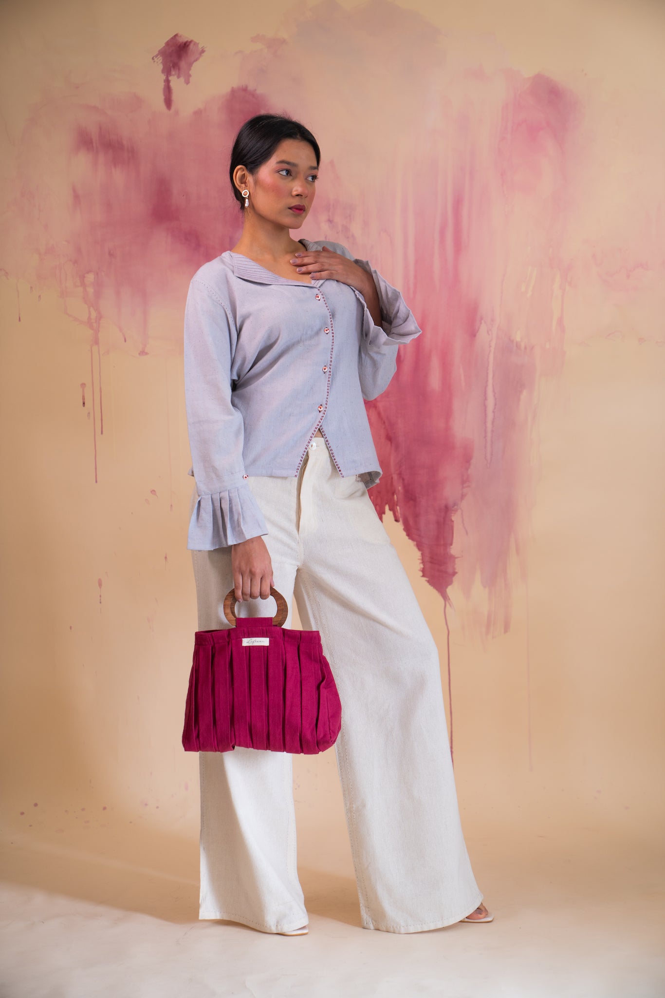 This blouse features an elegant lapel adorned with meticulous Pintuck detailing with the placket diverging gracefully as it descends. A drawstring at the back allows for cinching the waist, enhancing the overall flattering silhouette. The inverted pleat cuffs, accentuated by Mother of Pearl buttons with a coral sheen, serve as captivating details, completing the blouse with a refined touch.