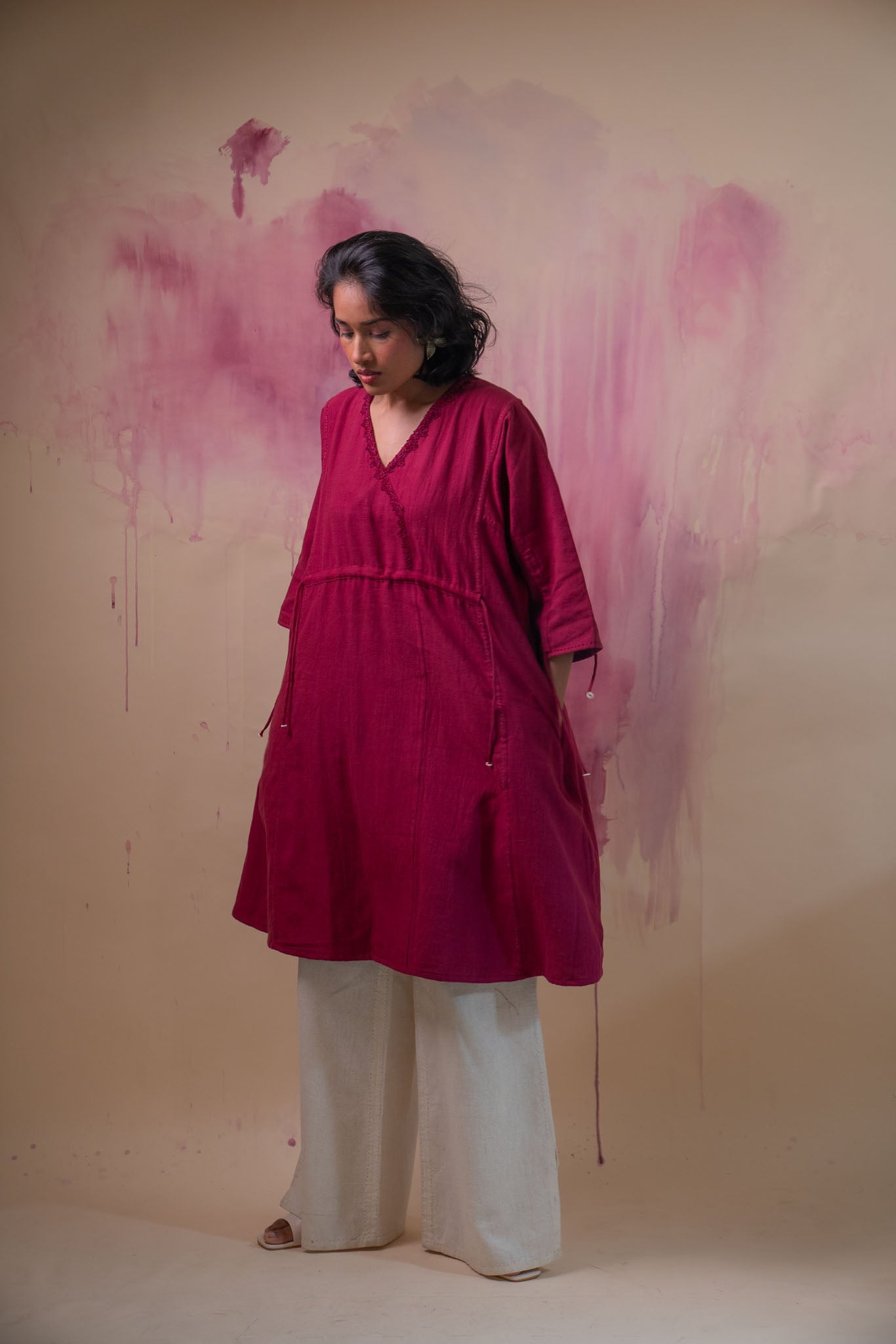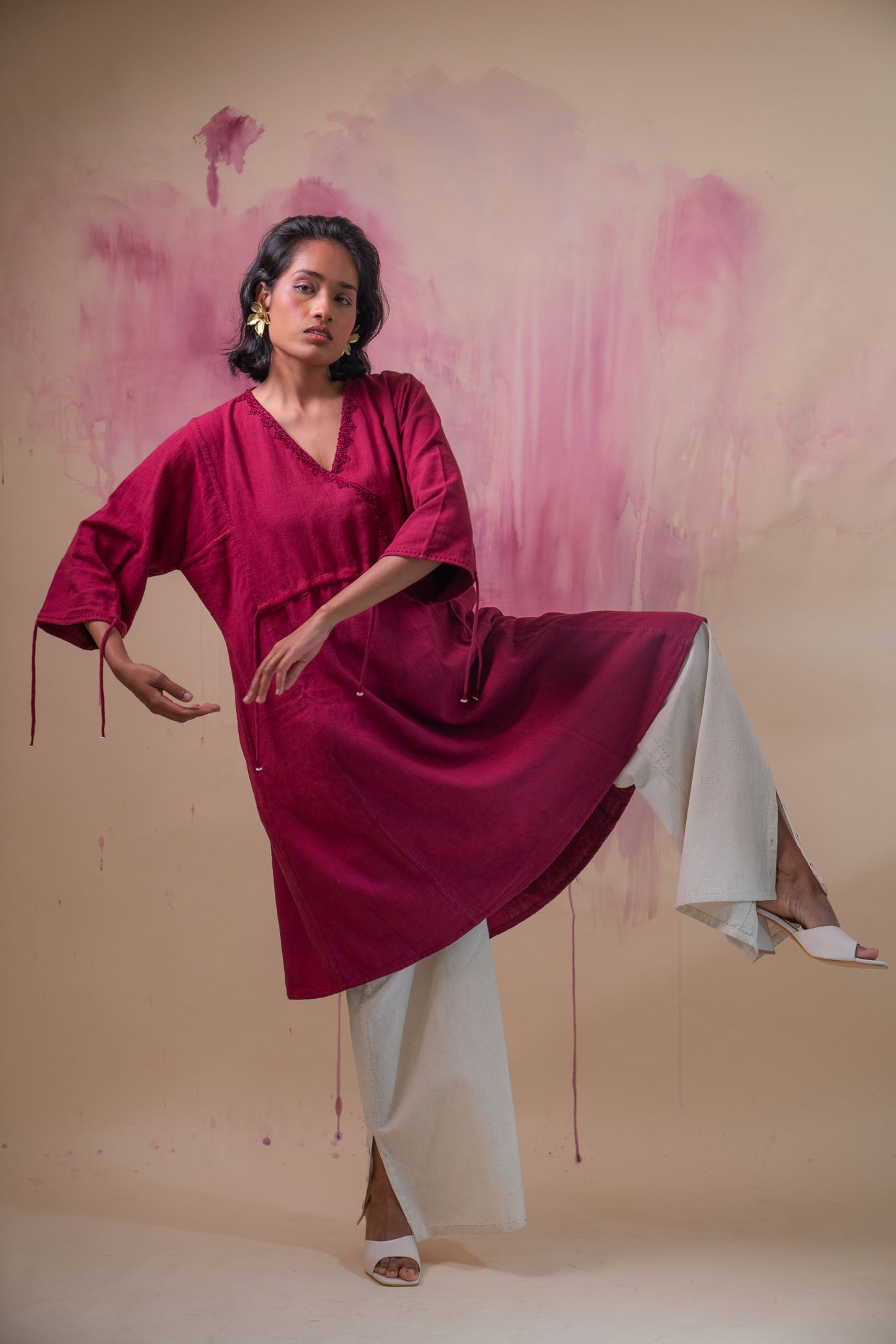 Crafted from 100% cotton fibers and natural materials. This Kala Cotton Ruched Dress & Kora Pants Set comes naturally dyed in a combination of colours that we call Fire Brick & Deckled Edge.