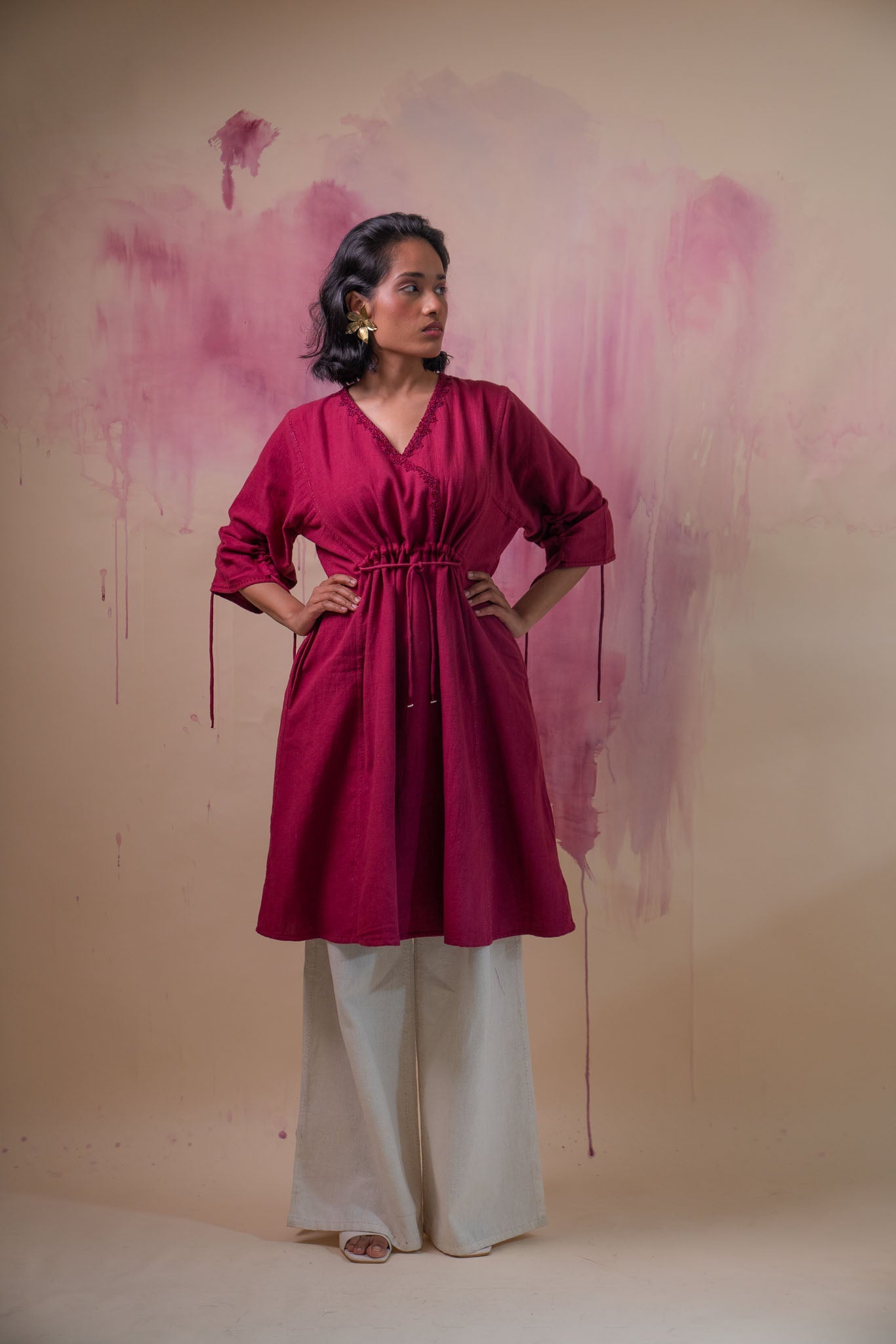 The asymmetric placket is adorned with French knots in shades of plum and maroon, creating a captivating tonal embroidery effect.