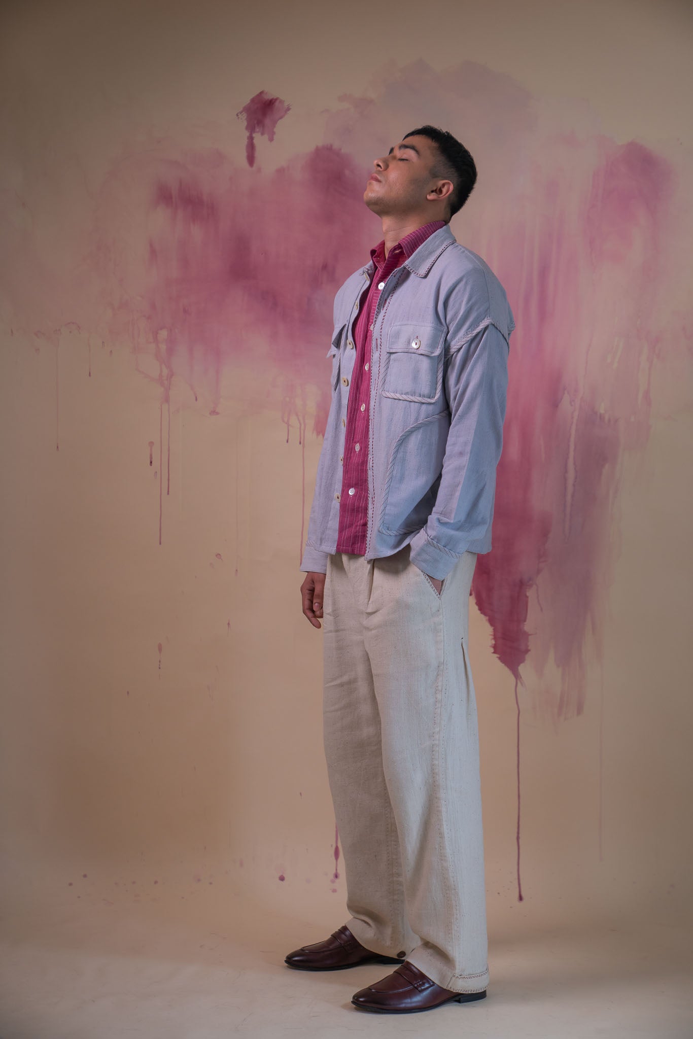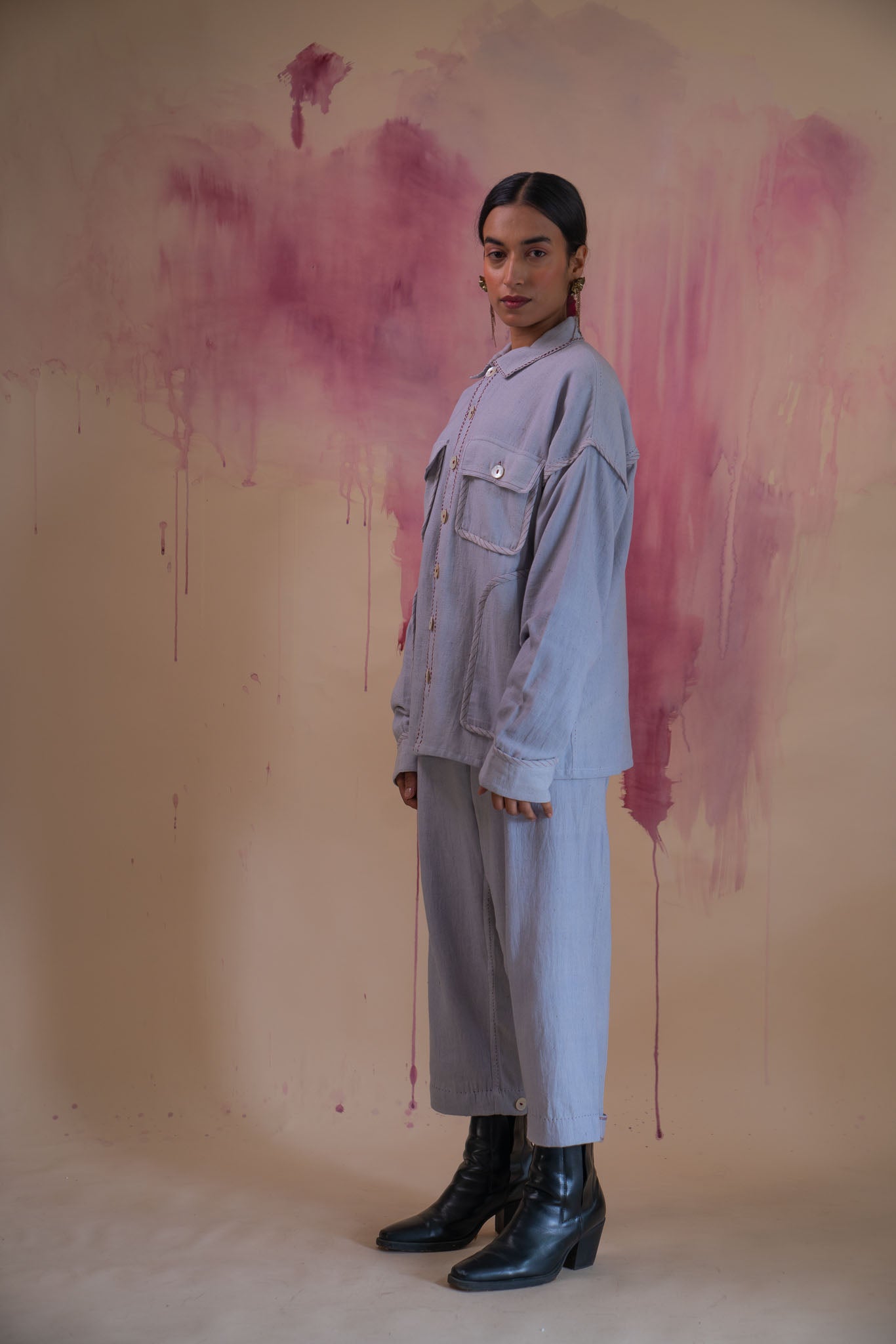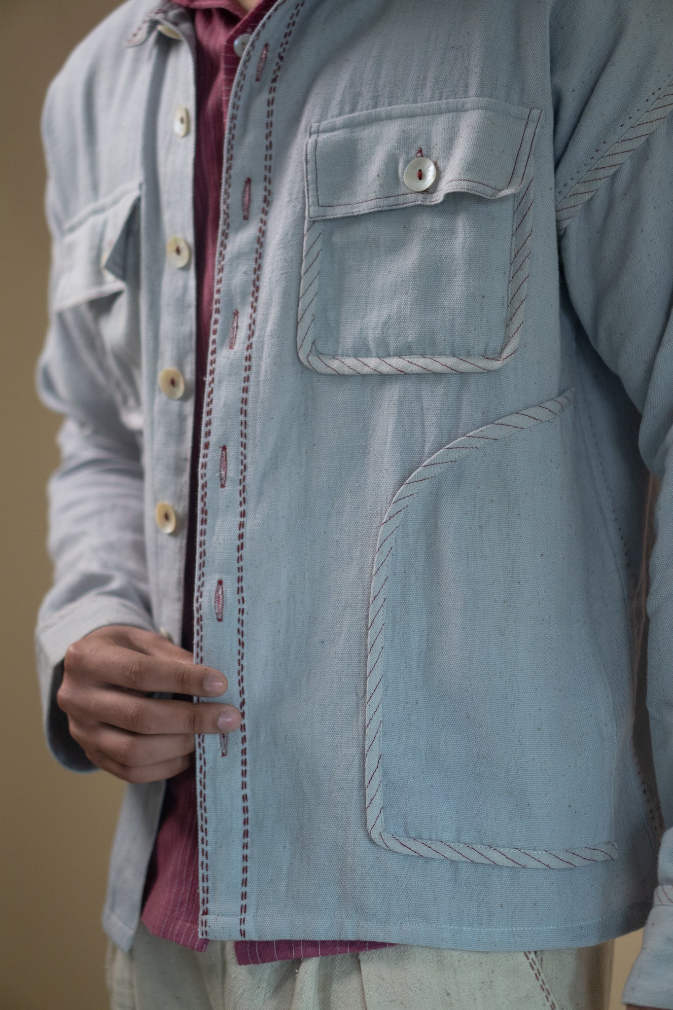 This sophisticated grey jacket features both regular and curved patch pockets, elevating its classic Bomber style. The pockets are not only stylish but also functional, providing practical storage space for your essentials.The cuffs and pockets are meticulously highlighted with a maroon bias tape finish with maroon stitch lines. Kantha stitches enhance its clean and understated features.