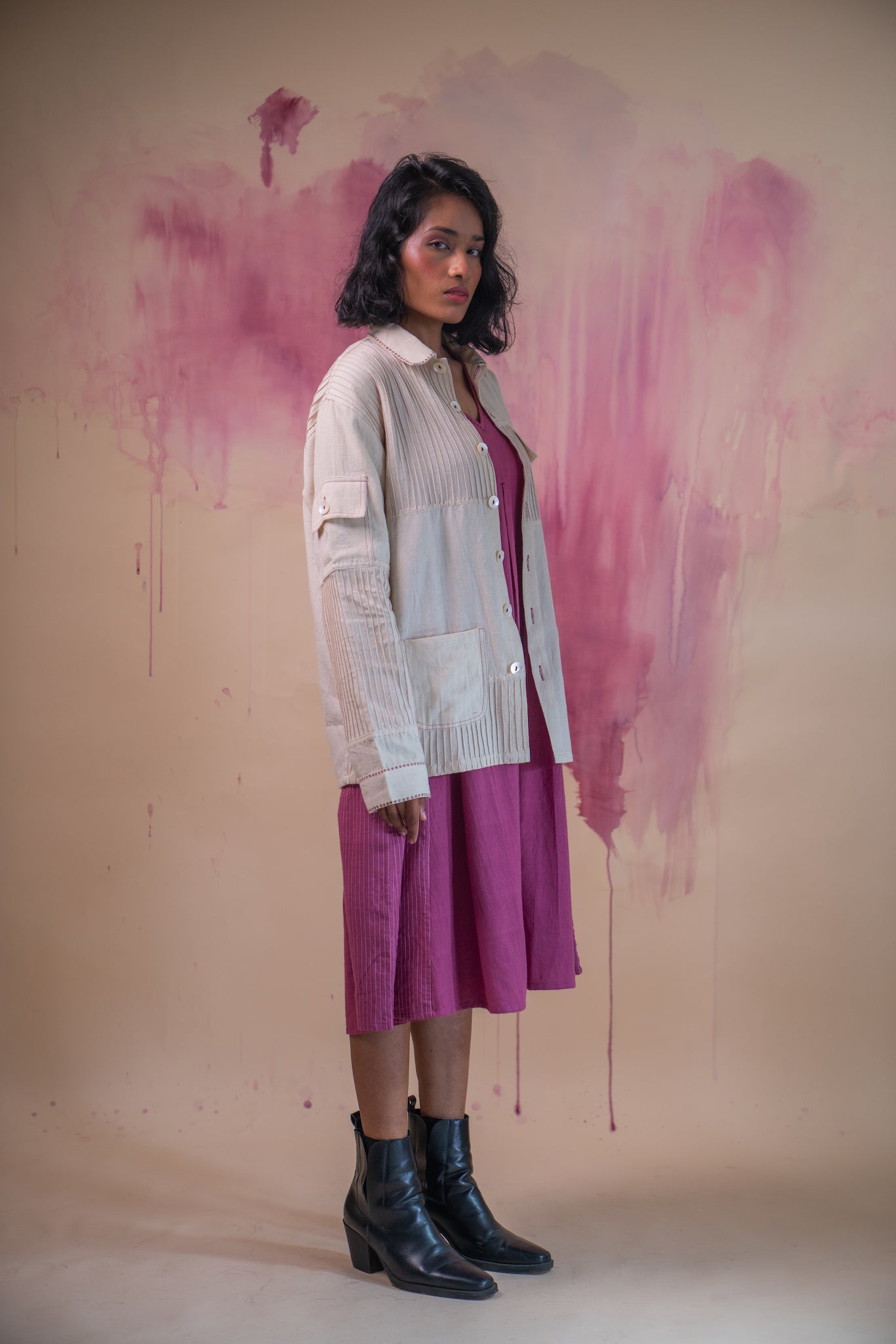 This undyed bomber is meticulously designed with a multitude of distinct panels, adorned with pintucks for a touch of detail. These pintucks not only add weight and structure but also contribute to the enduring style and durability of this piece.
