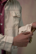 Featuring a practical pocket on the sleeve and patch pockets on the front, this jacket effortlessly transitions from smart to casual occasions. To highlight its craftsmanship, lines of Kantha on the collar and cuffs add an exquisite touch, elevating this bomber to a true statement piece.