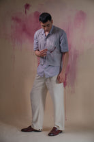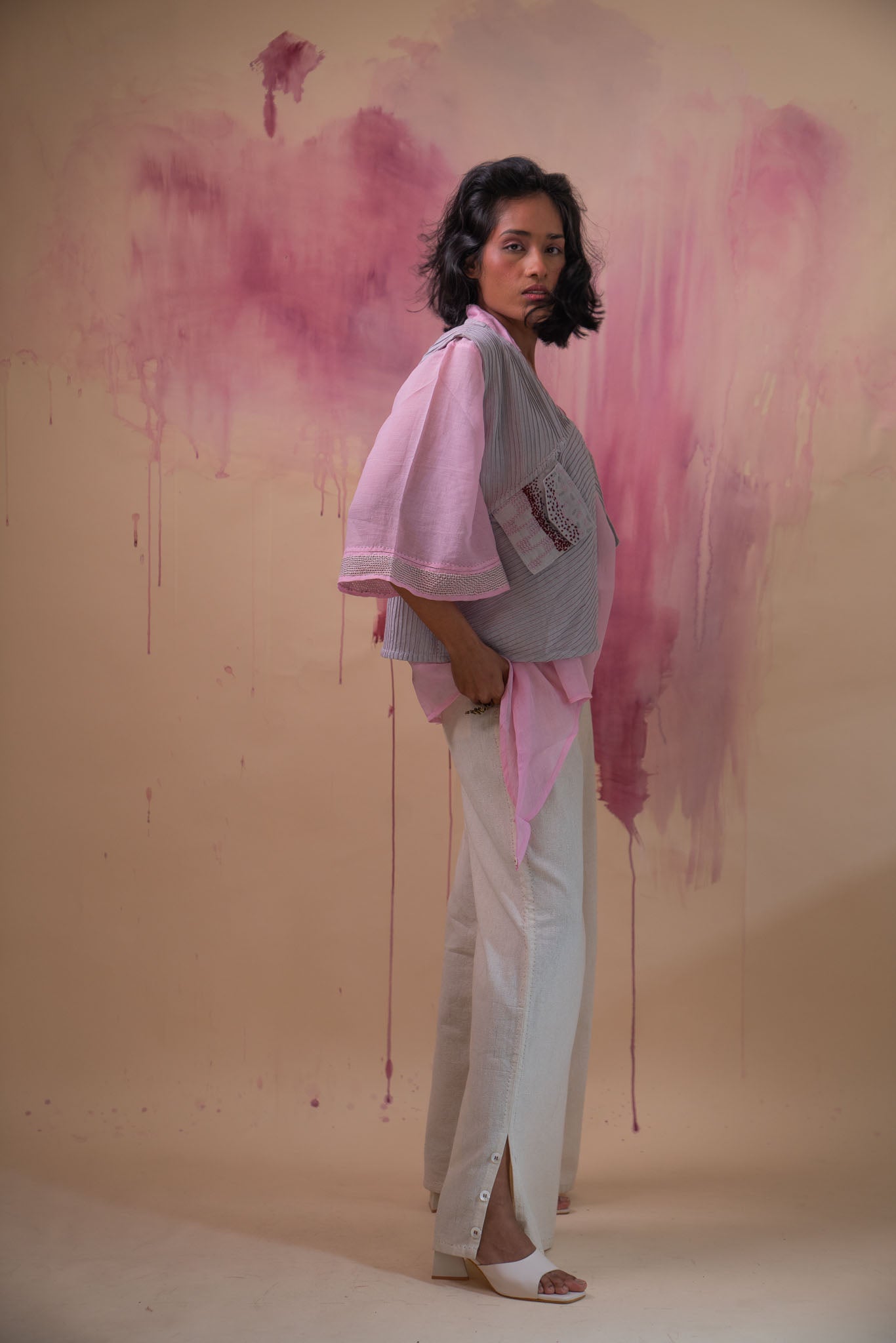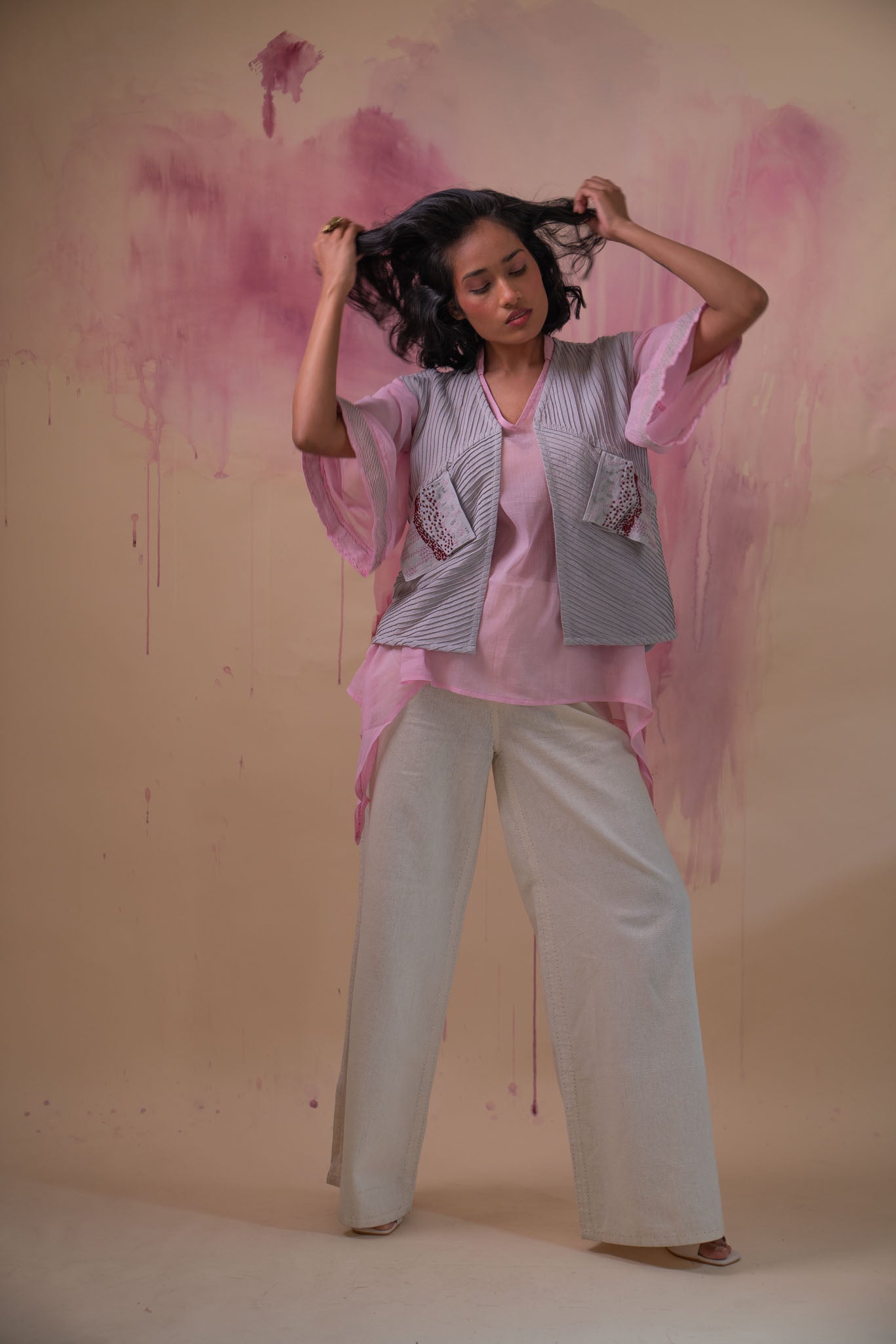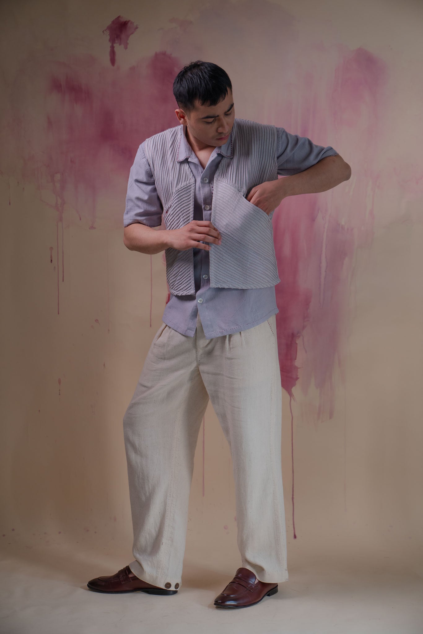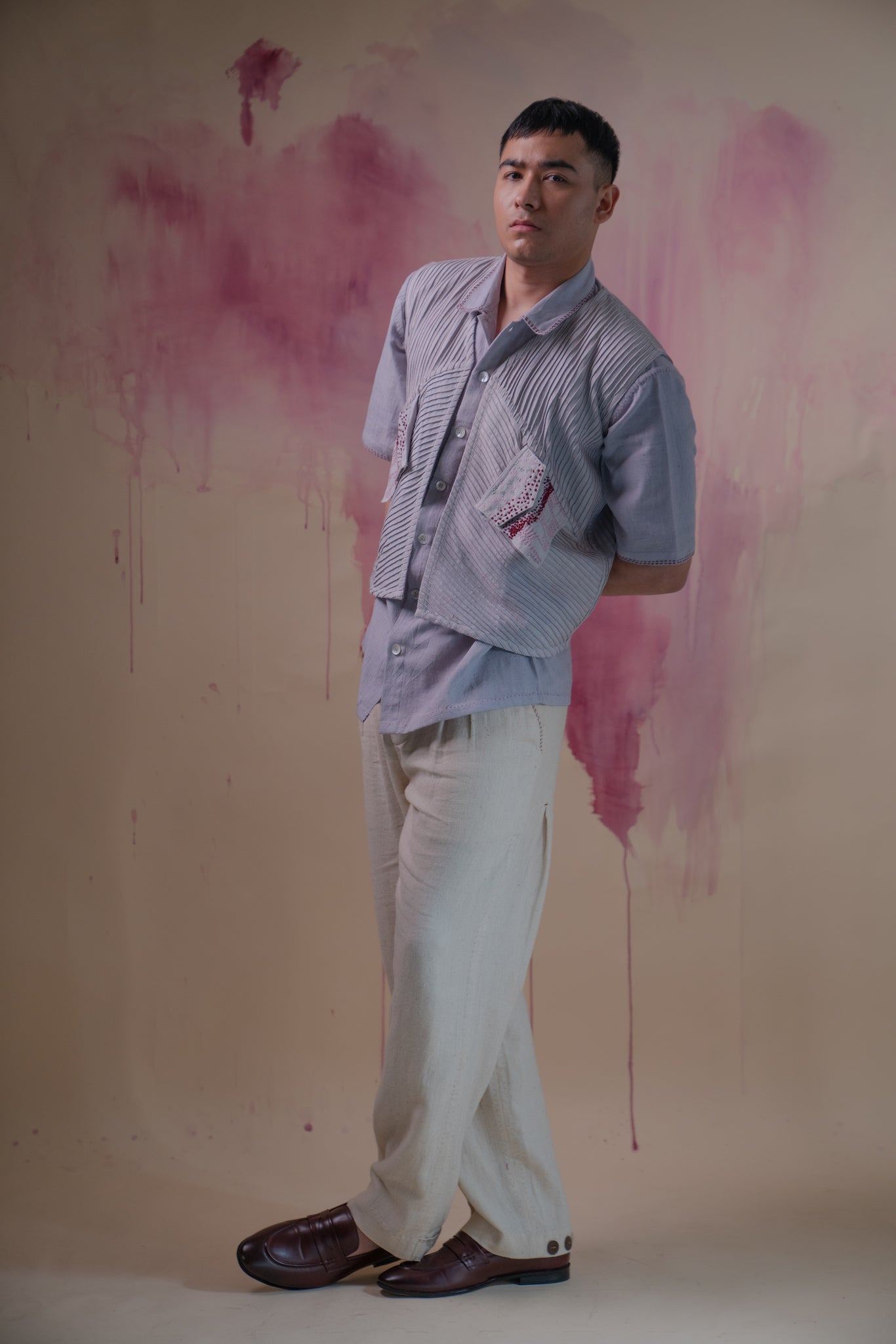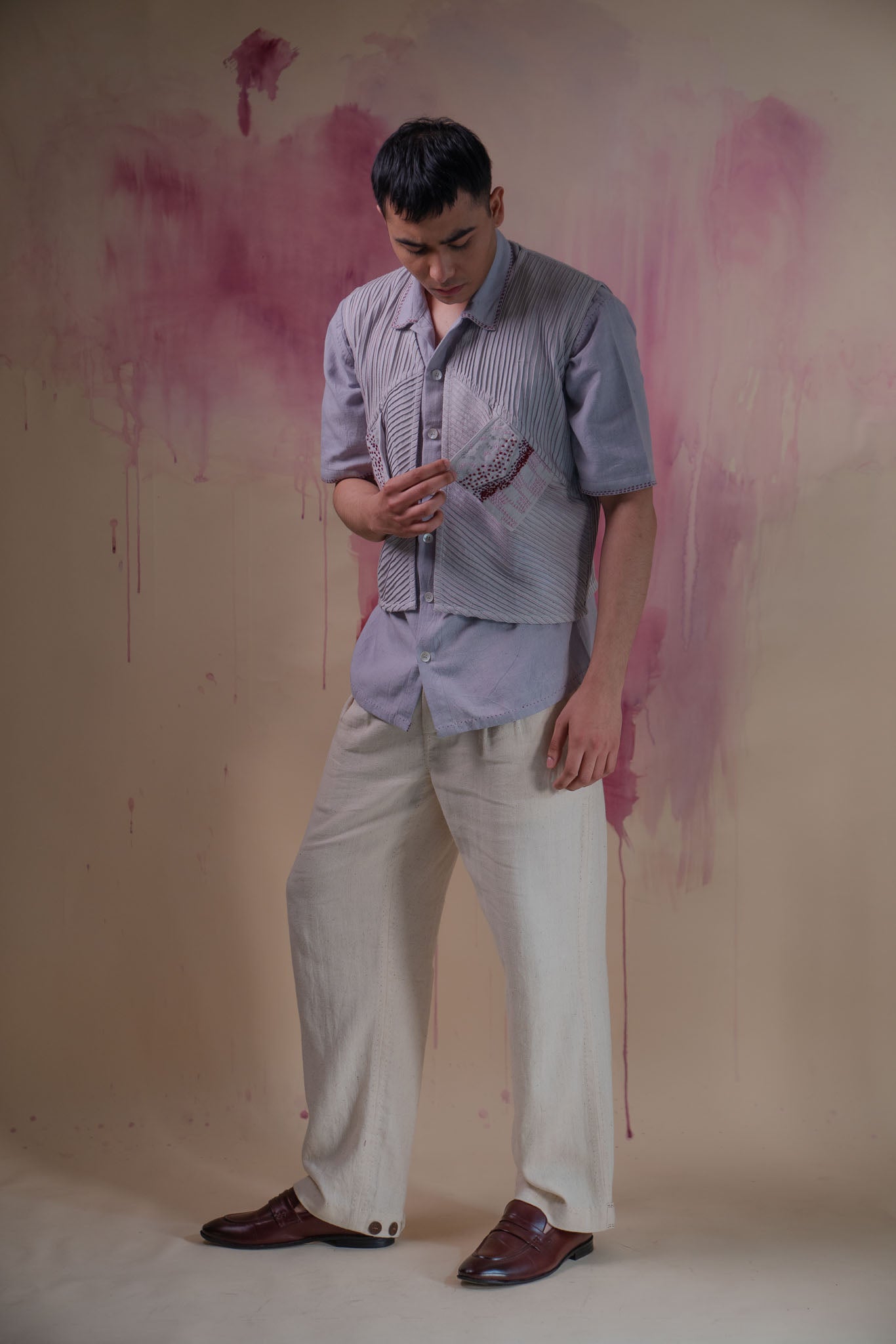 Introducing our unisex vest, featuring pintucks with maroon stitch lines throughout that create a visually dynamic and textured surface. This versatile piece includes a combination of patch and flap pockets. The flap pockets are intricately embroidered with a combination of Kantha, Couching and French knots.