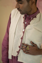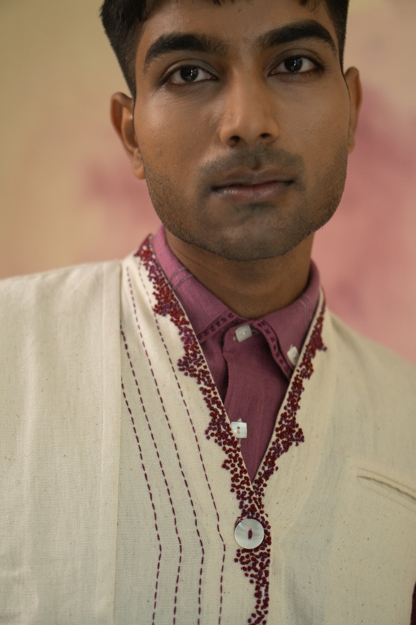 Focused on achieving a timeless yet contemporary design, this silhouette is simple yet chic - a statement piece sure to endure seasons to come. The asymmetric design comes with a soft round hem and one button closure while being adorned with stitches of Kantha, Couching and French knots.