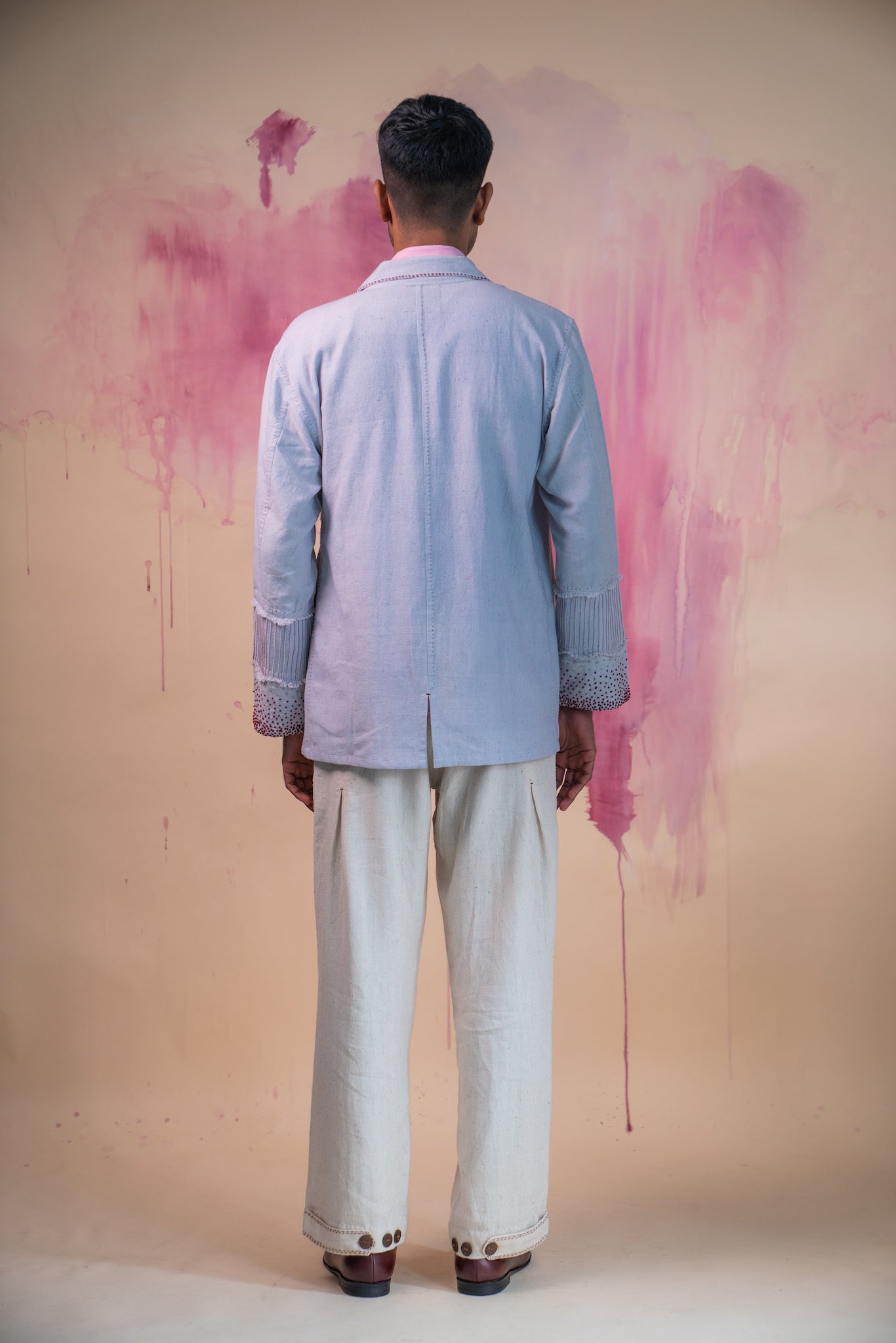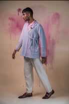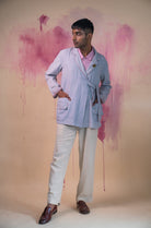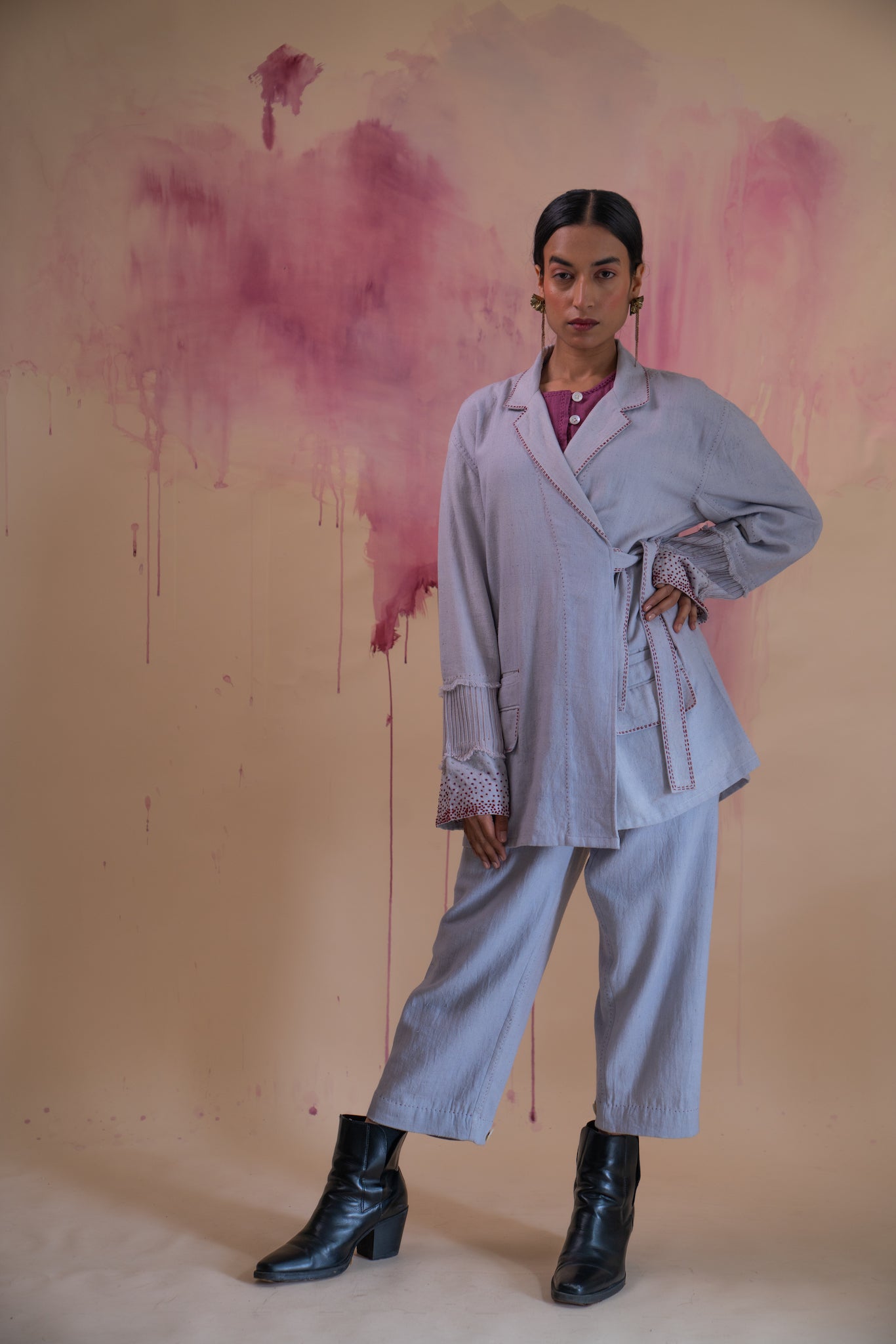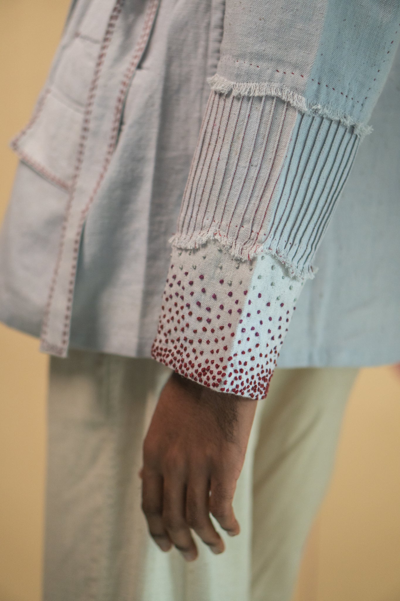 The addition of asymmetry and texture, makes our staple double breasted jacket a refined addition to your wardrobe. The sleeves feature three layers of detail – adorned with elegant French knots at the bottom, followed by meticulous pintucks, and finished with subtly frayed hems. To enhance the overall design, finishing touches of Kantha lines delicately highlight the lapel or pocket flaps. This jacket seamlessly combines classic and experimental elements, and its enclosure with a tie-up adds a touch of versatility to its design.