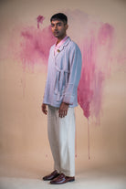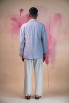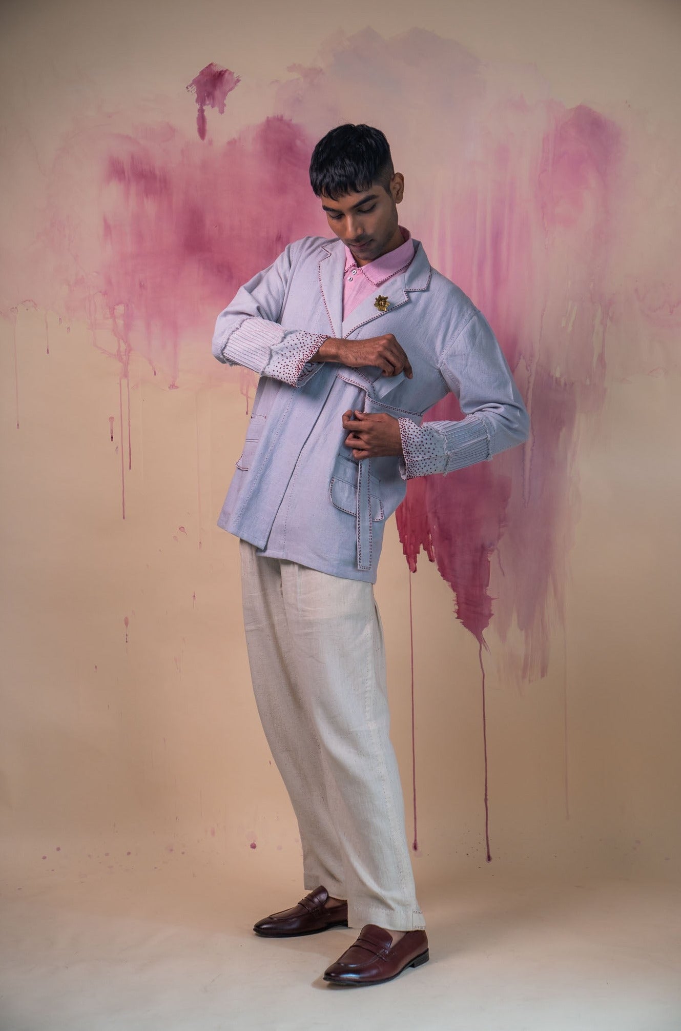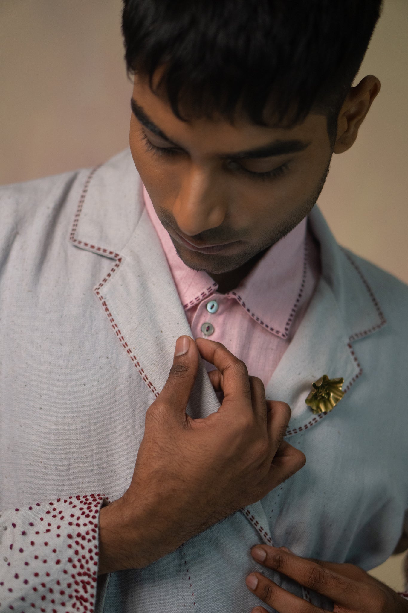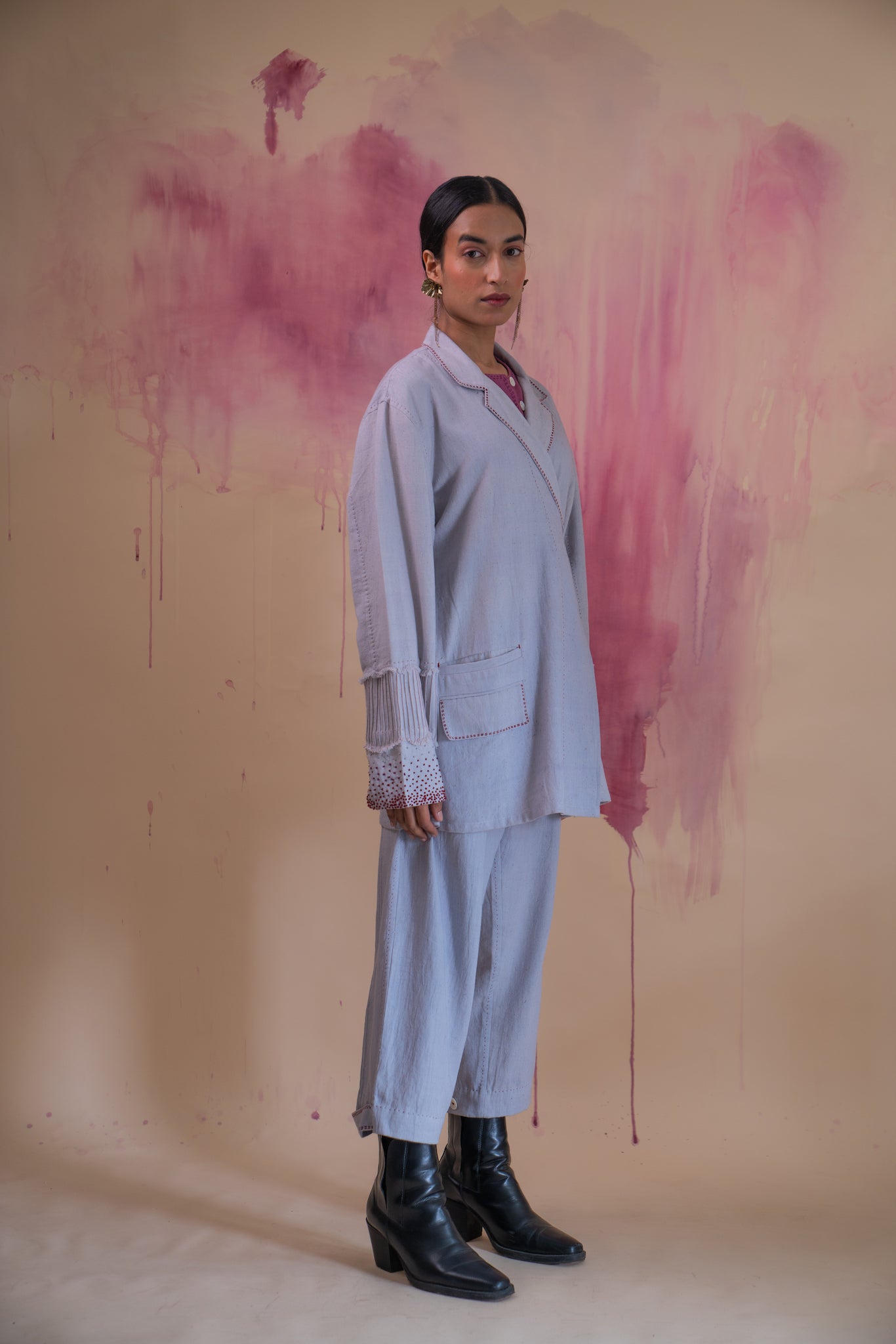 The addition of asymmetry and texture, makes our staple double breasted jacket a refined addition to your wardrobe. The sleeves feature three layers of detail – adorned with elegant French knots at the bottom, followed by meticulous pintucks, and finished with subtly frayed hems. To enhance the overall design, finishing touches of Kantha lines delicately highlight the lapel or pocket flaps. This jacket seamlessly combines classic and experimental elements, and its enclosure with a tie-up adds a touch of versatility to its design.