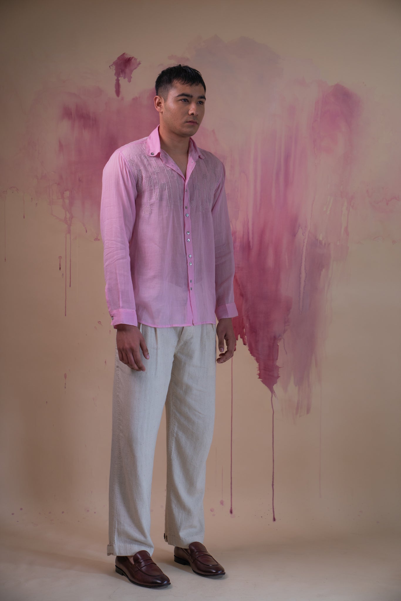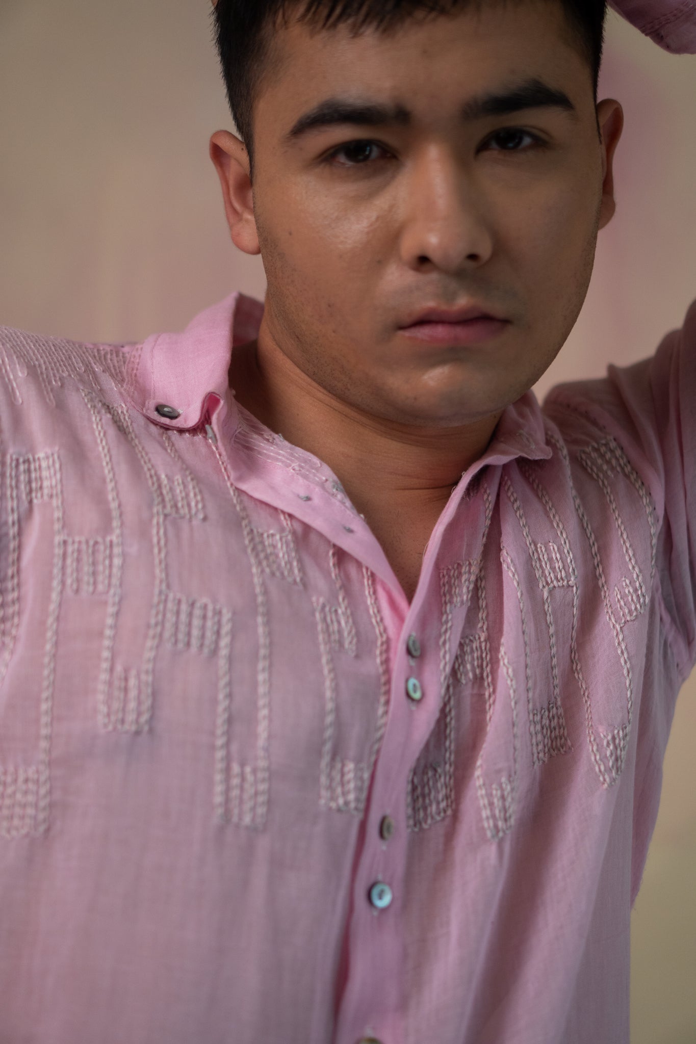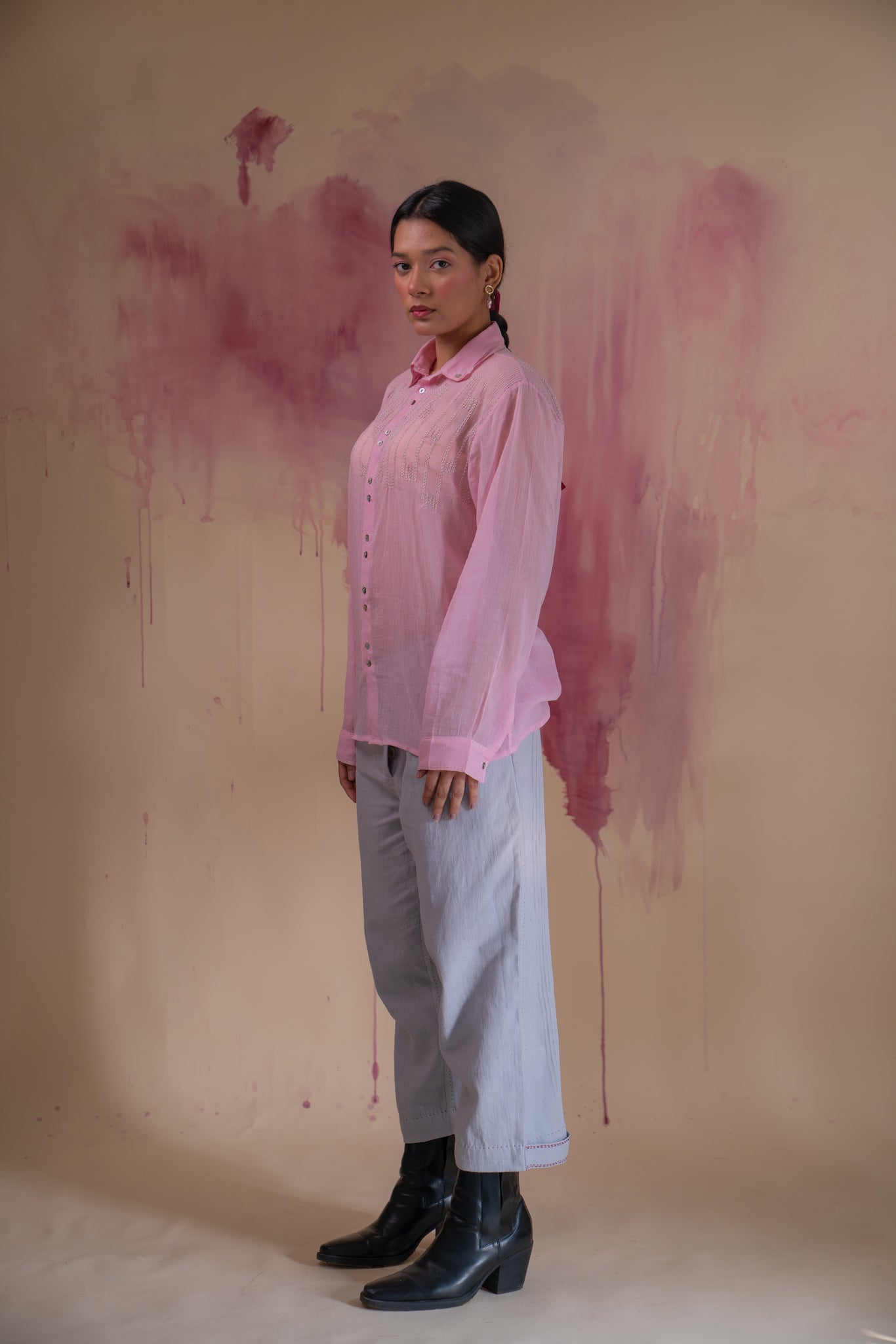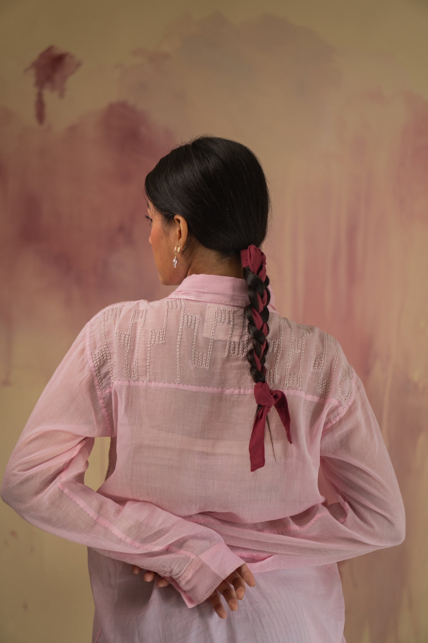 Intricate embroidery, featuring French knots, Couching, and Kantha lines, gracefully cascades from shoulders to back. Whether for a chic summer look or as a layering piece in a transeasonal ensemble, this shirt effortlessly combines style and versatility.