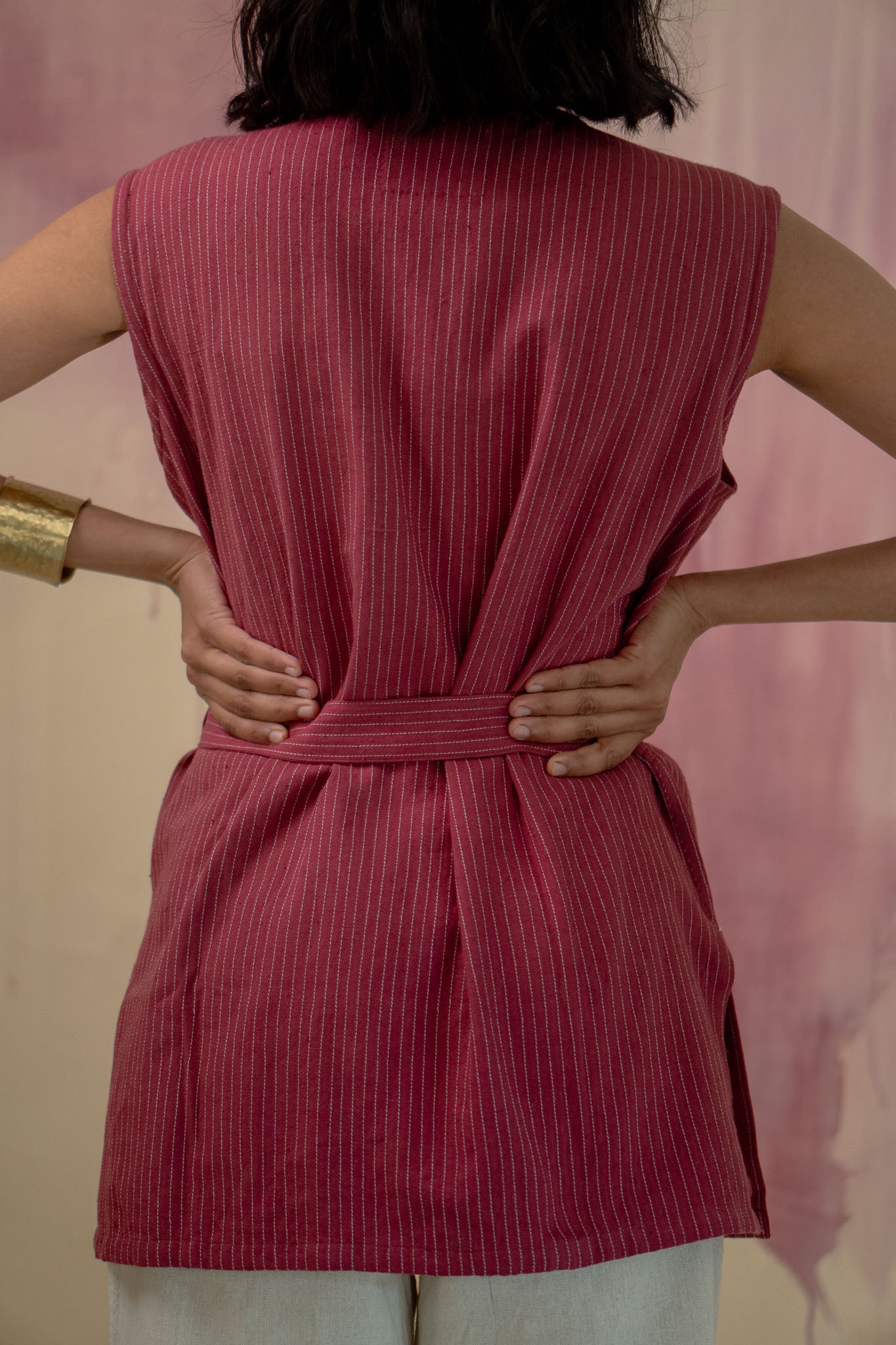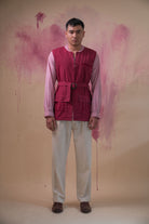 This unisex jacket comes with a round neck and patch pockets. It is adorned with stitch lines running across the surface. These lines not only create the effect of subtle stripes but also breathe life into the otherwise plain fabric, adding depth and texture.