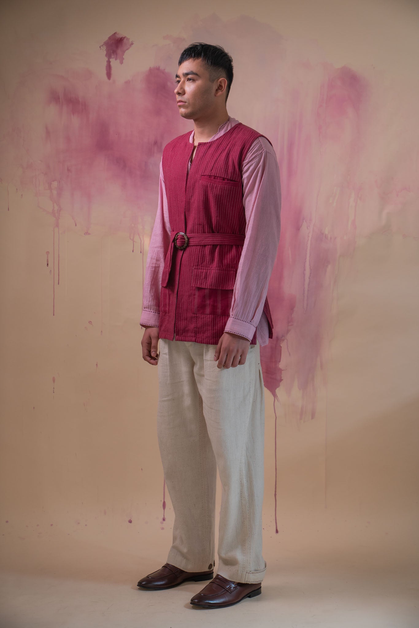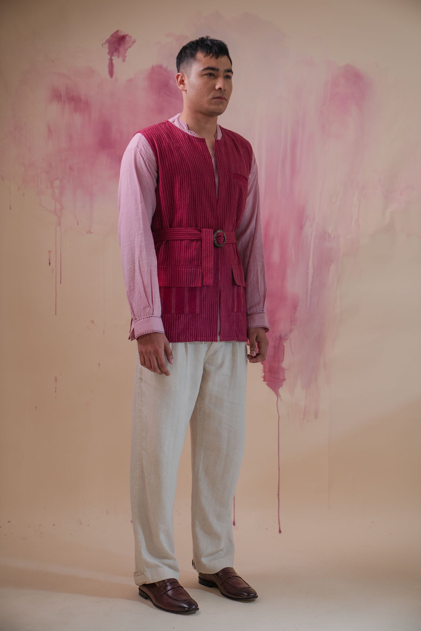 These straight pants come with clean cut away and welt pockets along with inverted pleats in the front. The pockets are highlighted with stitches of Kantha, a form of Indian hand embroidery. To further enhance the texture, the back features pintucks & a back pleat. Practical touches include side and back pockets,adjustable loops at the hem, button-fly fastening and belt loops.