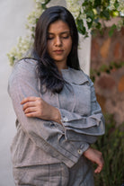 The Sonder Pleated Sleeve Blouse comes in an interesting twill weave of black and white has been naturally dyed using Myrobalan and Iron.