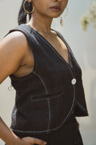The Sonder Waistcoat comes with a soft round hem and drawstrings at the back while being adorned with clean stitch lines along the panels. The panels are adorned with stitch lines and Kantha, a form of Indian hand embroidery.