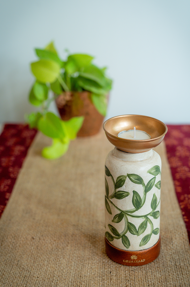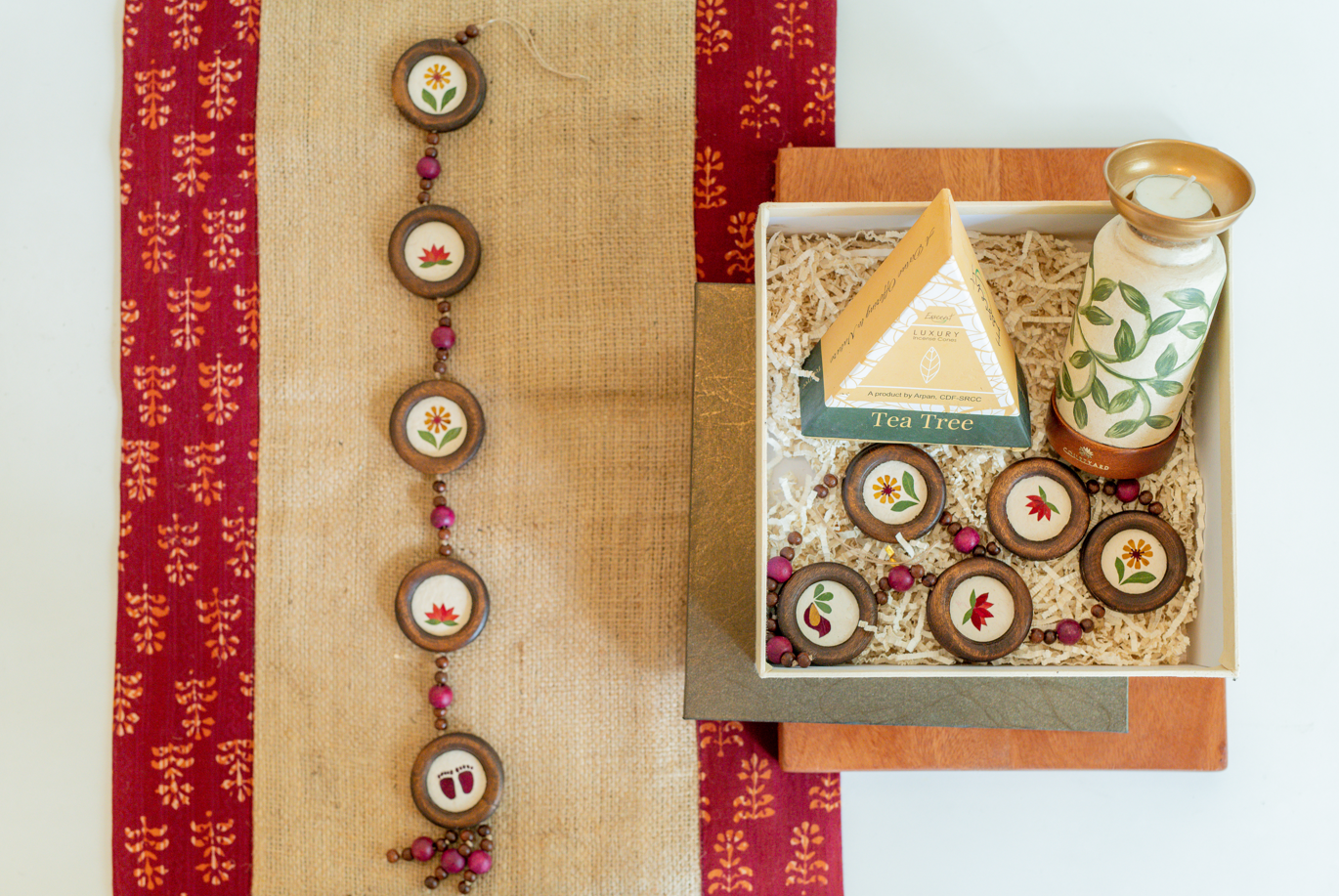 This curated ensemble weaves artistry, nature, and mystique into your Diwali celebrations. Elevate ambiance with Gulfam Tealight Holder's allure, meticulously hand-crafted from metal, while embracing the Wooden Latkan - a harmonious tribute to nature's charm. Complete the ensemble with the enigmatic touch of the Incense Cone for added intrigue.
