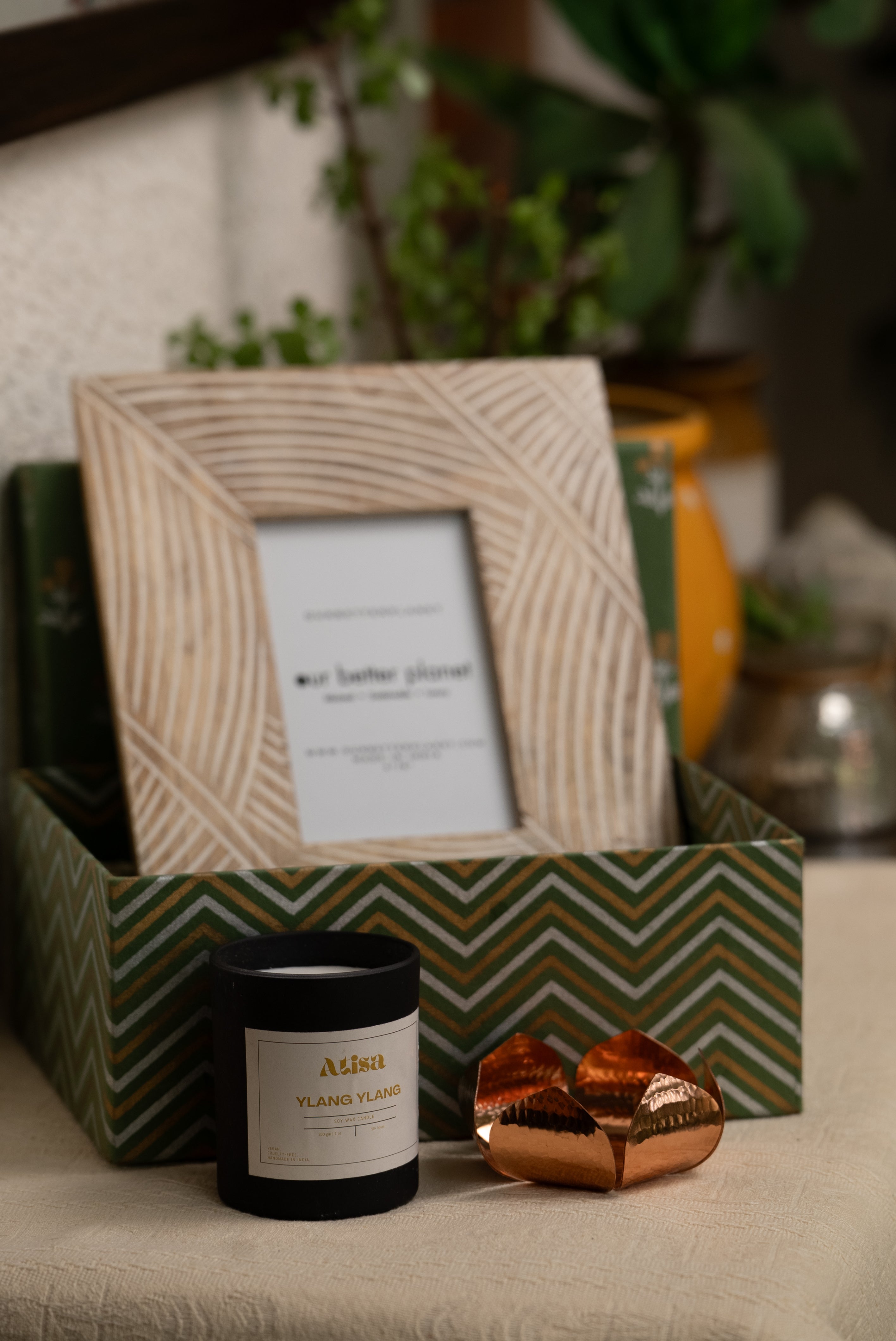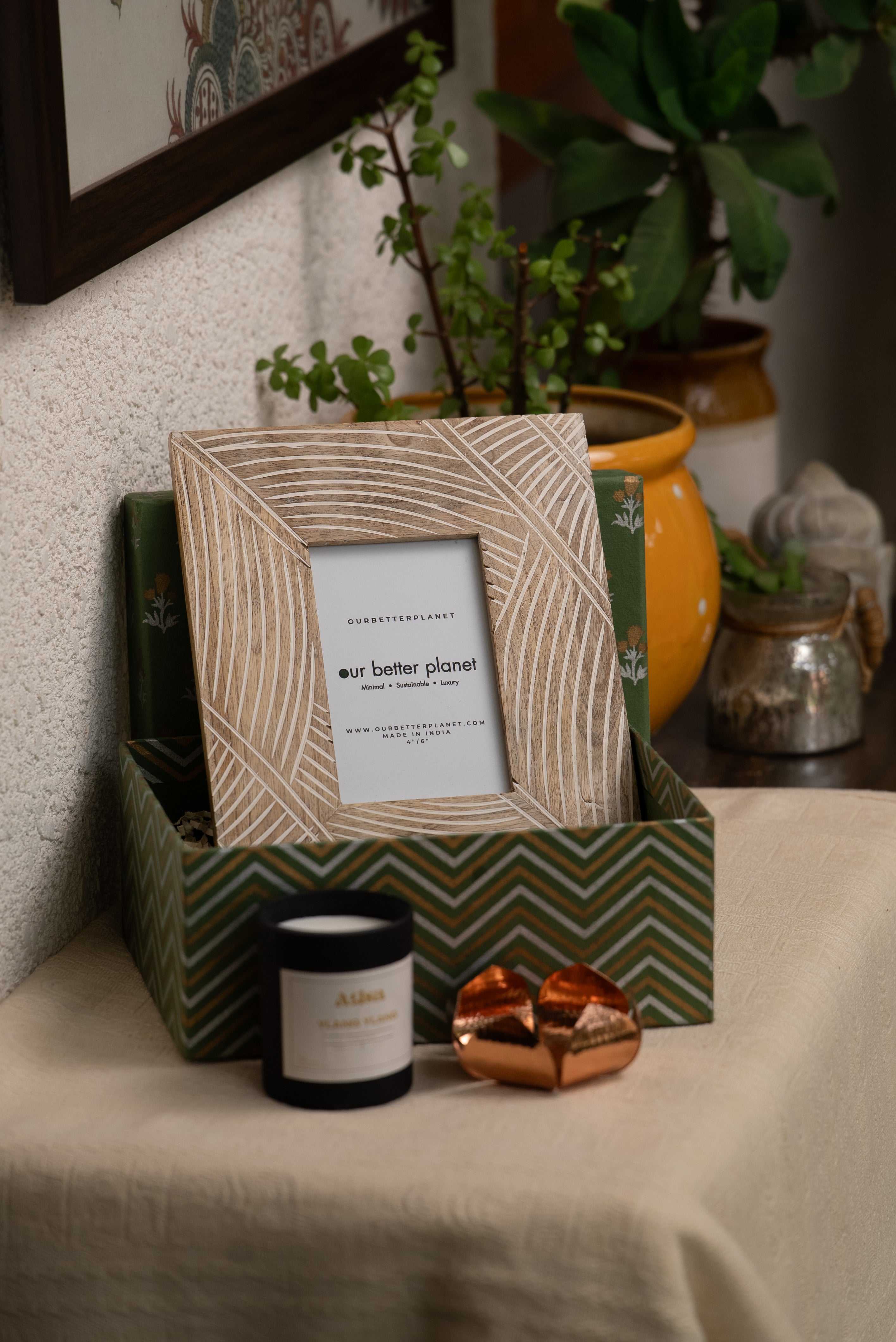 Infuse your space with warmth and charm with OurBetterPlanet's Timeless Glow Gift Set. This elegant hamper includes: