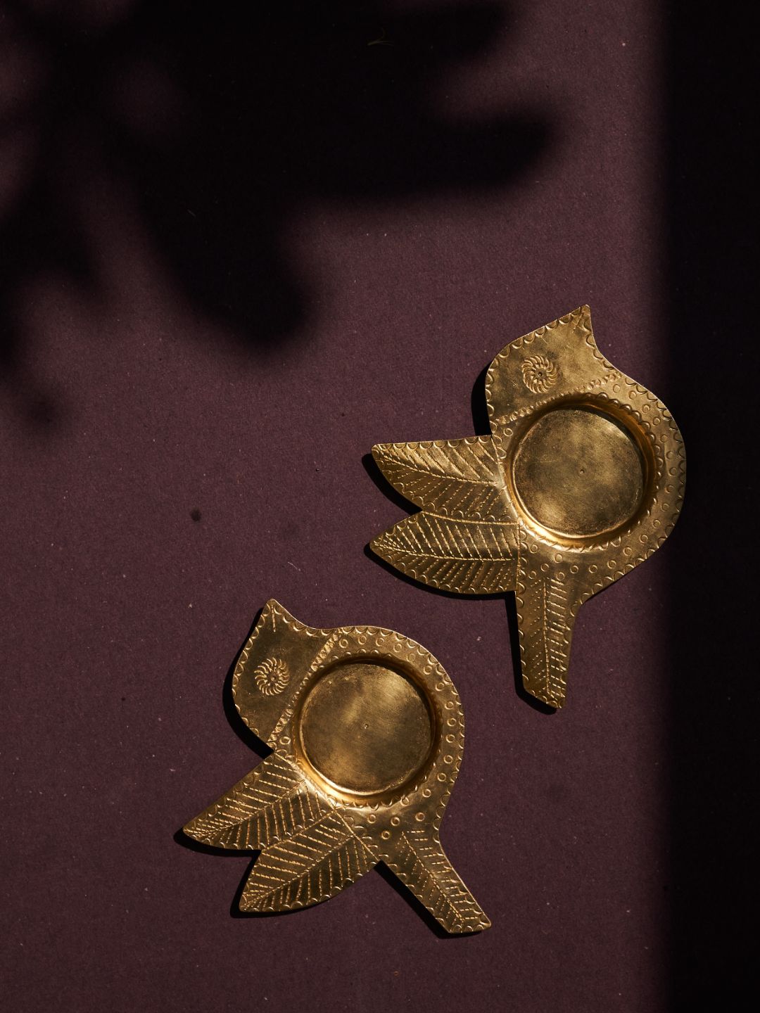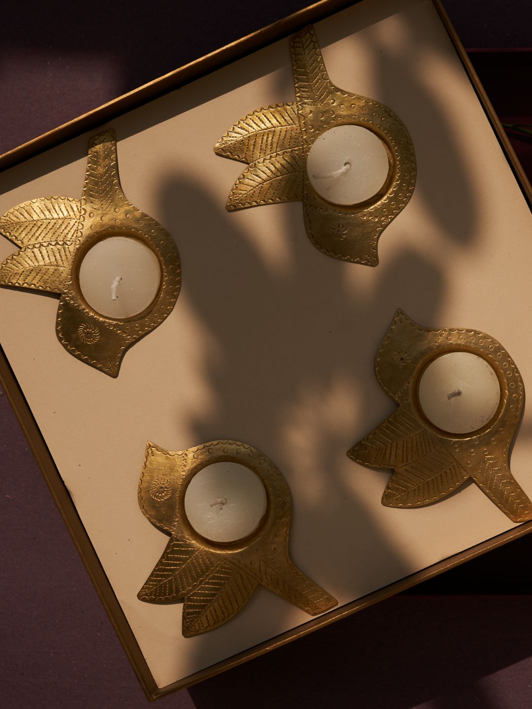 Recycled and hand stamped brass tea light holders with our TICP playing cards inspired by Rajasthani Miniature Art - in a gift box to brings a sense of calm, happiness, prosperity, and abundance in every household.