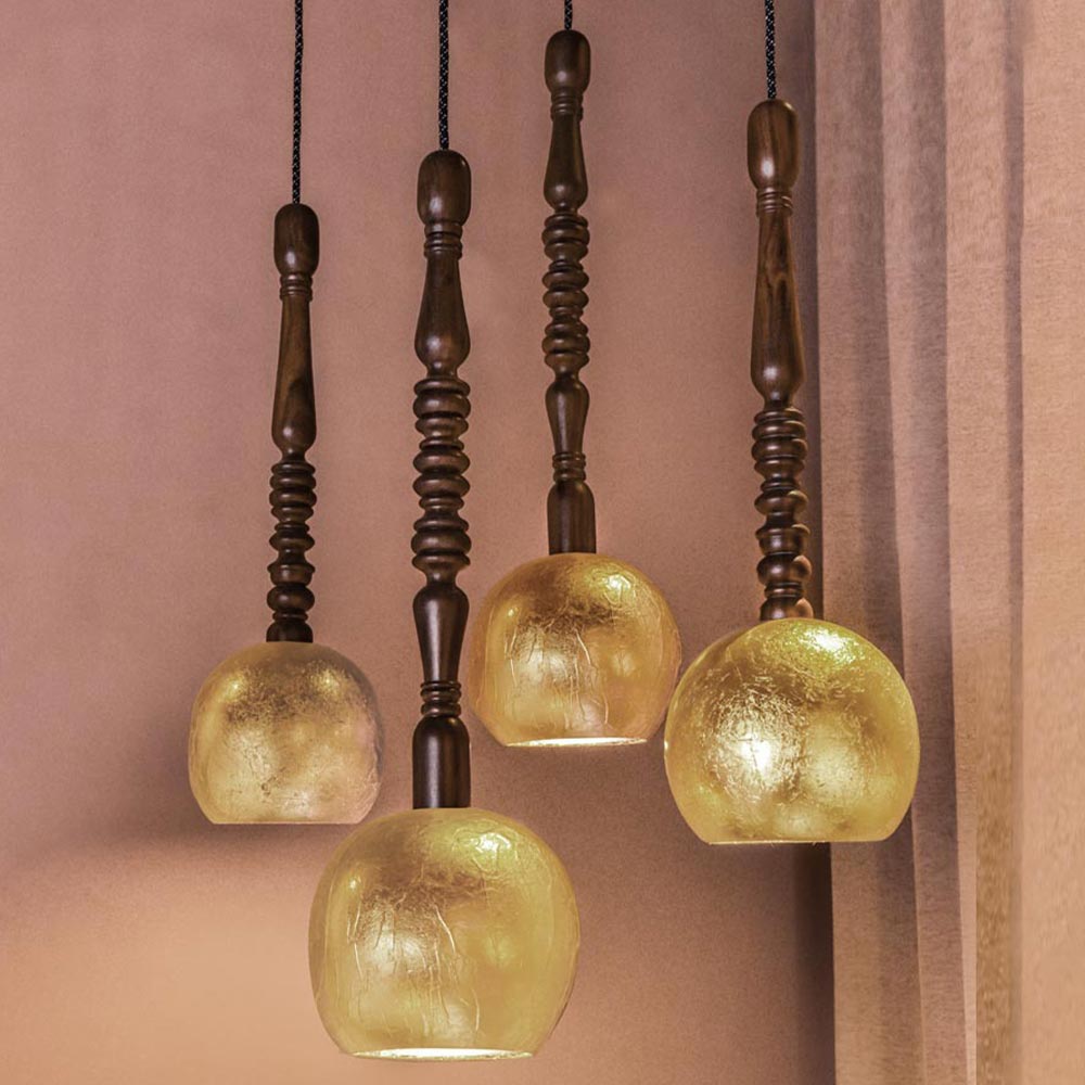 Bubble pendant is a creation of detailed wood turning and fine use of gold leafing.