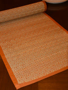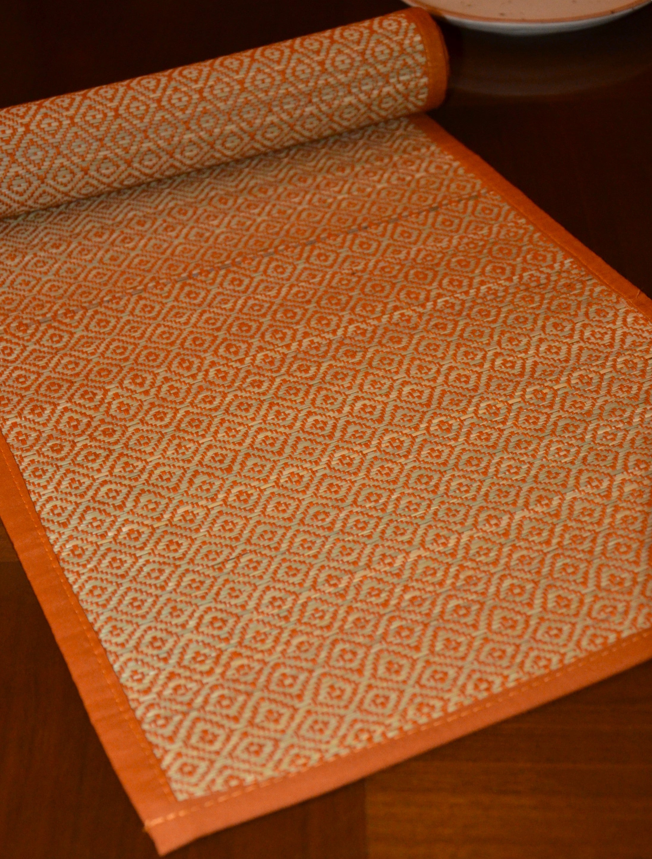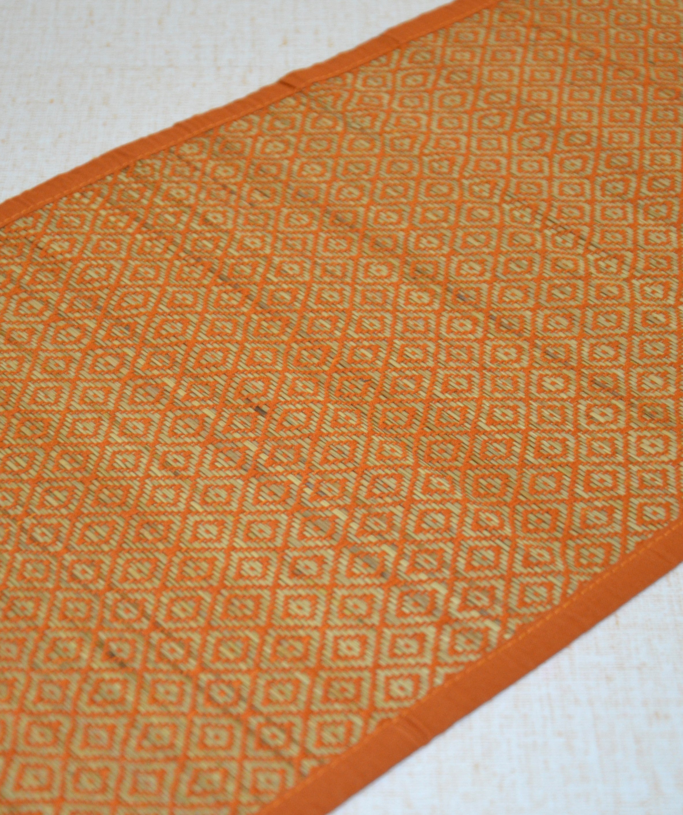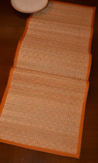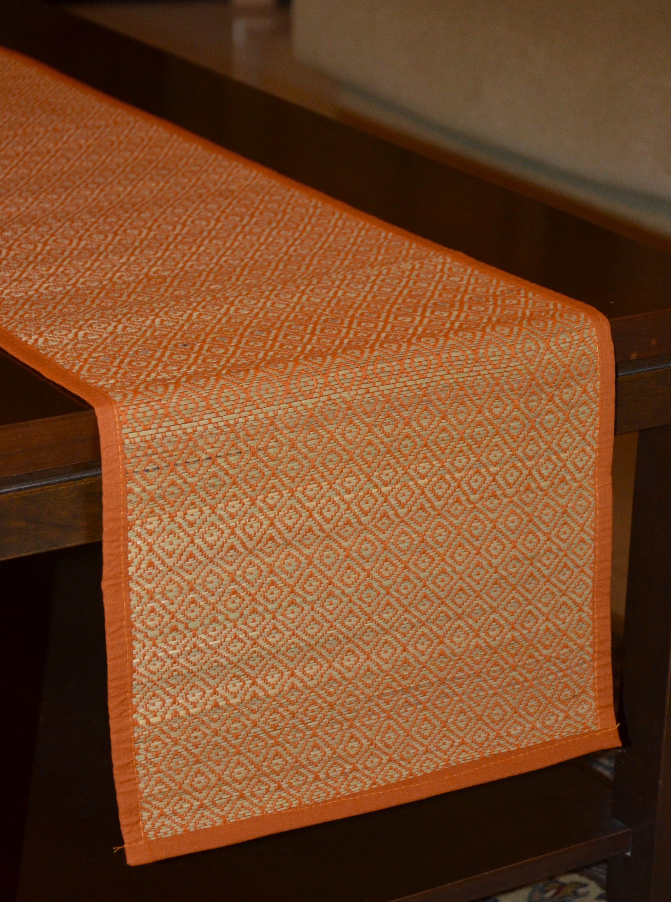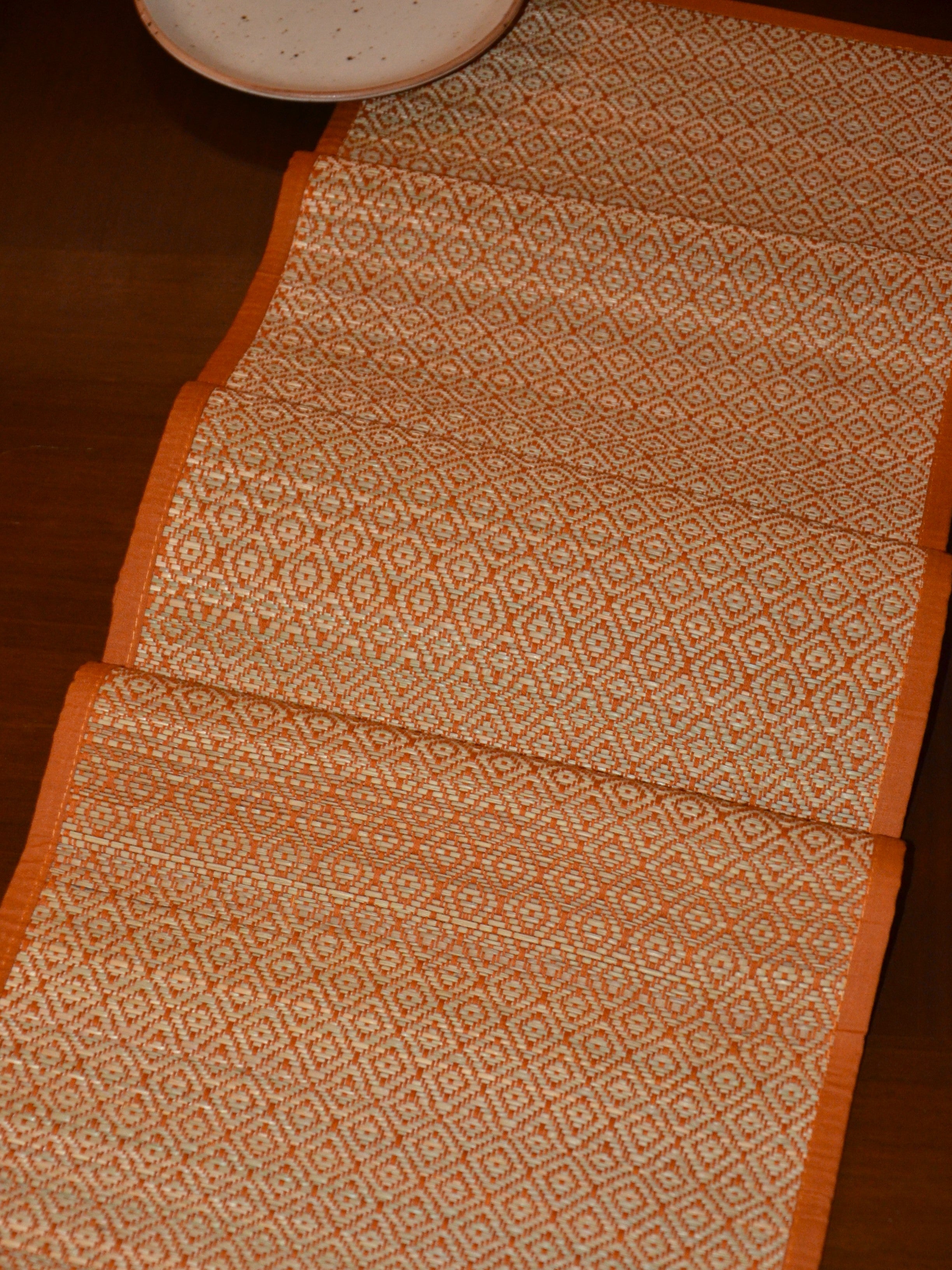 Eco-friendly and natural table runner handcrafted of Madurkathi reed and beautifully interwoven with thread in a diamond pattern.