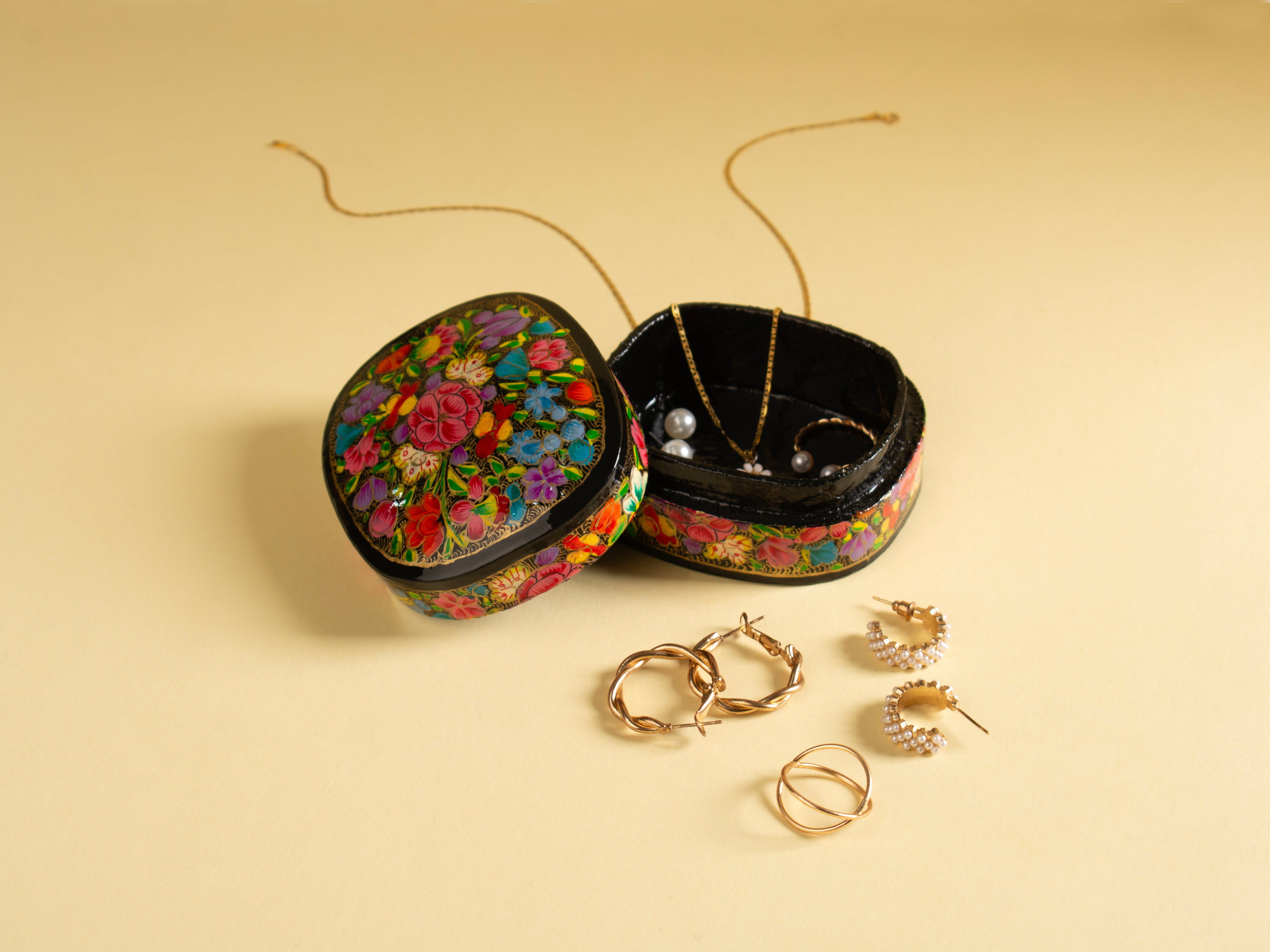 Celebrate art and craftsmanship with this exquisite hand-painted paper mache box, adorned with vibrant floral motifs. Crafted using traditional techniques, each box is lightweight yet sturdy, perfect for storing jewelry, trinkets, keepsakes, or as a decorative accent. The rich colors and detailed brushwork make it a timeless piece that brings a splash of culture and creativity into any space.