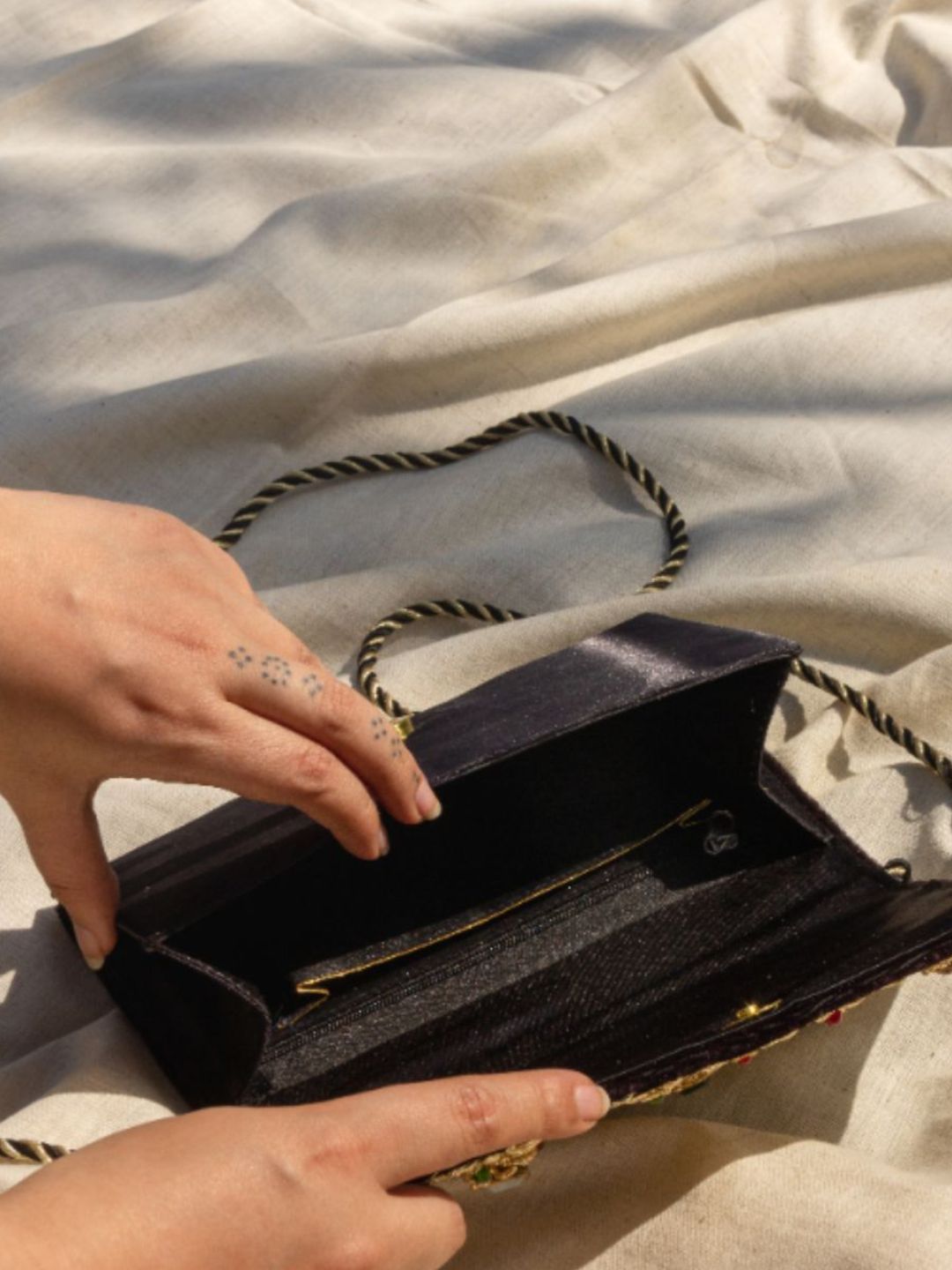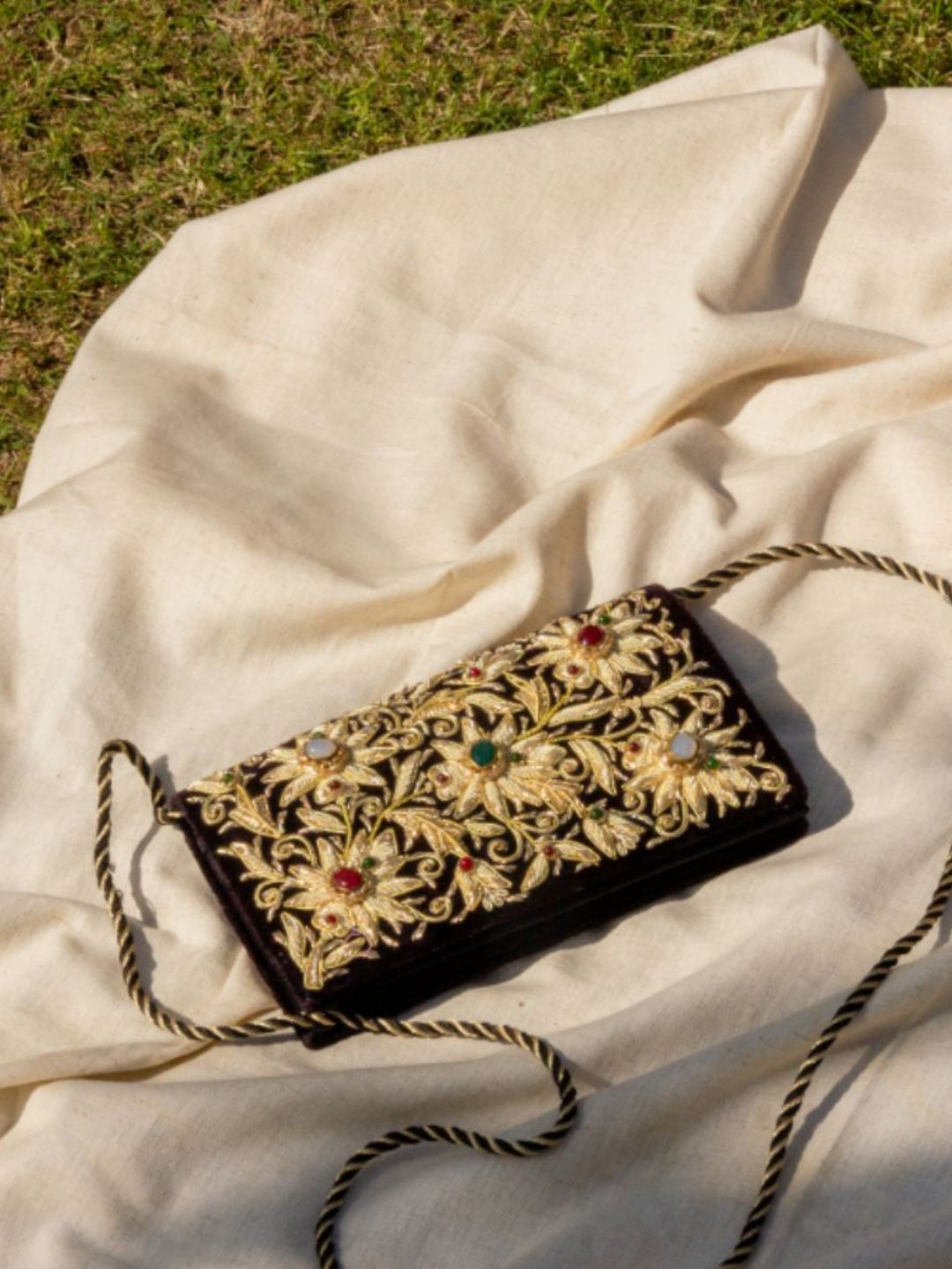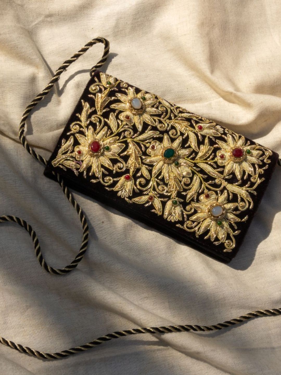 Hand embroidered zardozi purse made on velvet fabric. The vivid 'kamal sling Purse' pattern is inspired from the Mughal architecture present around Old Delhi. Being a handmaade product, the colors shown on the screen may slightly differ in reality upon purchase.
