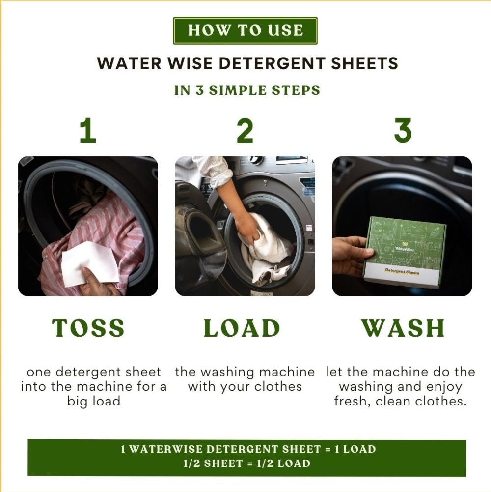 WHAT ARE LAUNDRY DETERGENT SHEETS: Waterwise sheets can be used for Top and Front Load Washing Machines as well as Bucket Hand Wash. They Dissolve with ease leaving no signs of residue, dirt, or impurities on your clothes or in the machine, and ensure that your clothes not only look fresh but also smell fresh!