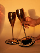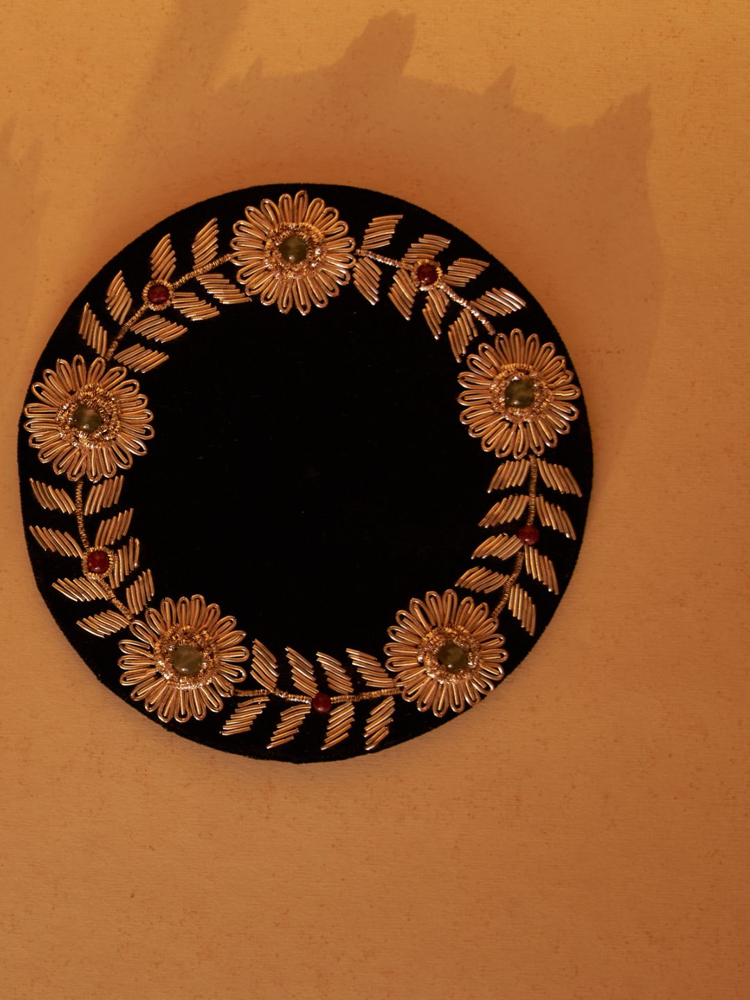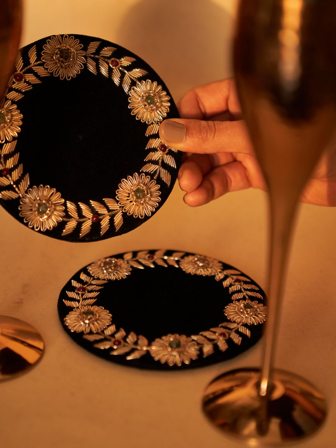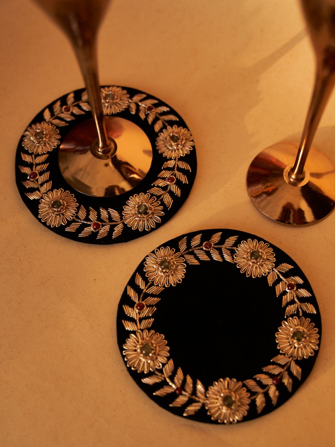 Hand embroidered zardozi coasters made on lustrous velvet fabric. Perfect blend of craft and class. A must have for your dining tables.