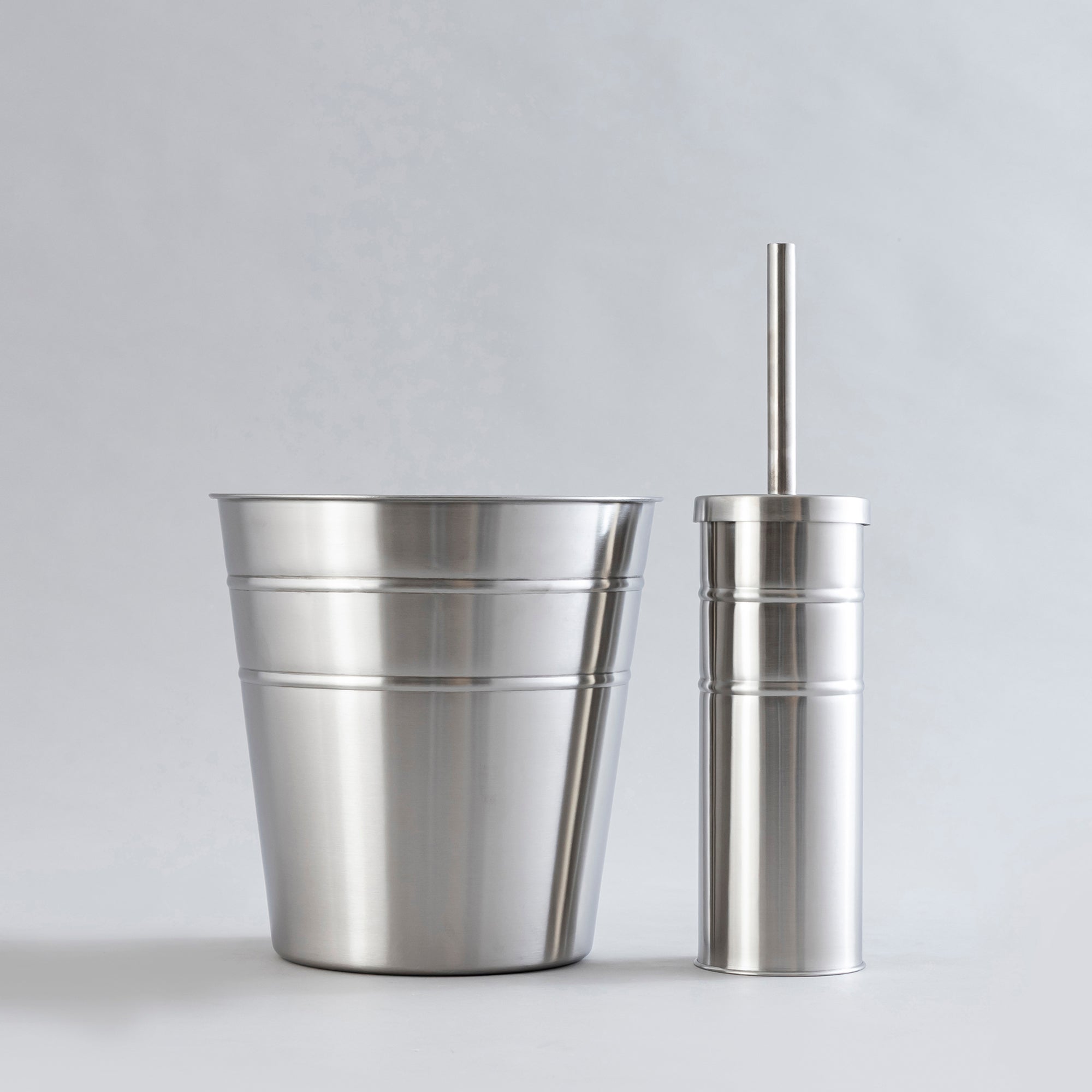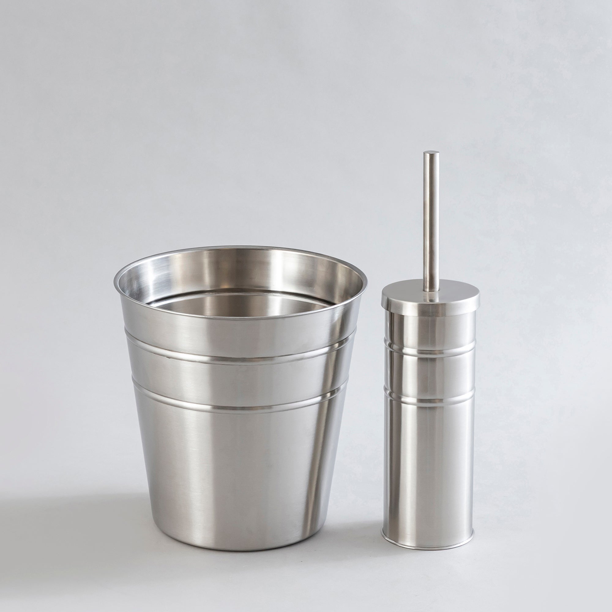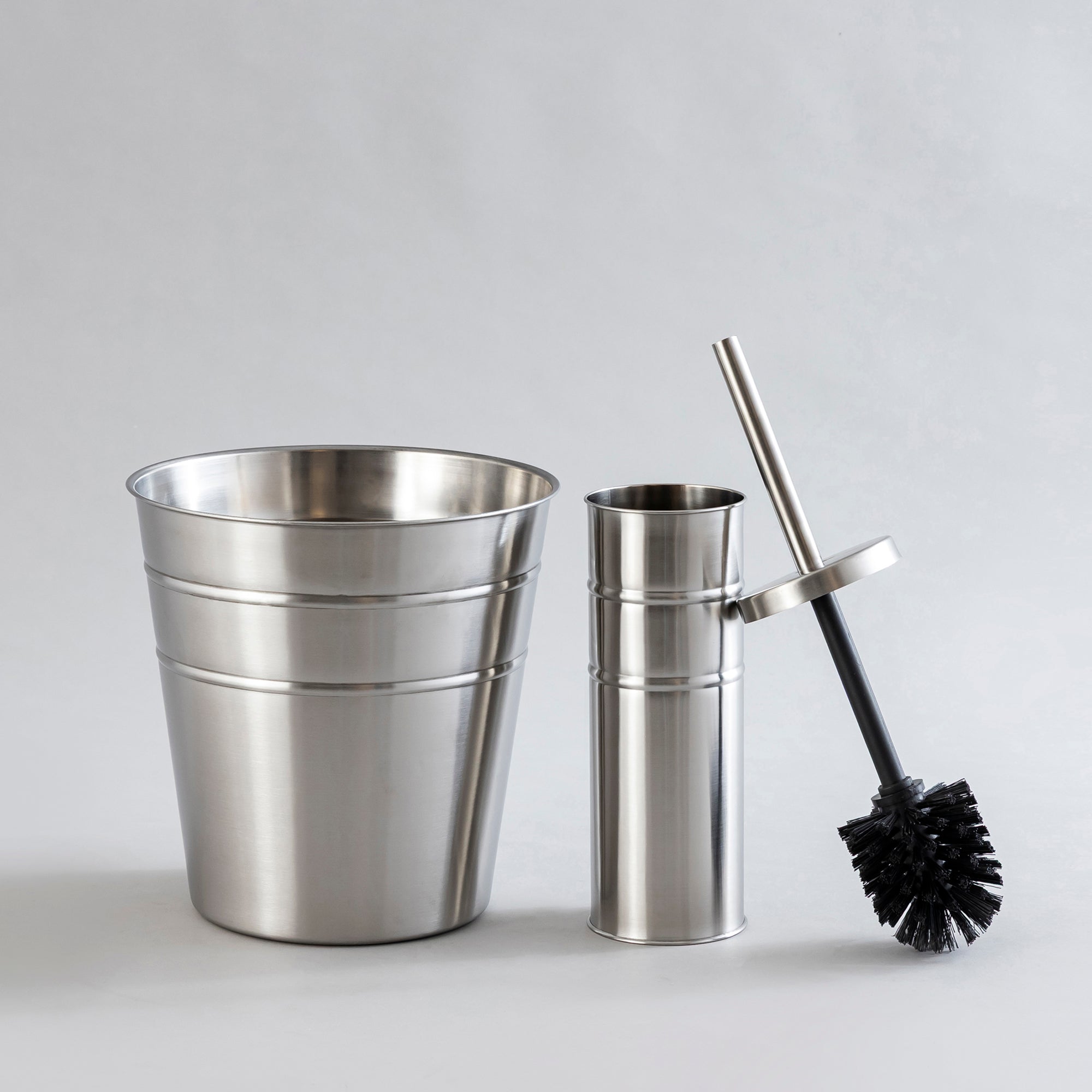 Shiny stainless steel waste bin and brush holder combo. Style 1