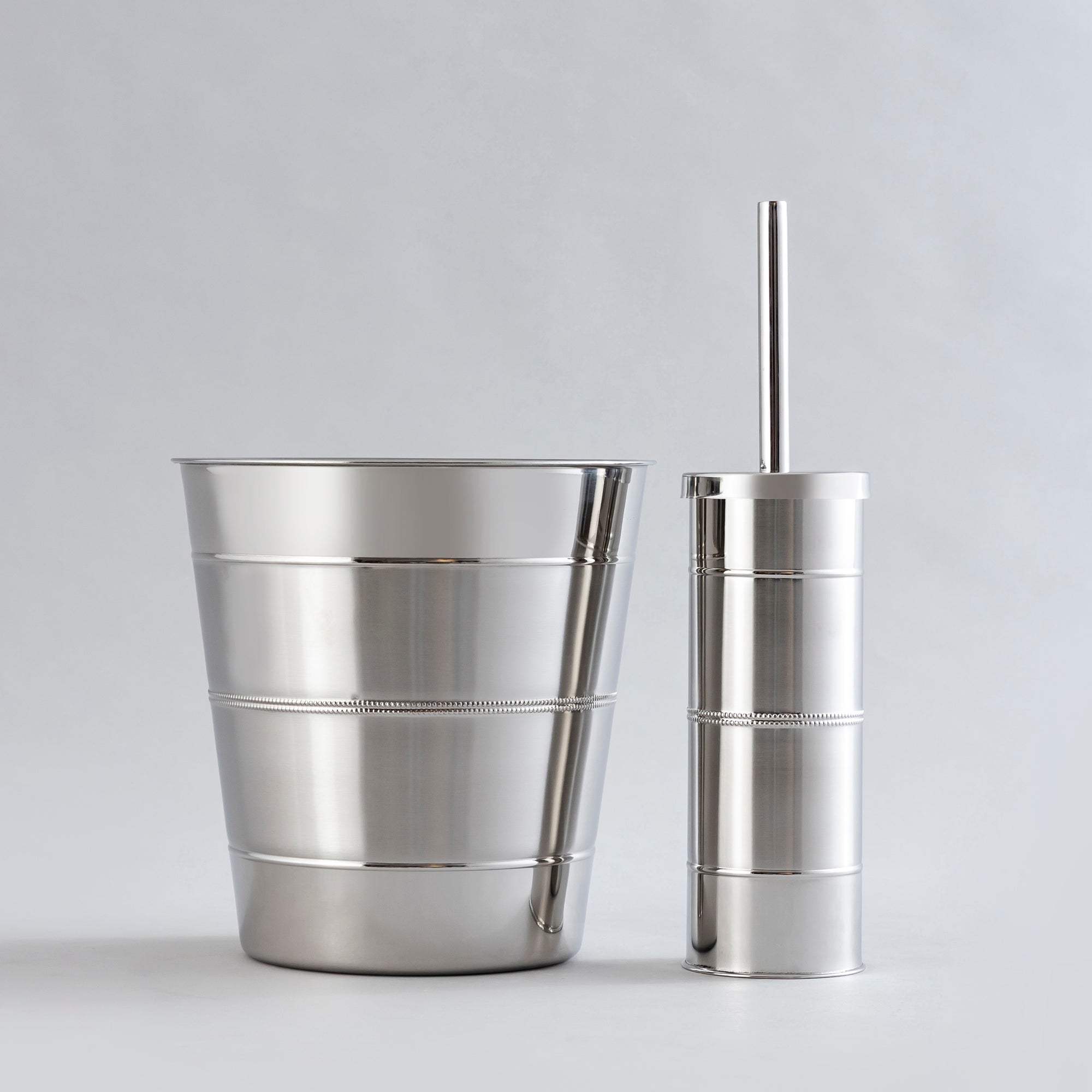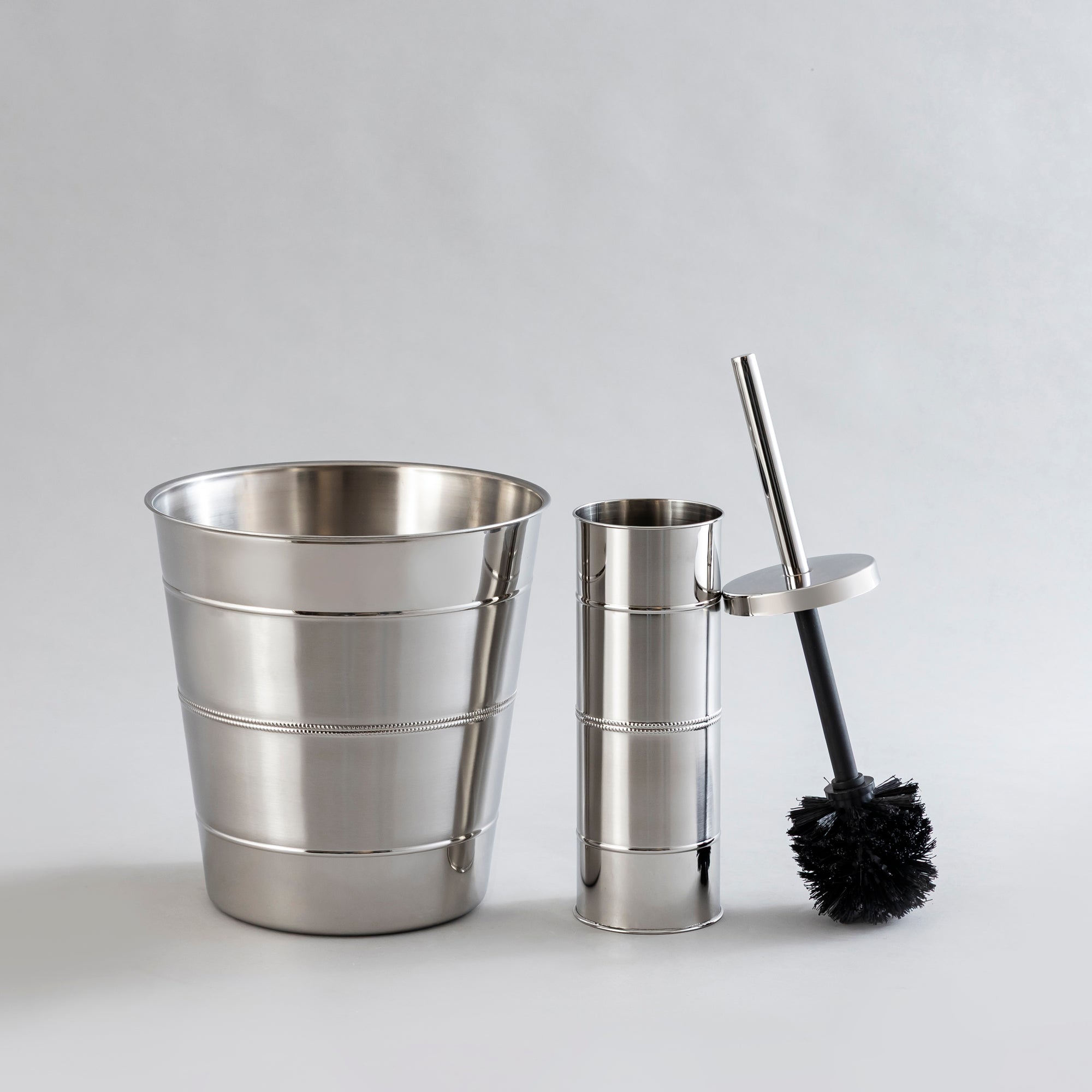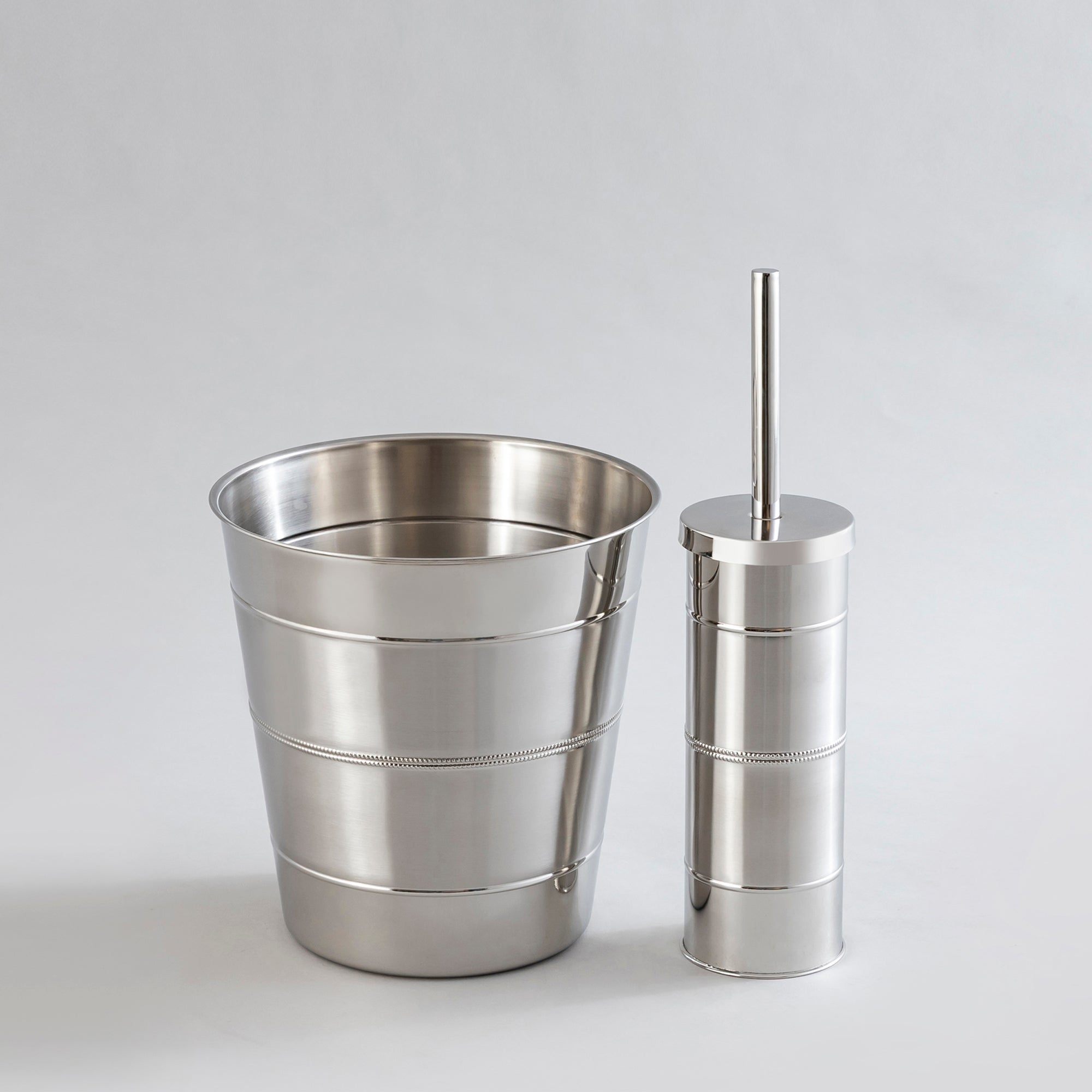 Shiny stainless steel waste bin and brush holder combo. Style 5