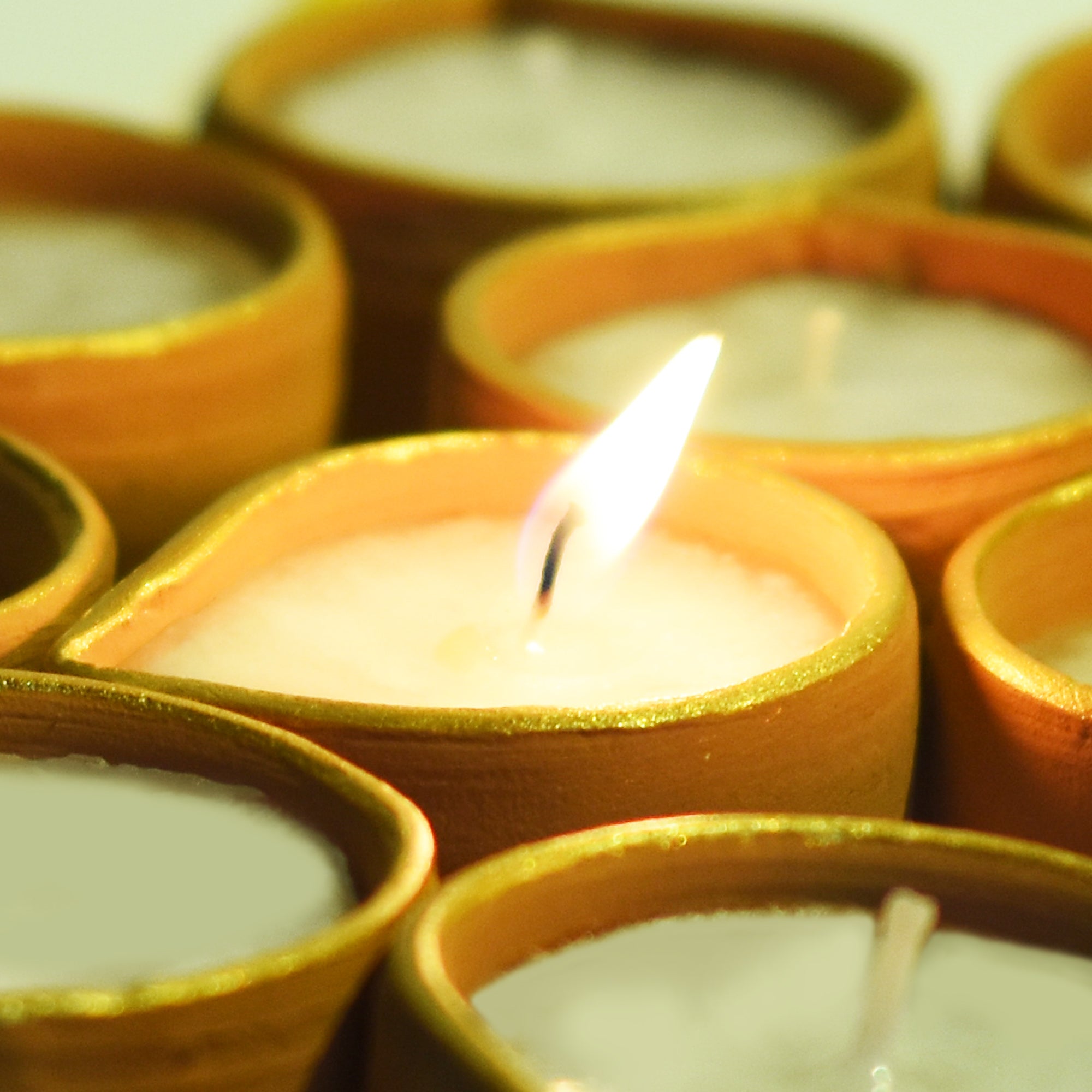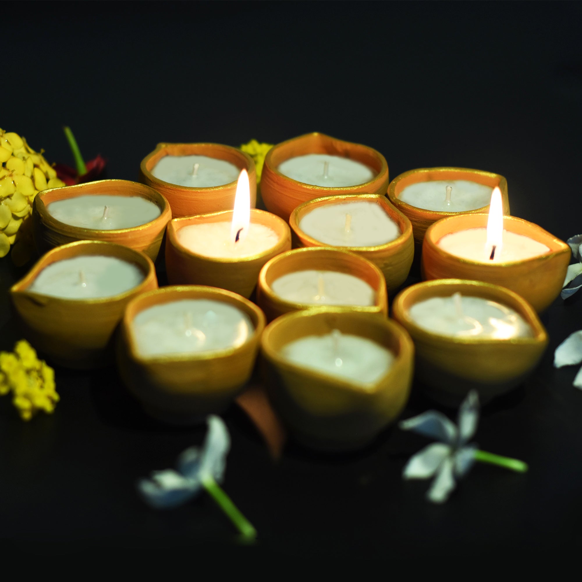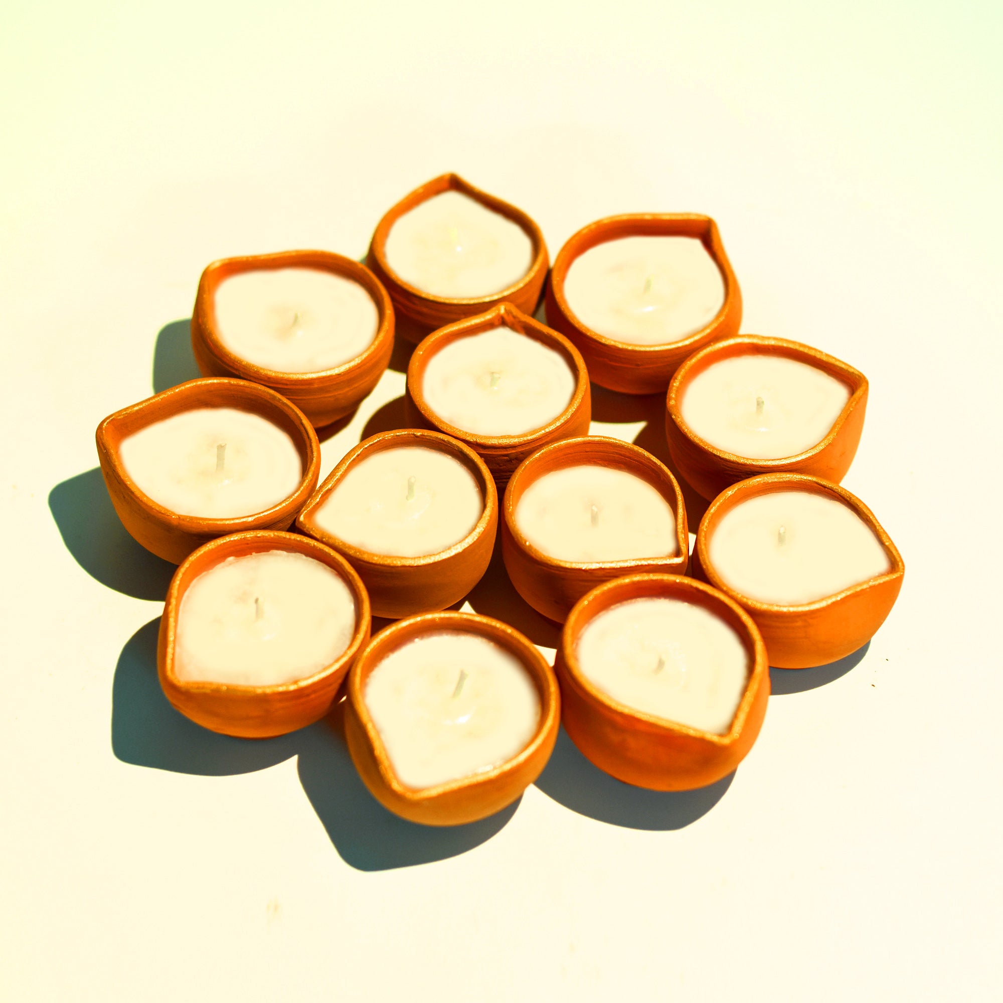 Traditional Terracotta little cute diya filled with paraffin wax. Terracotta Diyas are traditionally handmade on potters wheel with care these candles come in a set of 12 with. Perfect for festive seasons and celebrations be it Diwali, Christmas, Puja etc.