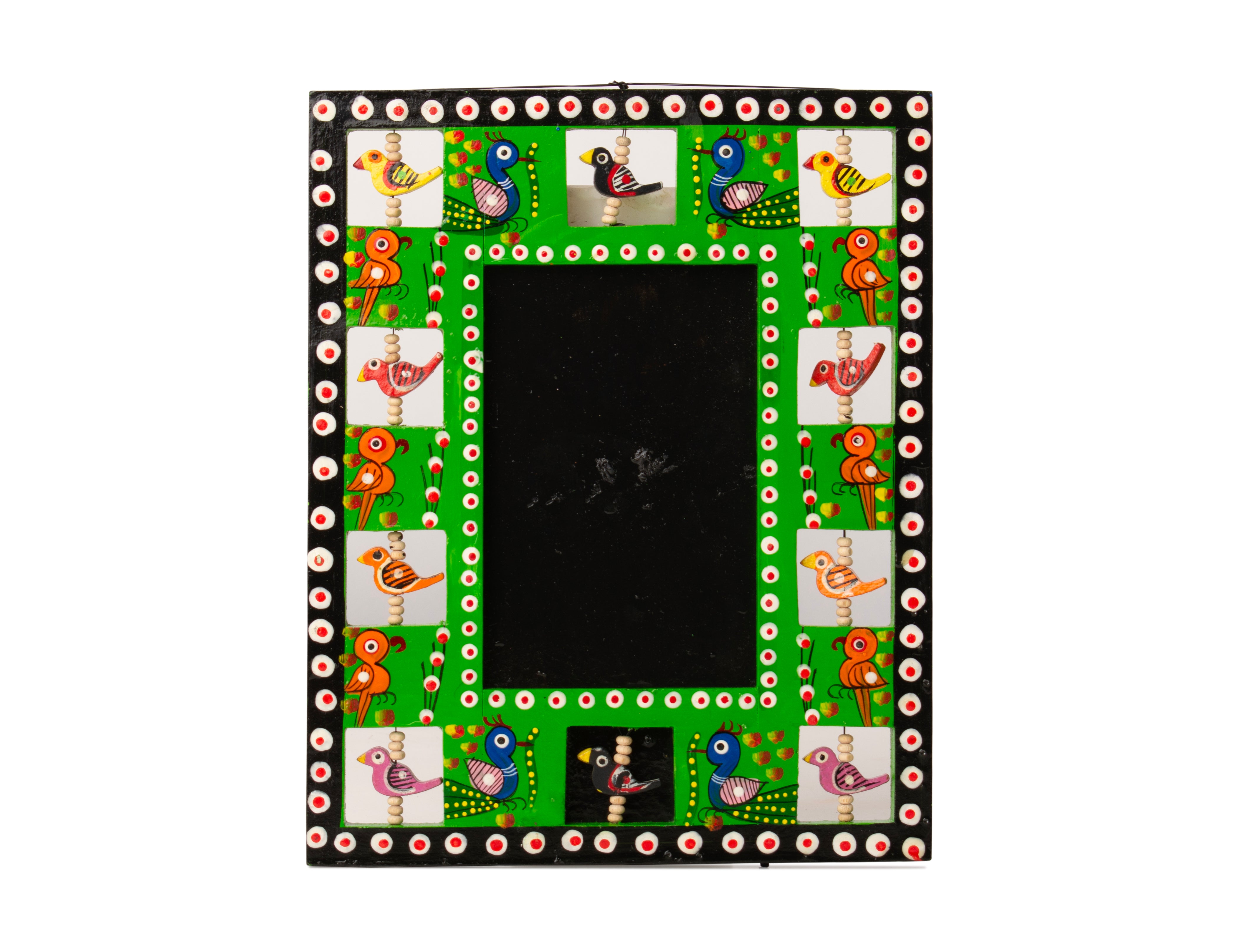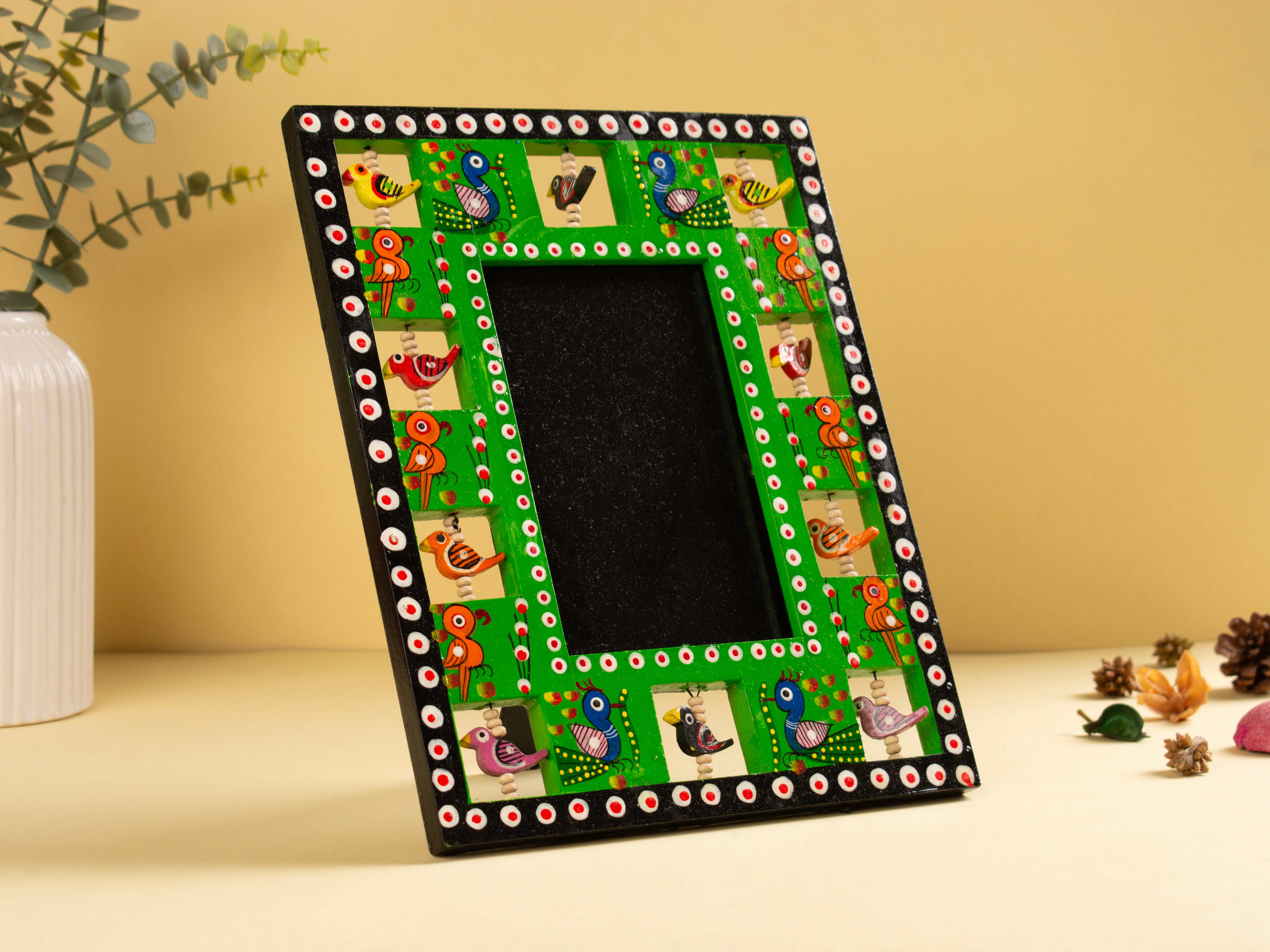 Frame your memories with a splash of folk art using this vibrant hand-painted wooden photo frame. Adorned with colorful birds, dot motifs, and bold borders, this frame brings a playful, artisanal charm to any space. Perfect for showcasing cherished moments, it’s a unique addition to desks, side tables, or gallery walls.