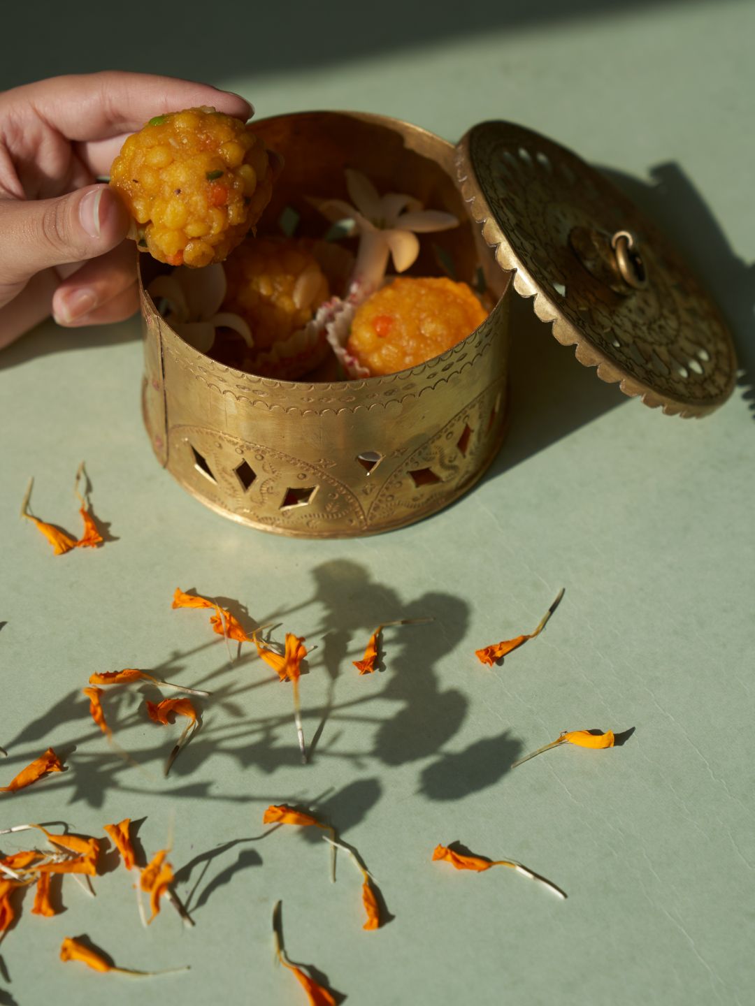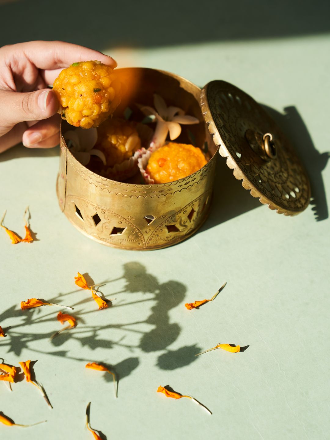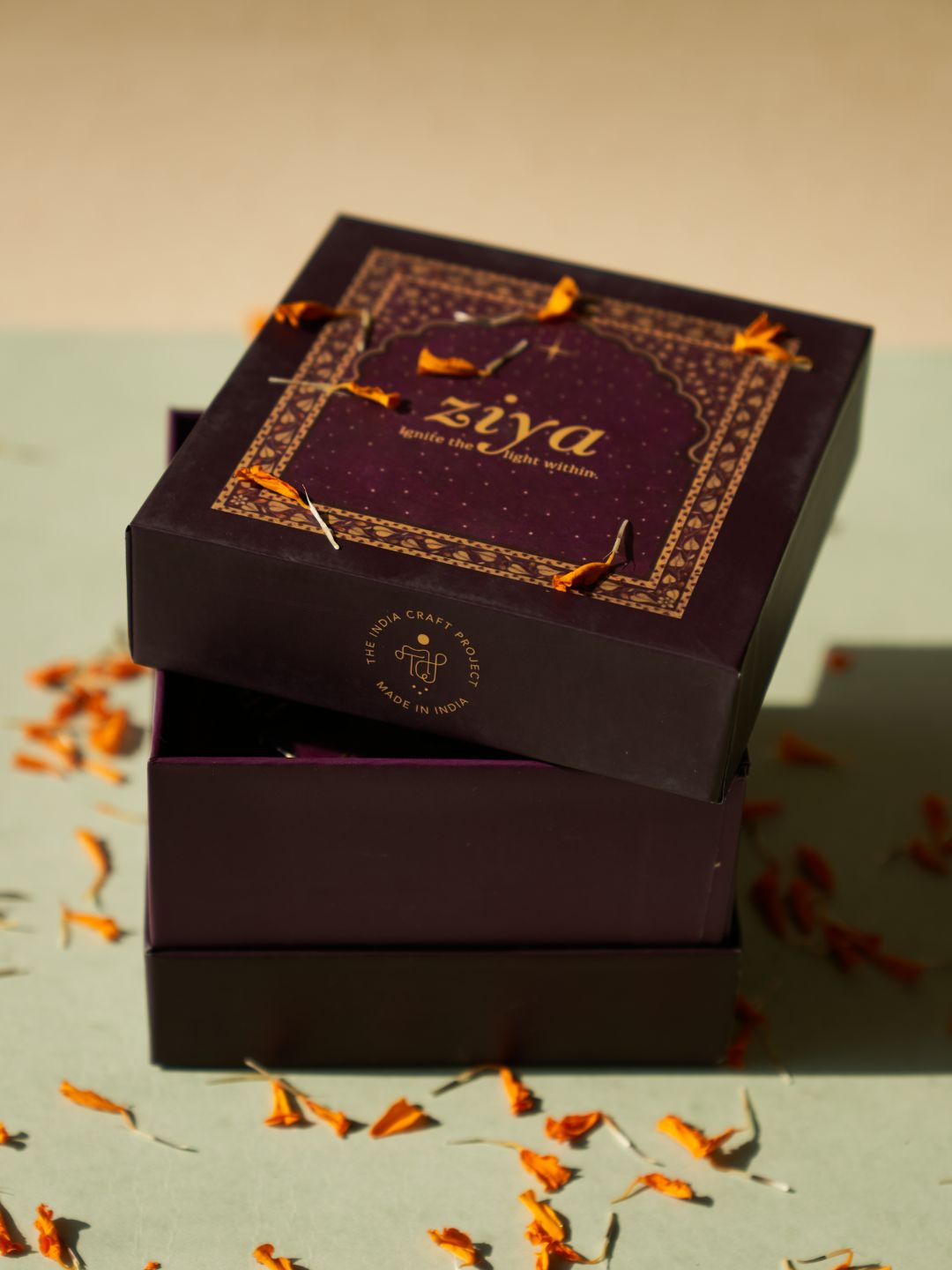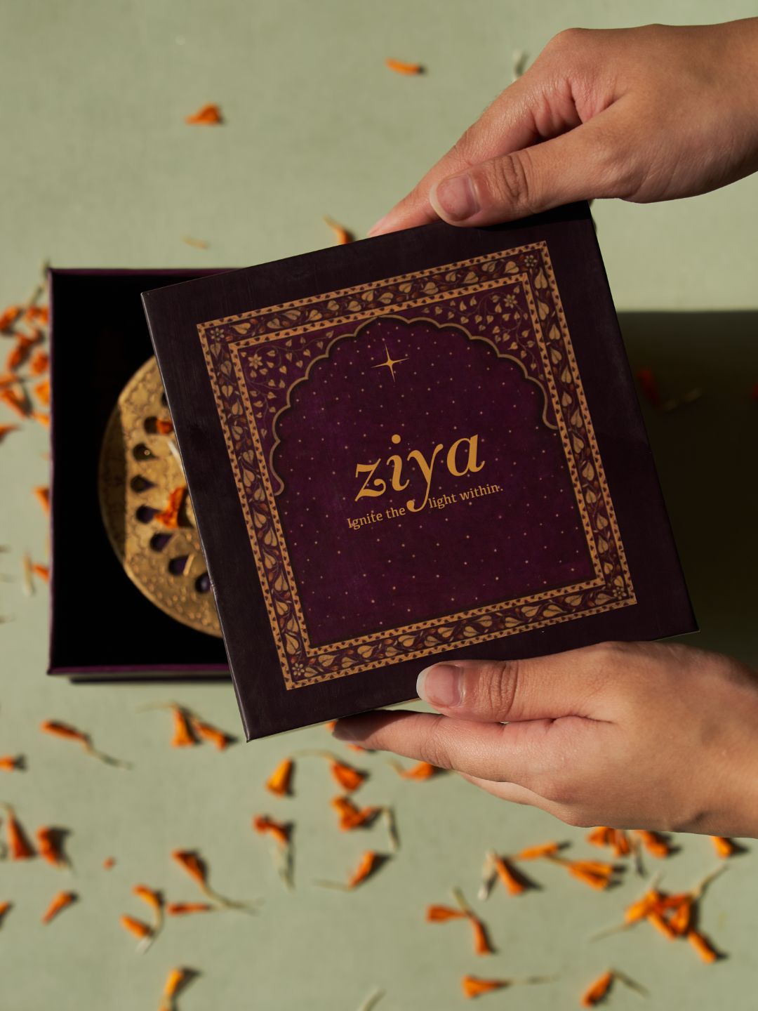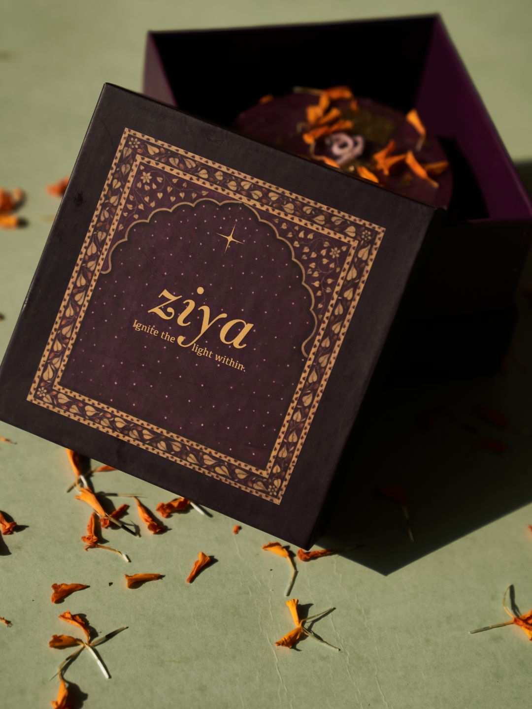 Ziya Dibbi Gift Box: Vanilla Homemade Candle with gold foil and Handmade Brass Dibbi with lid