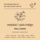 Ingredients: Cold-Pressed Coconut Oil (Cocos nucifera), Pala Indigo (Wrightia tinctoria), Wiry Indigo (Indigofera aspalathoides), Levant Nut (Anamirta cocculus), Tanner's Cassia (Cassia auriculata), Turmeric (Curcuma longa), Bermuda Grass (Cynodon dactylon), Indian Gooseberry (Emblica officinalis), Peepal Tree Bark (Ficus religiosa), Jasmine (Jasminum auriculatum), Mango Leaves (Mangifera indica), Banana Flower (Musa acuminata), Wild Basil (Ocimum americanum), Indian Leadwort (Plumbago zeylanica), Indian Mallow (Abutilon indicum), African Spider Flower (Cleome gynandra), Nut Grass Tubers (Cyperus rotundus), Chaulmogra Oil (Hydnocarpus pentandrus), Malabar Nut (Justicia adhatoda), Cinnamon (Laurus tamala), Soapnut (Sapindus emarginatus), Chaste Tree Leaves (Vitex negundo)