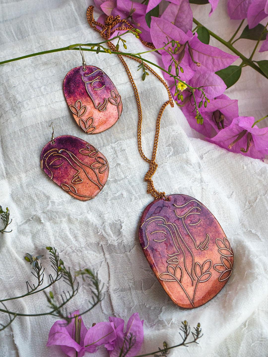 The copper jewellery set is perfect for your day out. This particular Copper enameling pendant is handcrafted by our team of artisans from the western ghats of Maharashtra, India. Copper Enamelling is the age-old craft of fusing glass onto the copper surface for color enrichment.