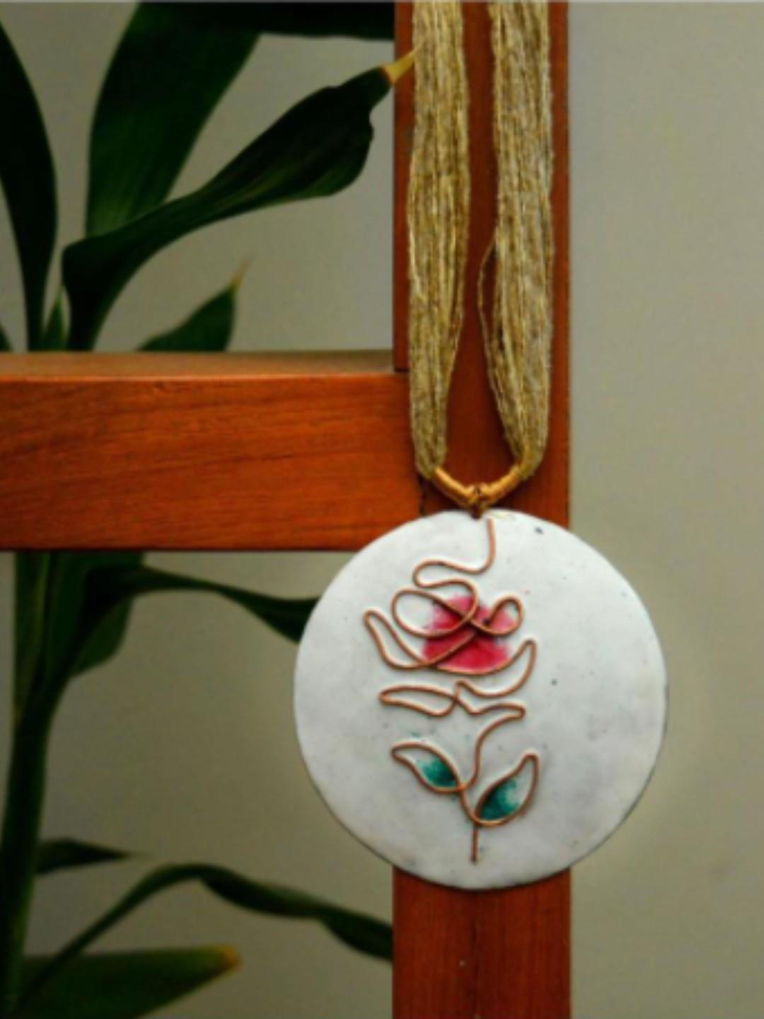 The white pendant is perfect for your day out. This particular Copper enameling pendant is handcrafted by our team of artisans from the western ghats of Maharashtra, India. Copper Enamelling is the age-old craft of fusing glass onto the copper surface for color enrichment.