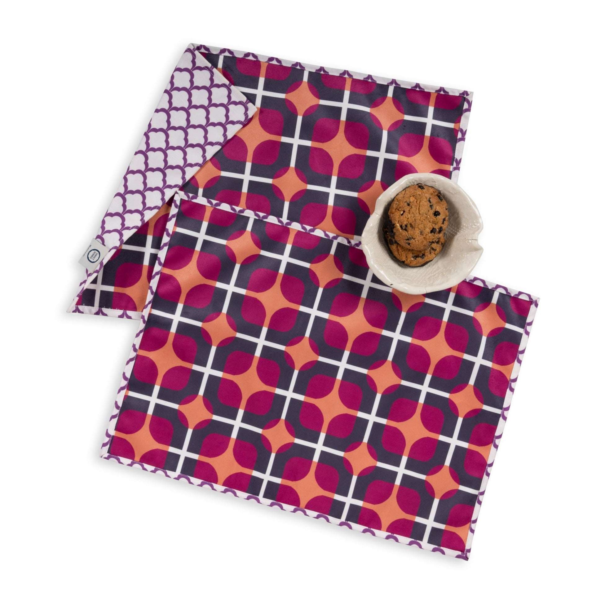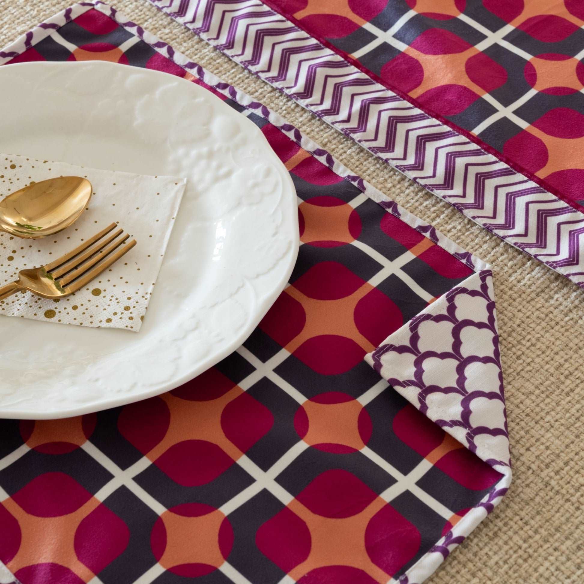 The geometric pattern, intricately designed, showcases a range of pinks, from soft blush to bold magenta, creating a harmonious and energetic ambiance. The vibrant colors add a touch of playfulness to your dining space, making it an ideal choice for both casual meals and festive gatherings.
