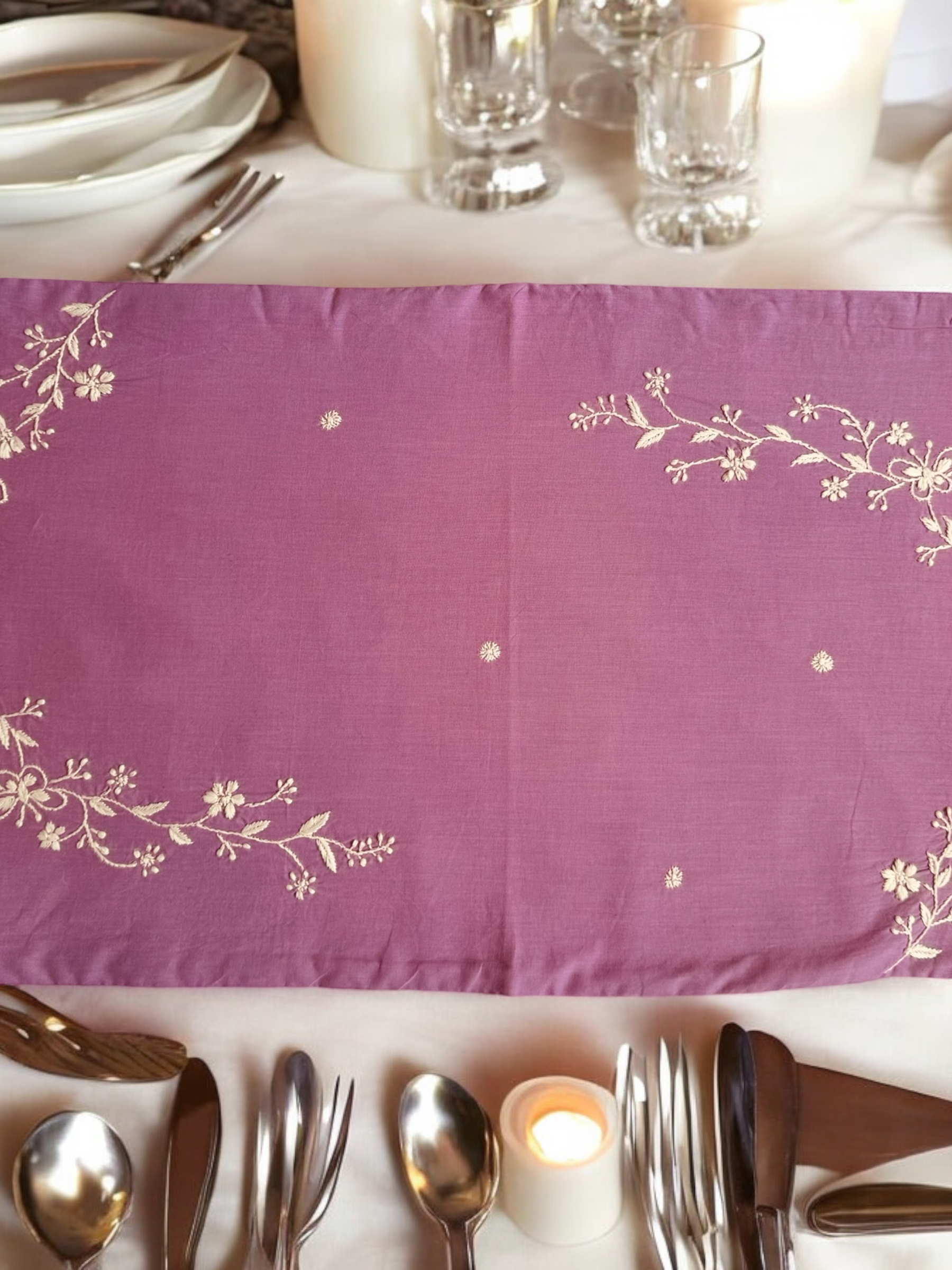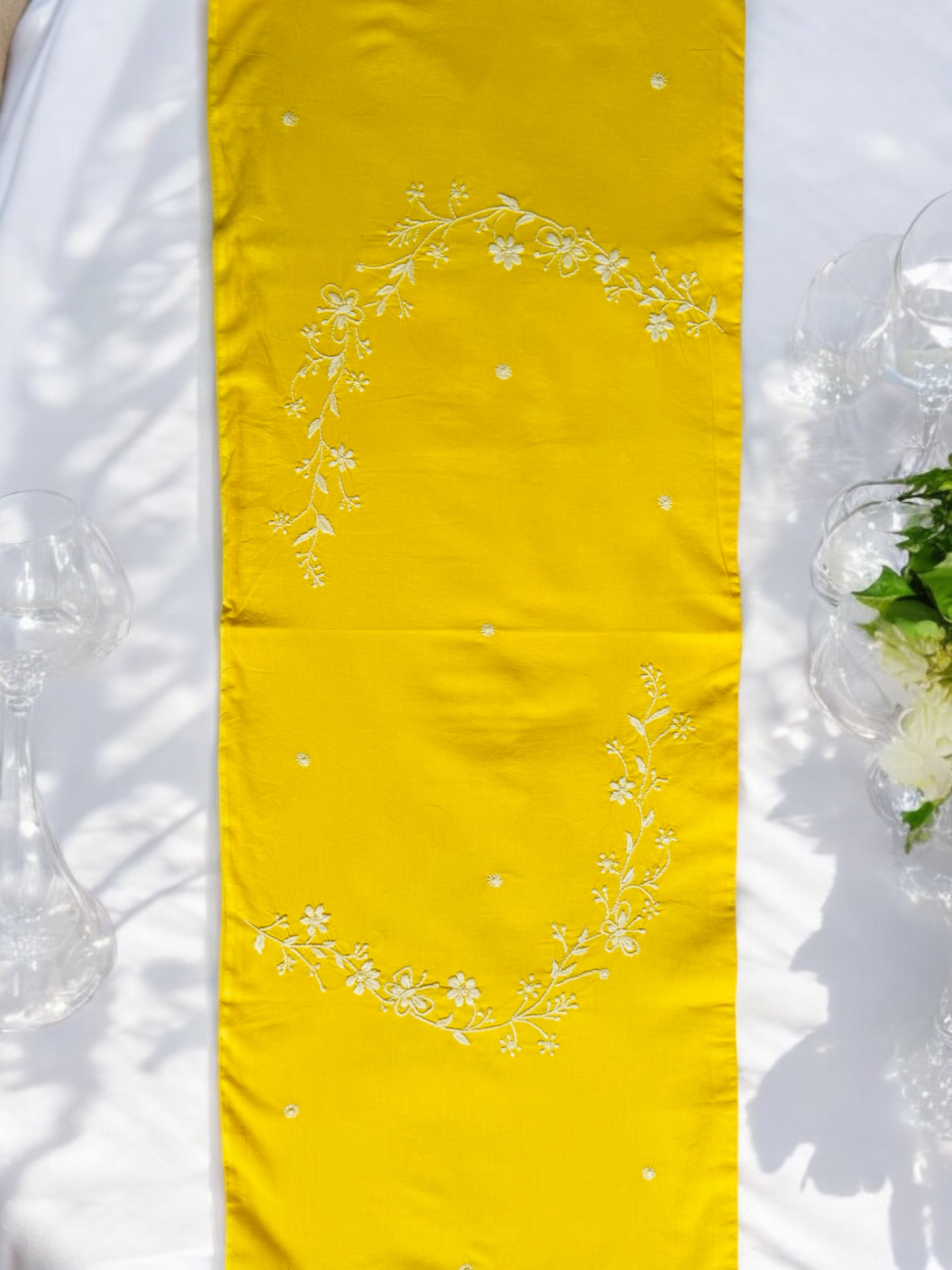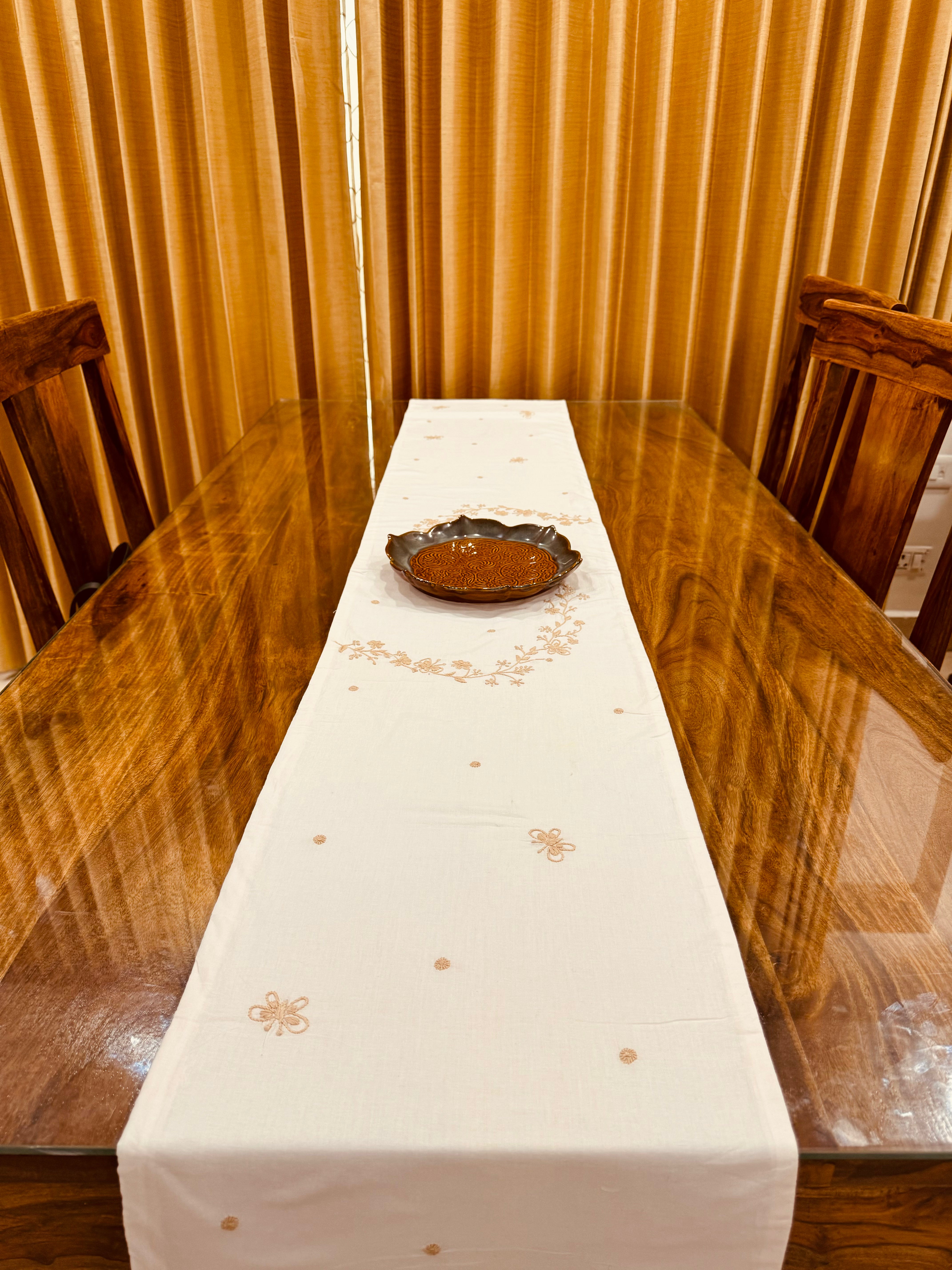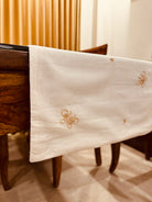 Elevate your table setting with the Anthophile Collection table runner, a perfect blend of elegance and nature-inspired design. This runner showcases intricate floral chikankari embroidery complements minimalist decor ideal for both formal dinners and casual gatherings. Whether draped over your dining table, sideboard, or coffee table, it adds a touch of sophistication and warmth, celebrating the beauty of flowers in your home decor.