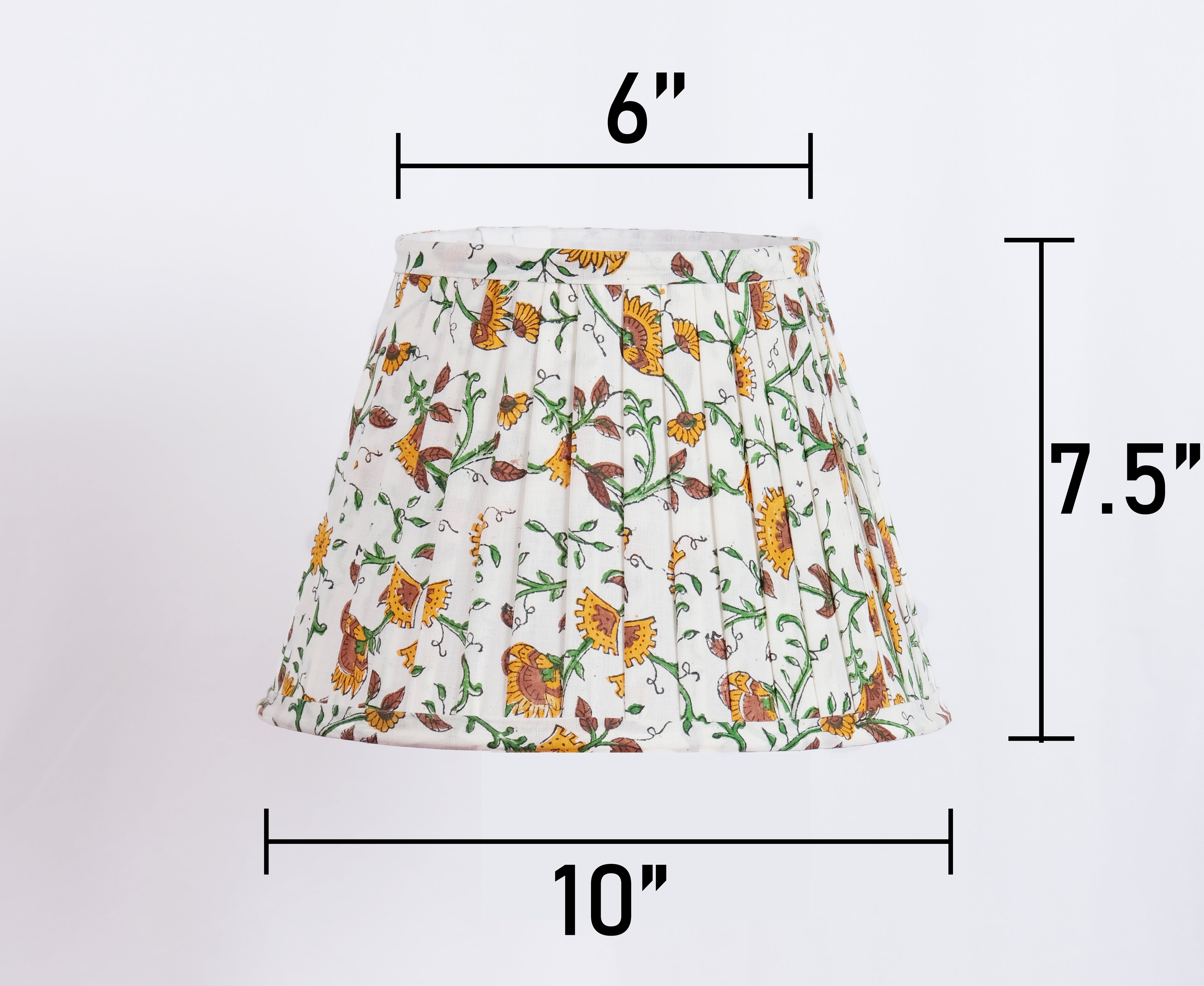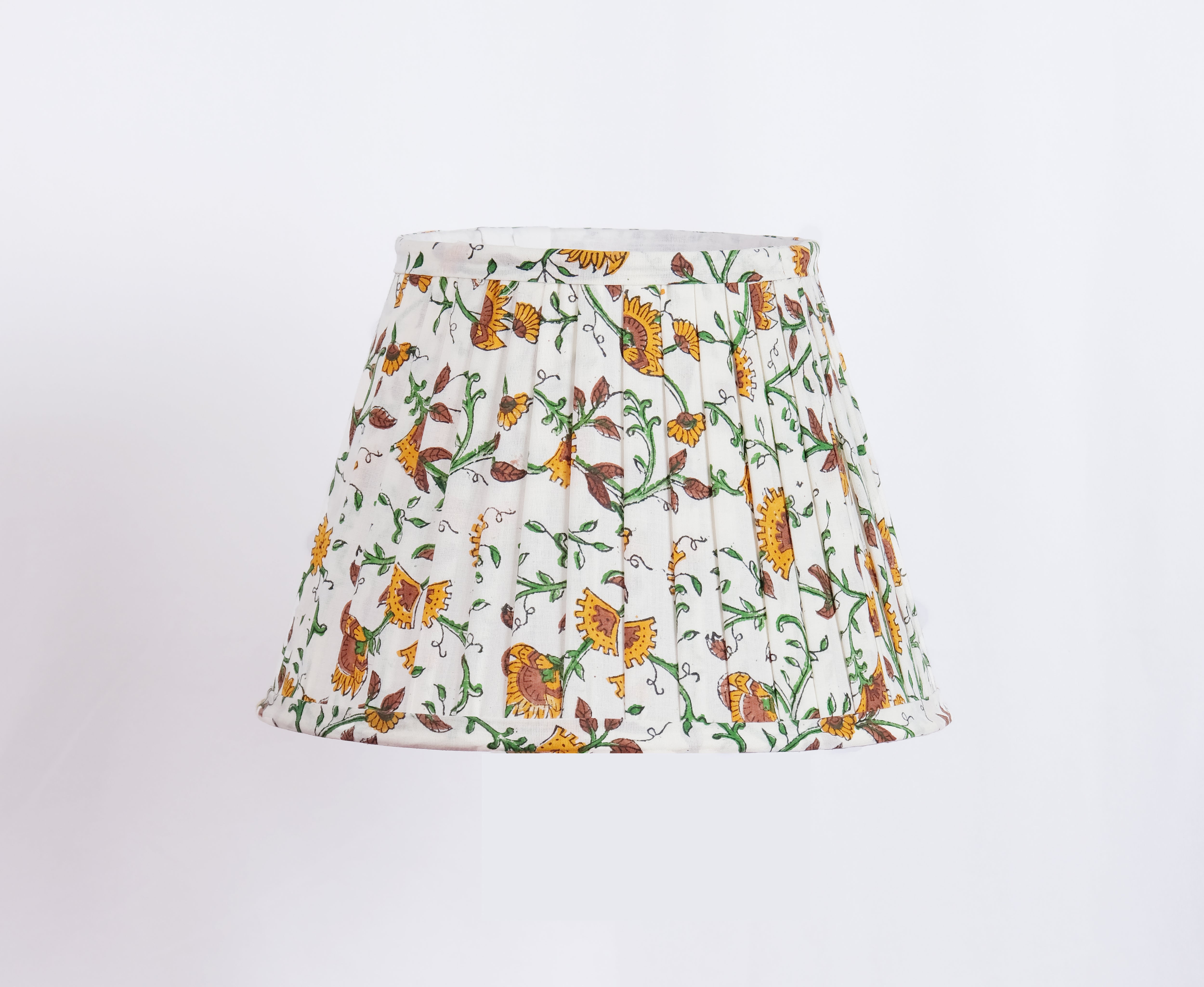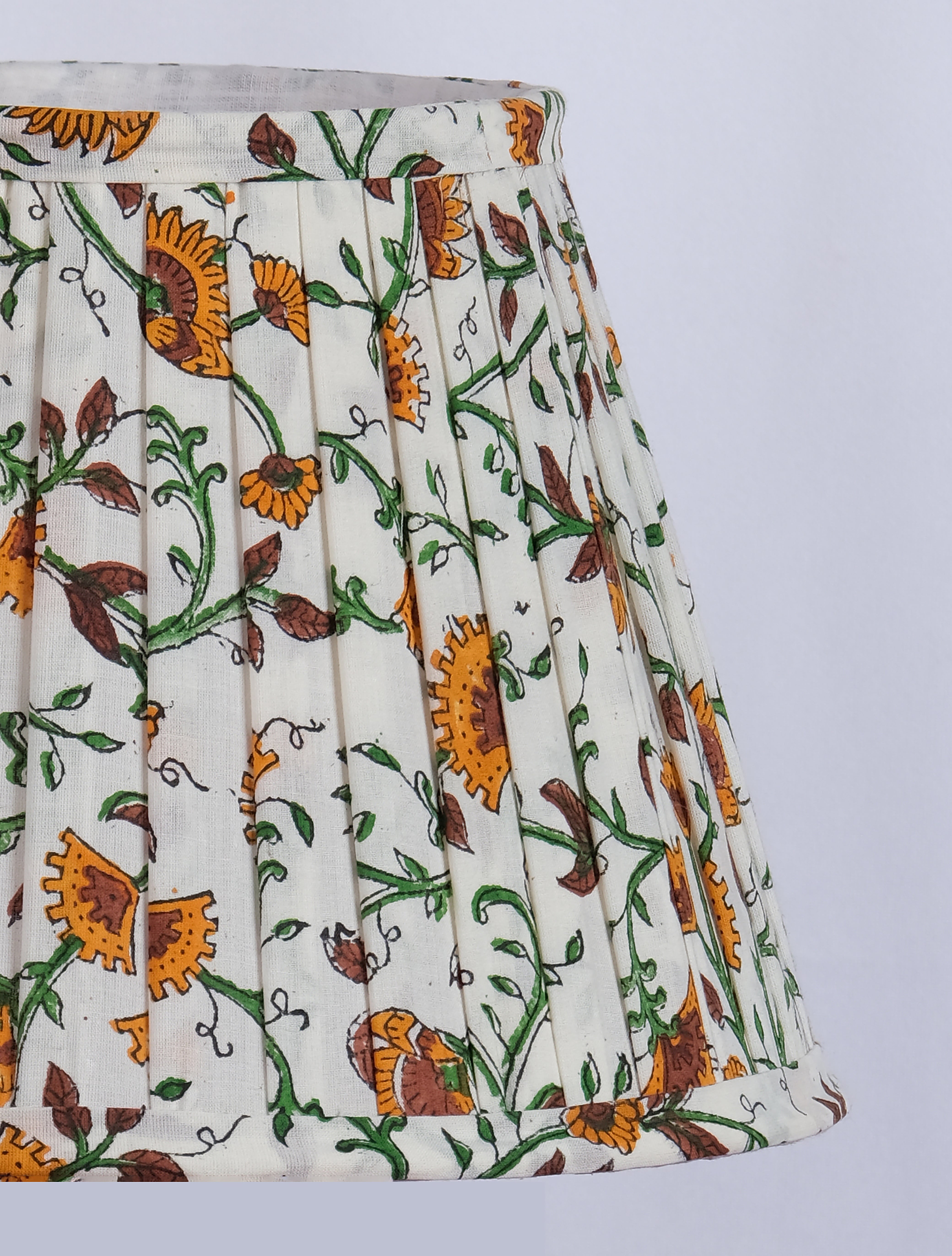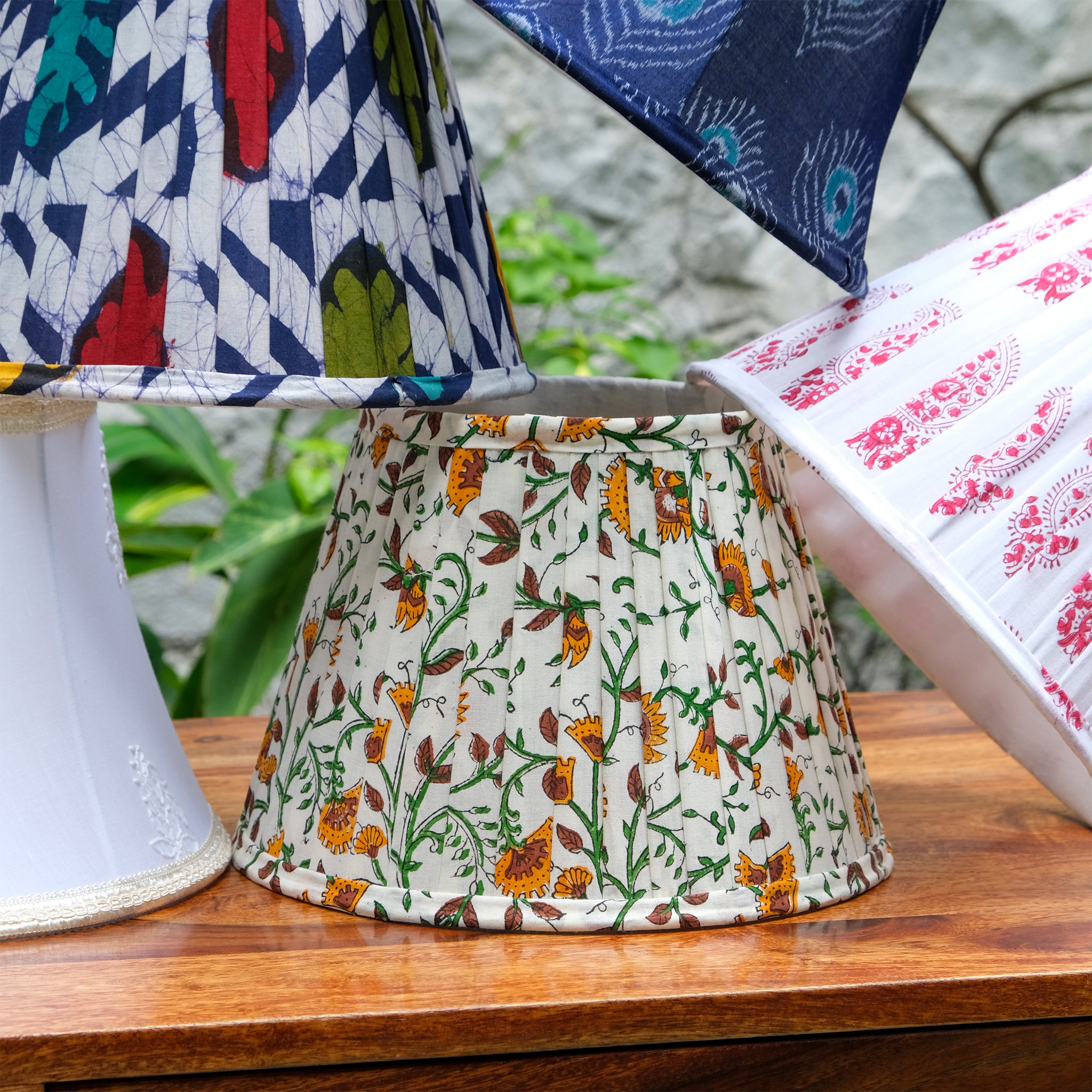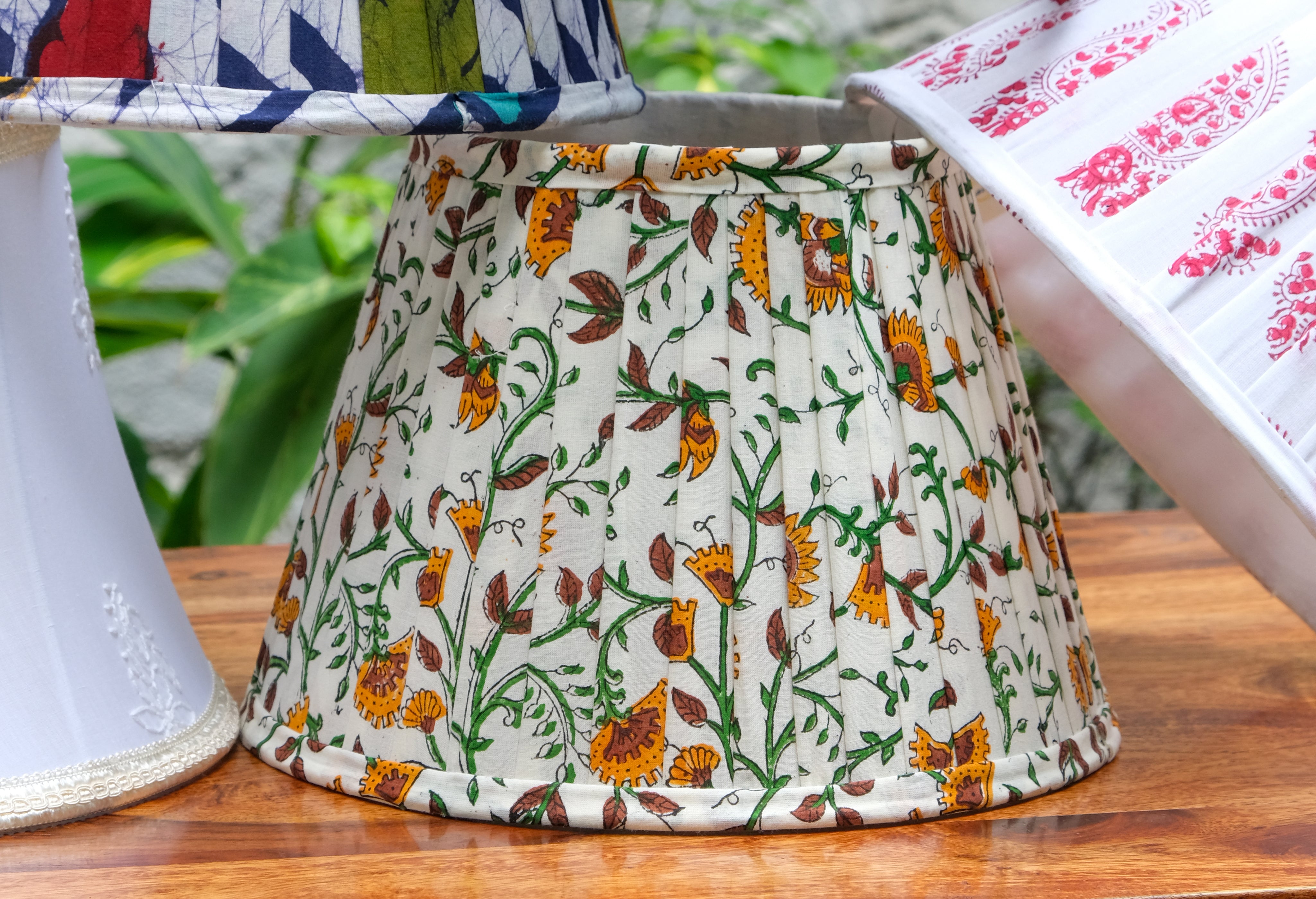 Marigold flower motifs are hand block printed by the artisans of Sanganer city of Rajasthan on soft cotton fabric. A pretty lampshade to highlight any corner of your space.