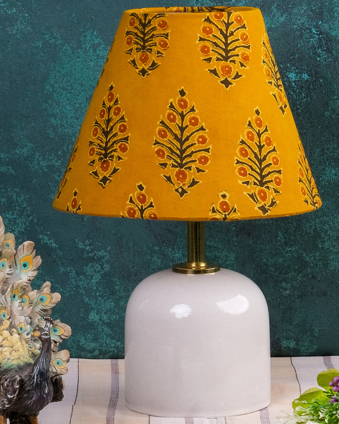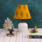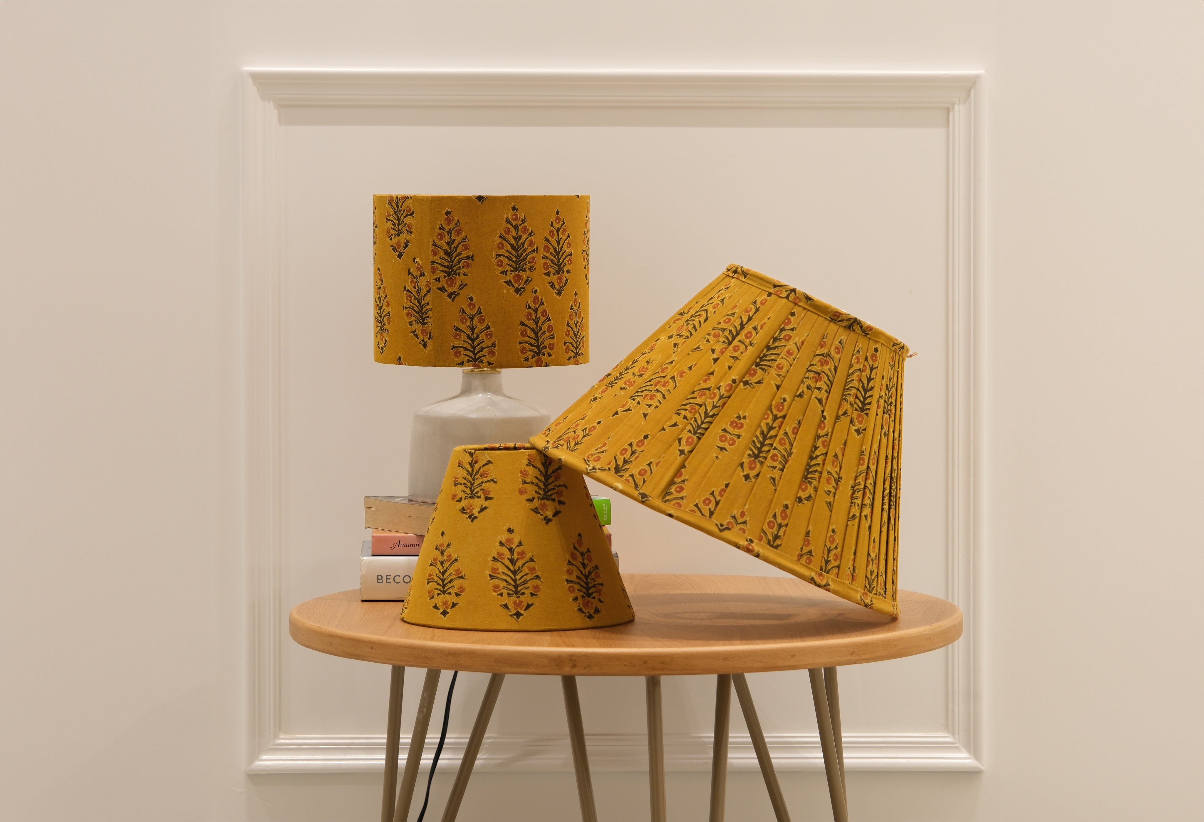 Kalamkari is an ancient Indian textile art that involves hand-painting or block-printing intricate designs on fabric. Mustard Cone Lampshade reminisces with the season of harvest and nostalgia of wandering in a mustard field...Perfect shade for a homesick corner in far off lands.