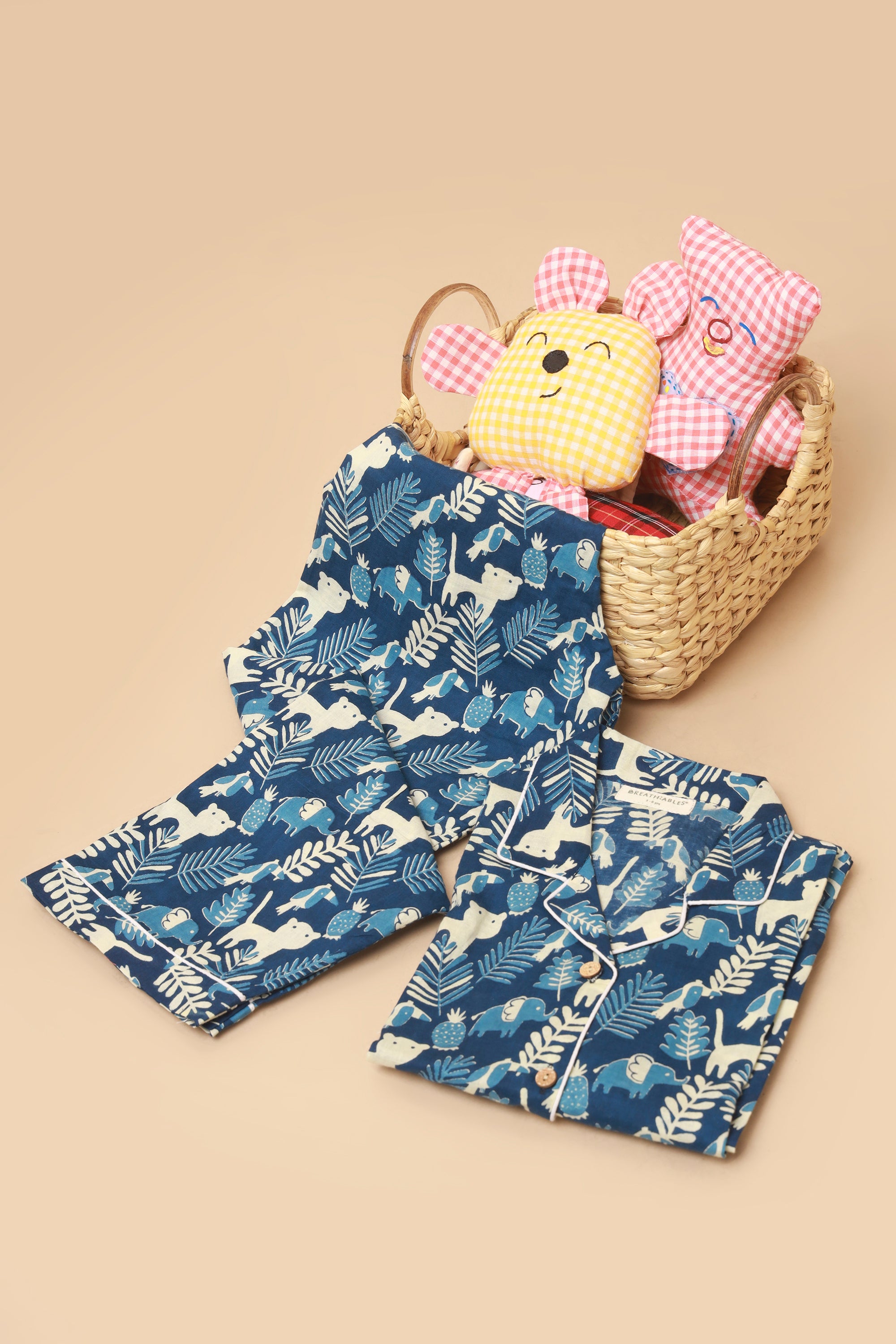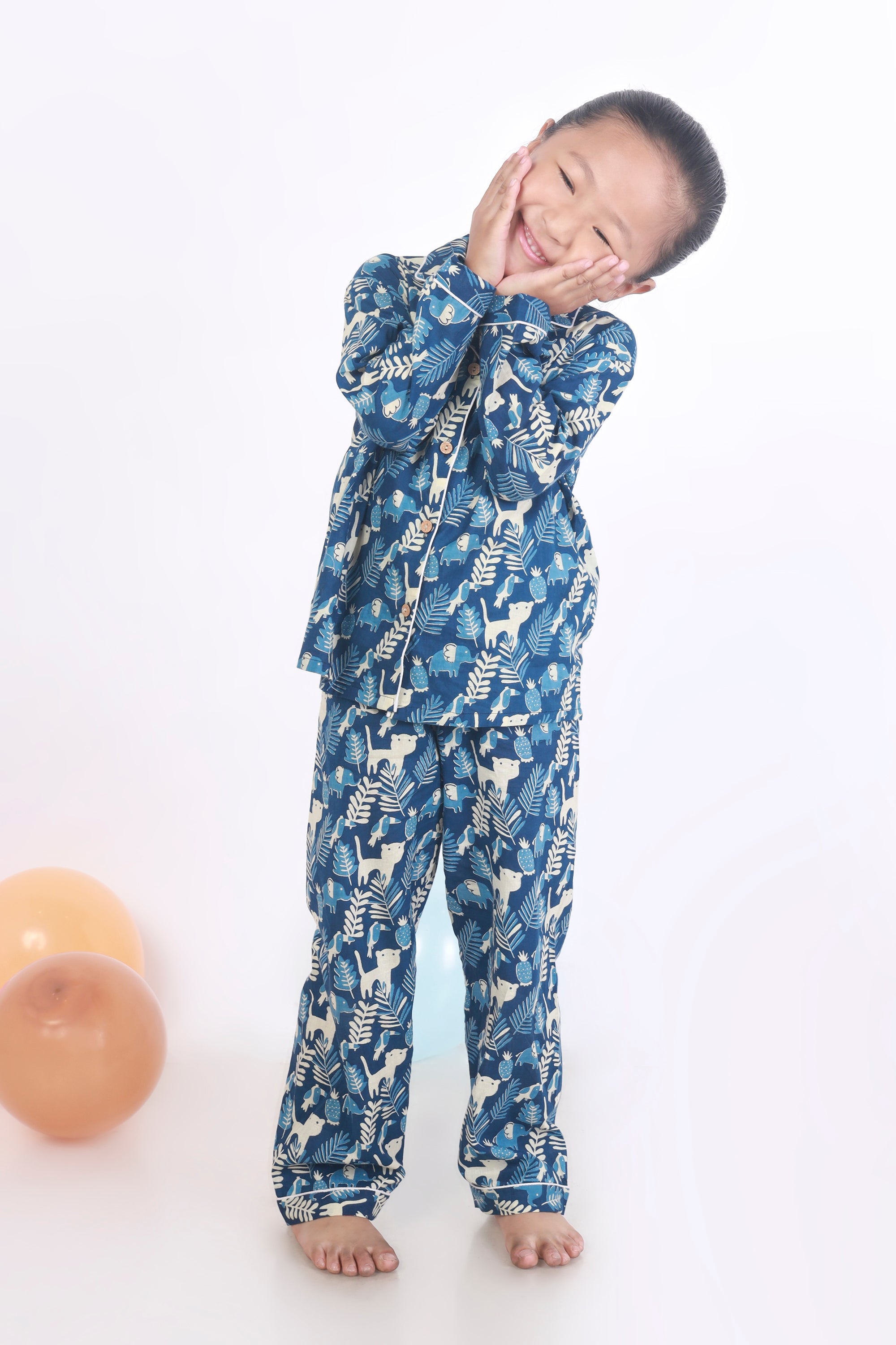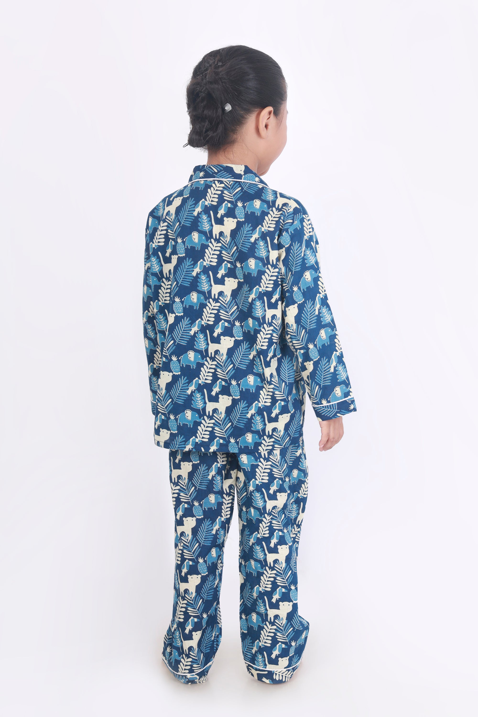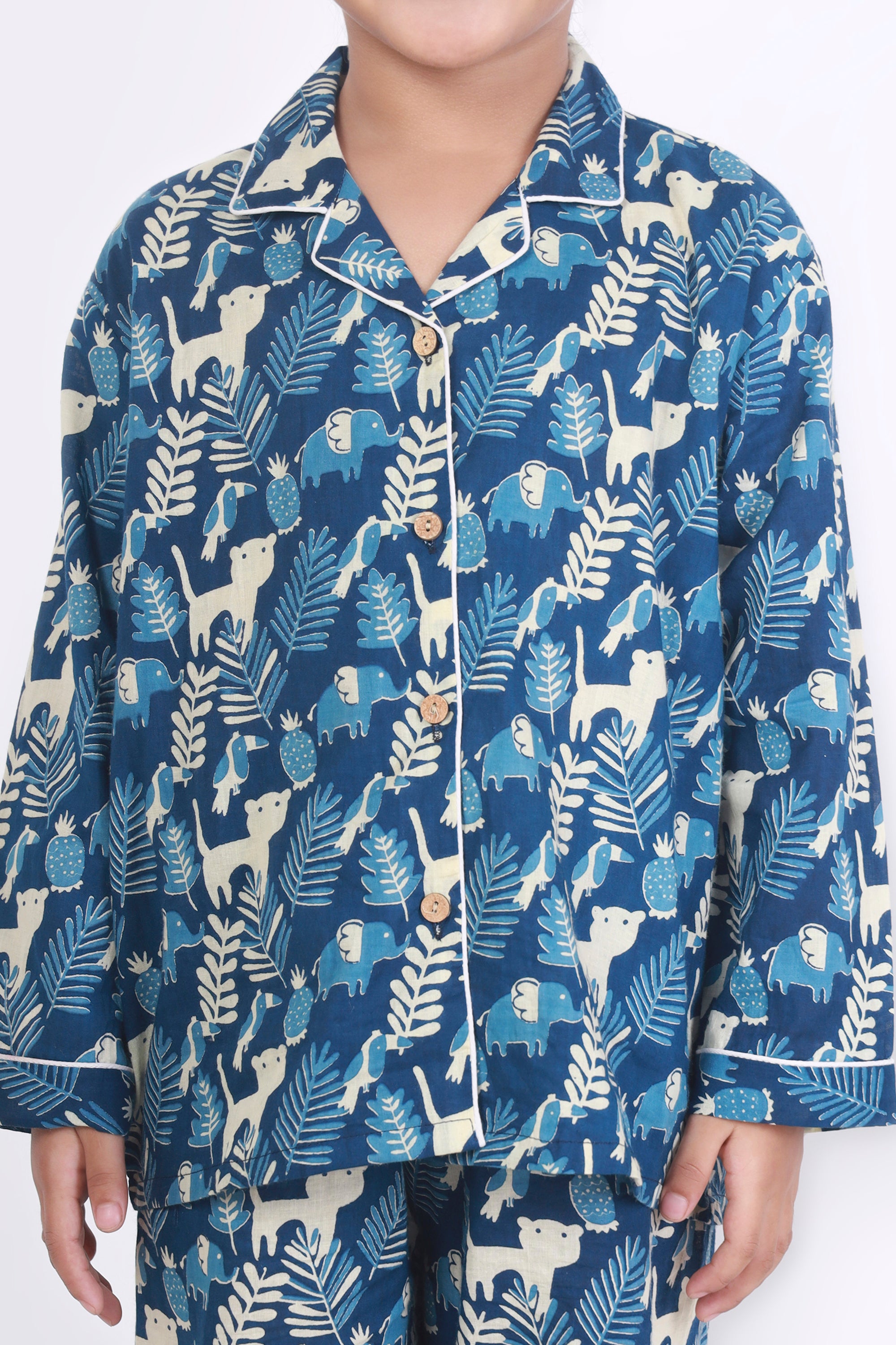 Kids Cotton Nightsuit – Blue Jungle Print Shirt & Pyjama Co-ord Set for Boys & Girls