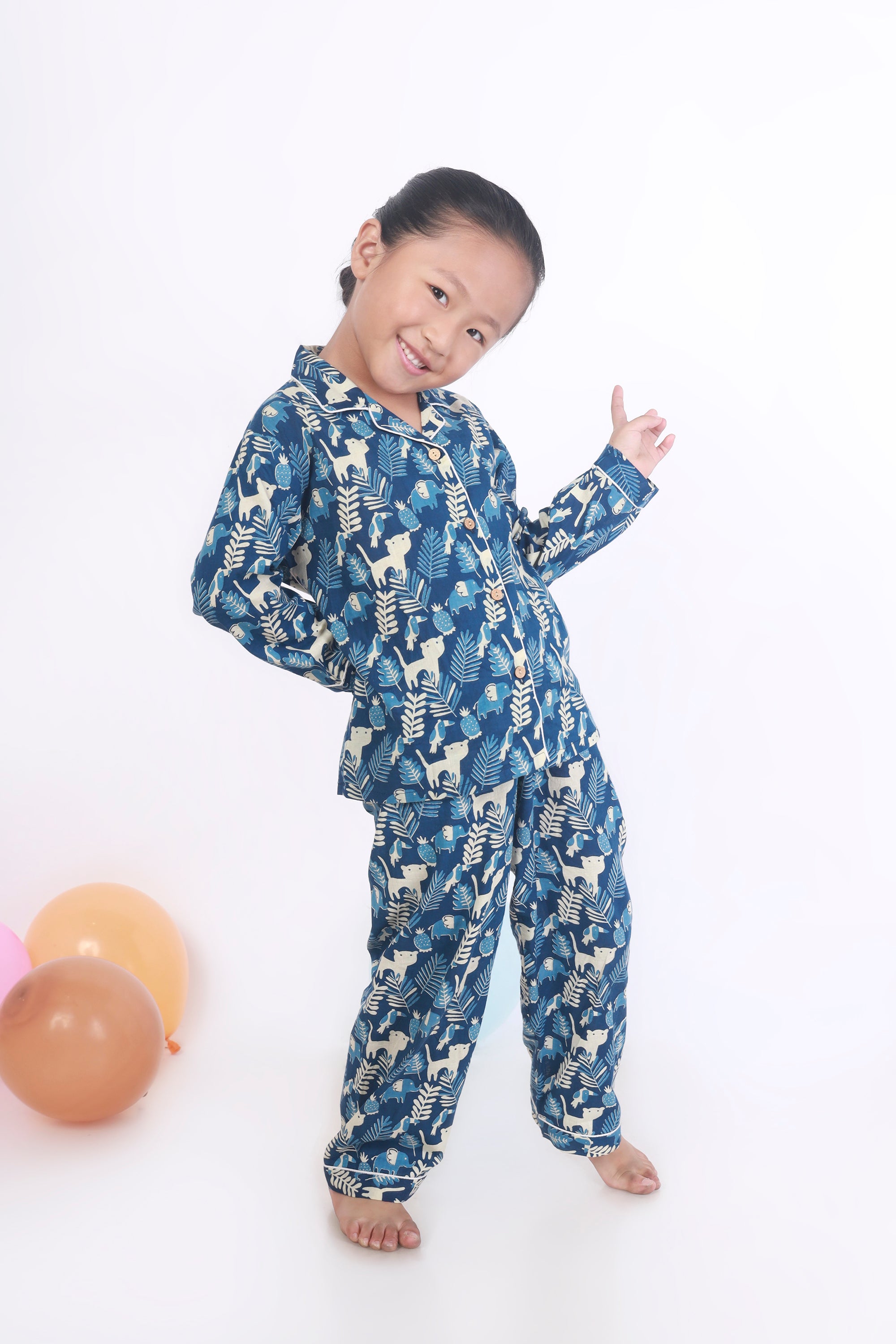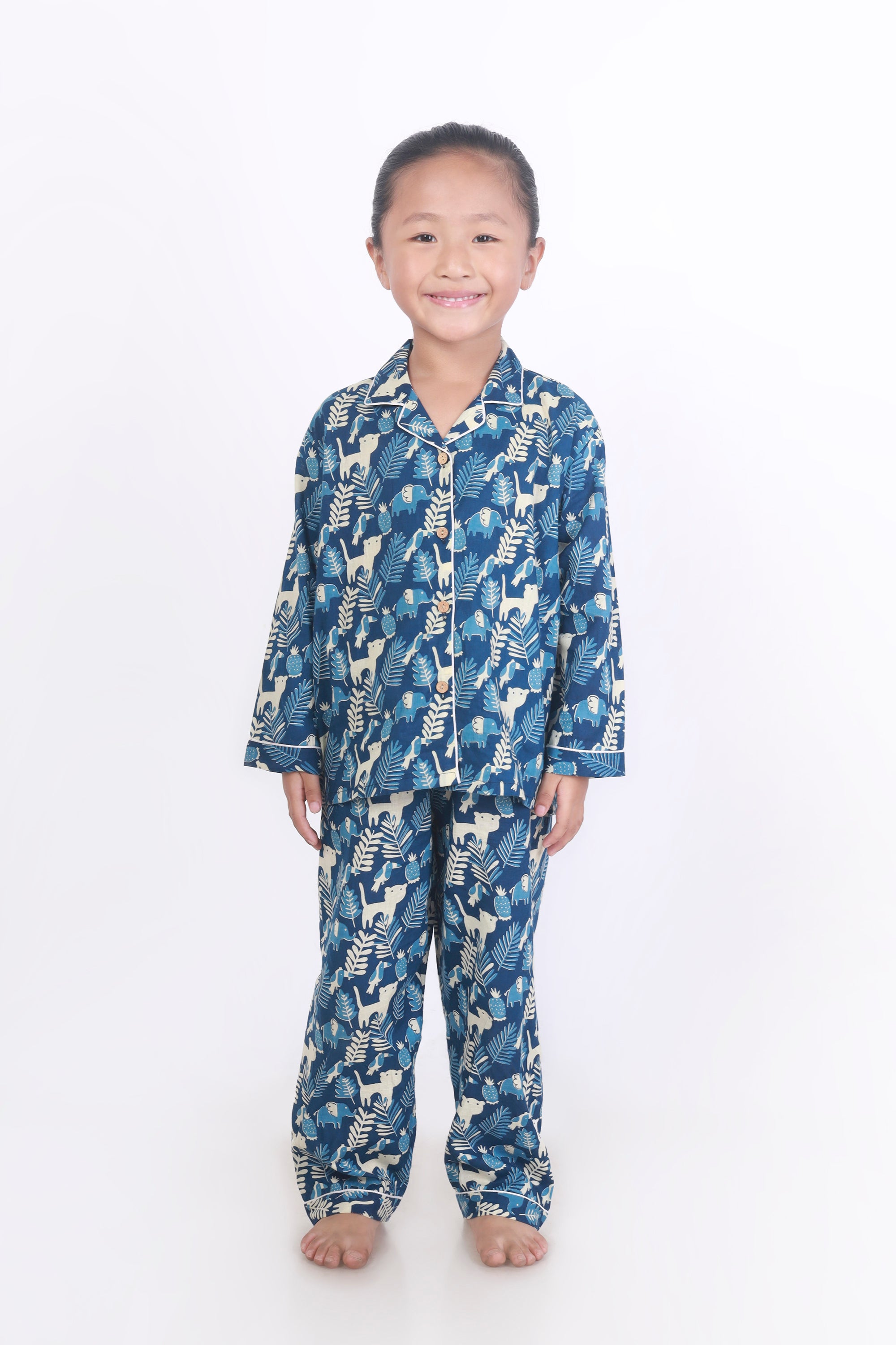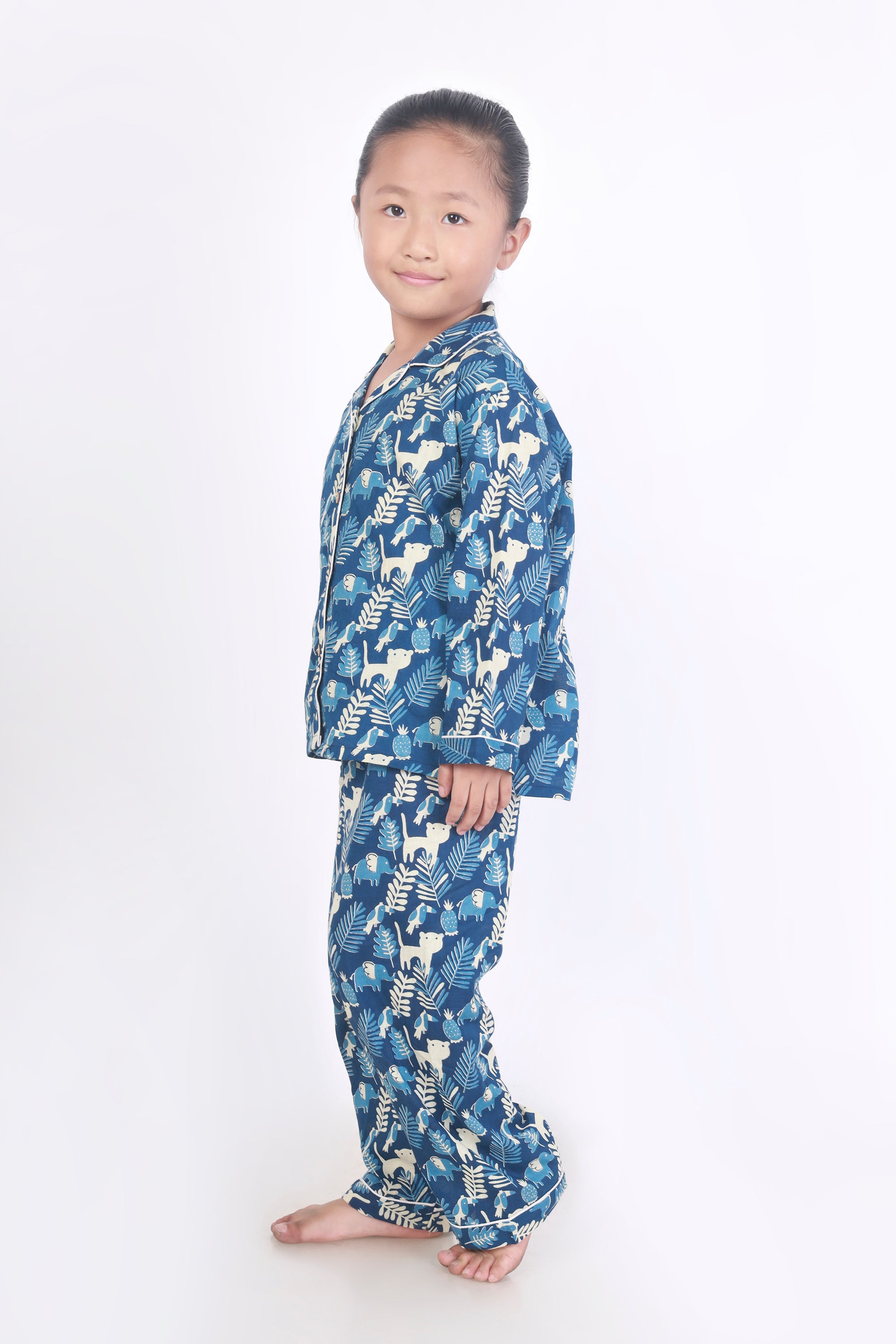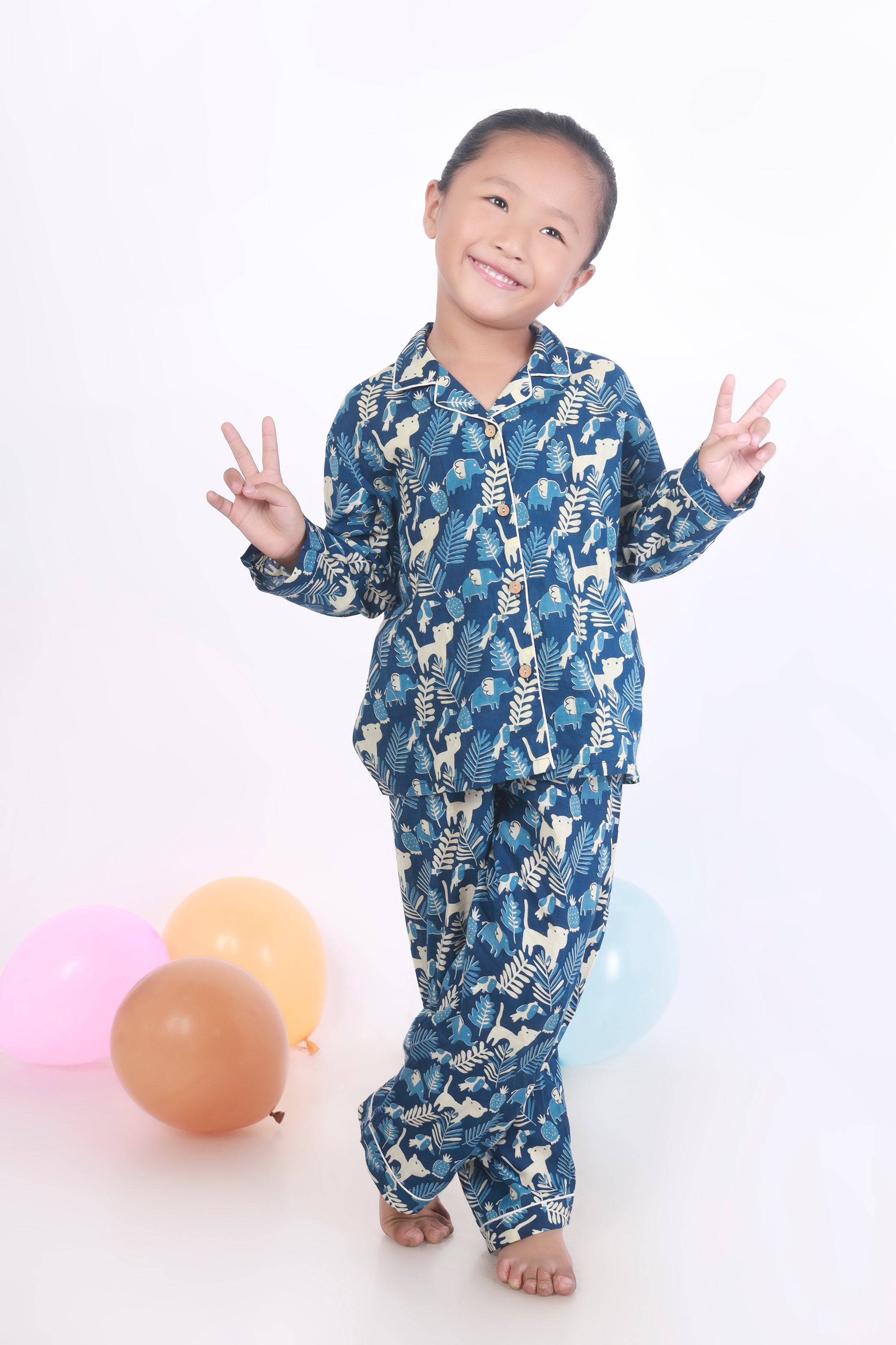 Kids Cotton Nightsuit – Blue Jungle Print Shirt & Pyjama Co-ord Set for Boys & Girls