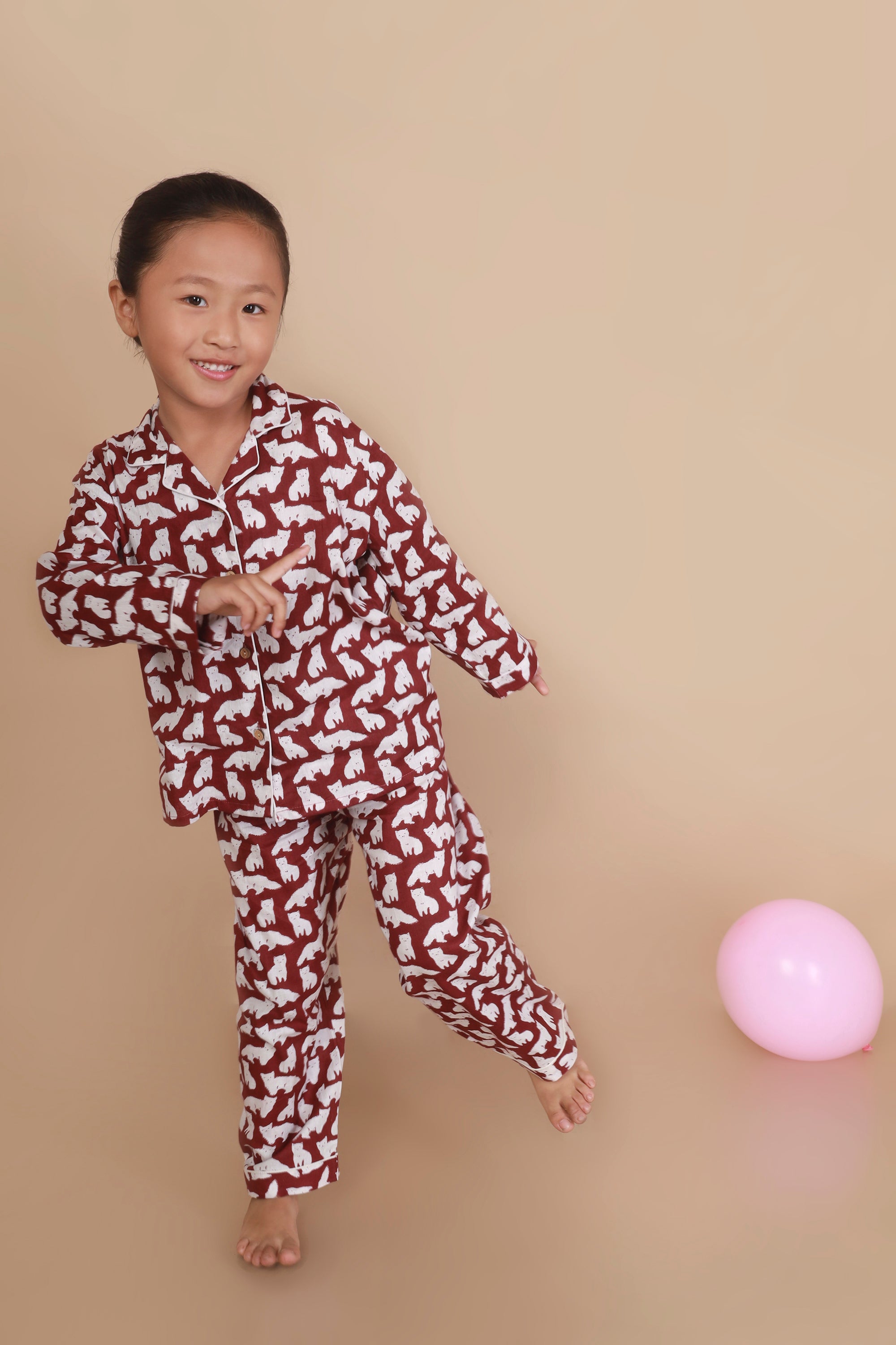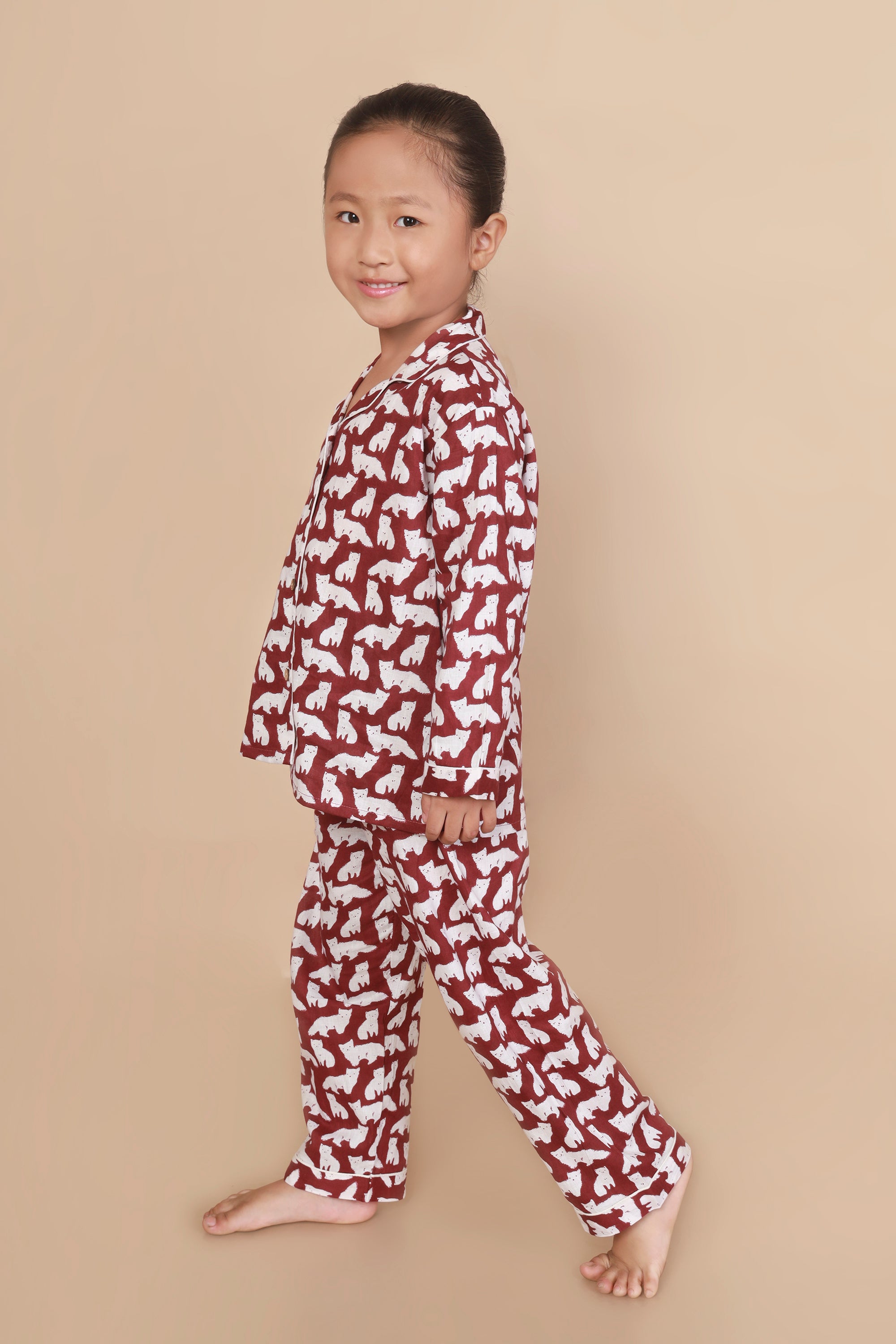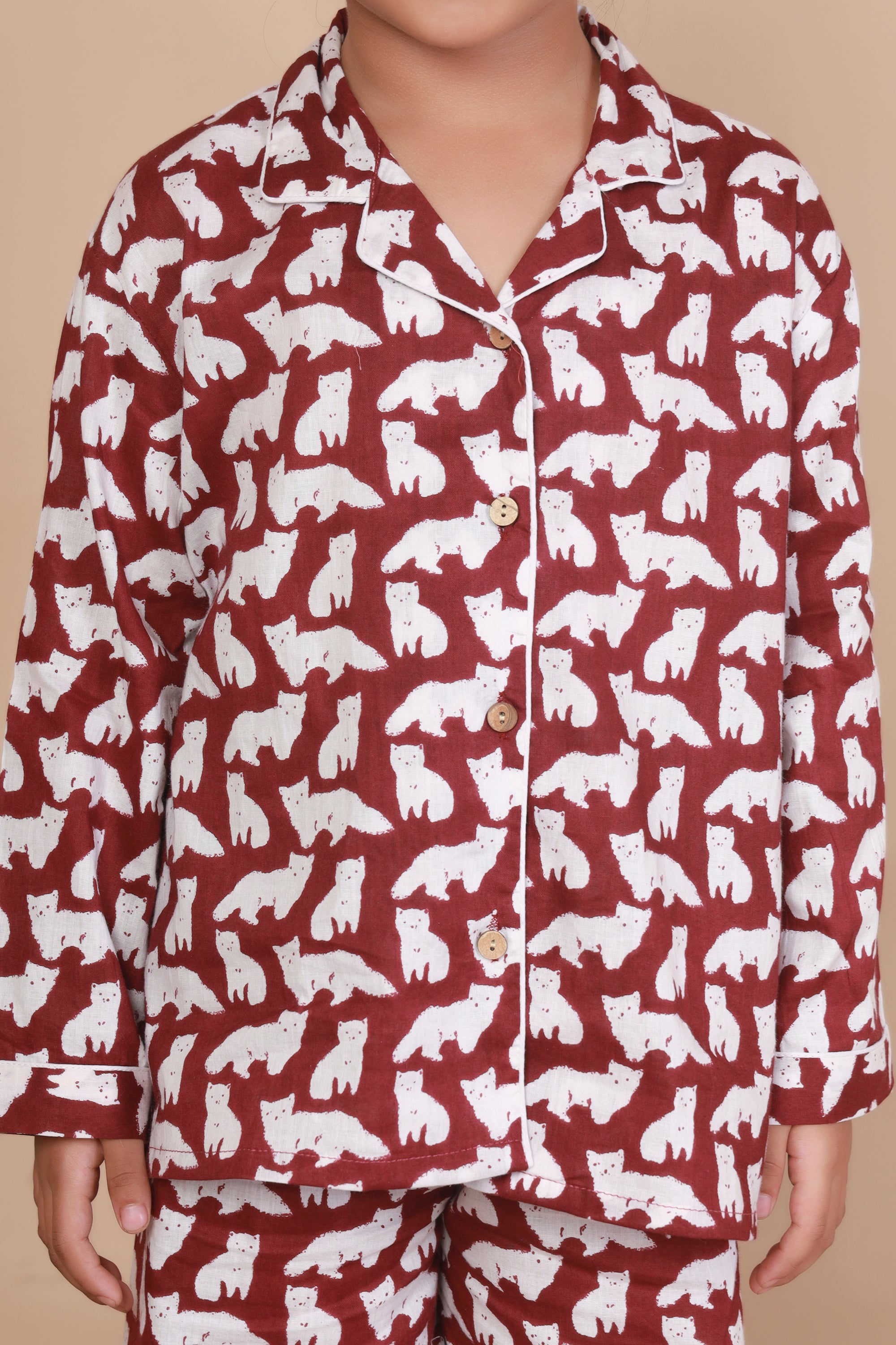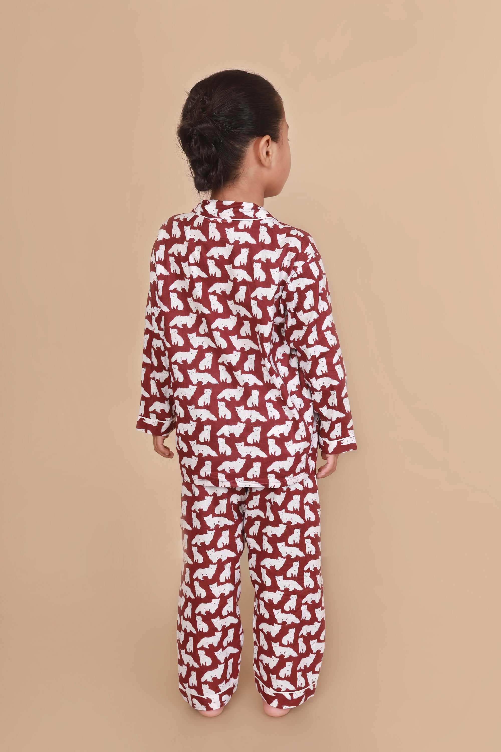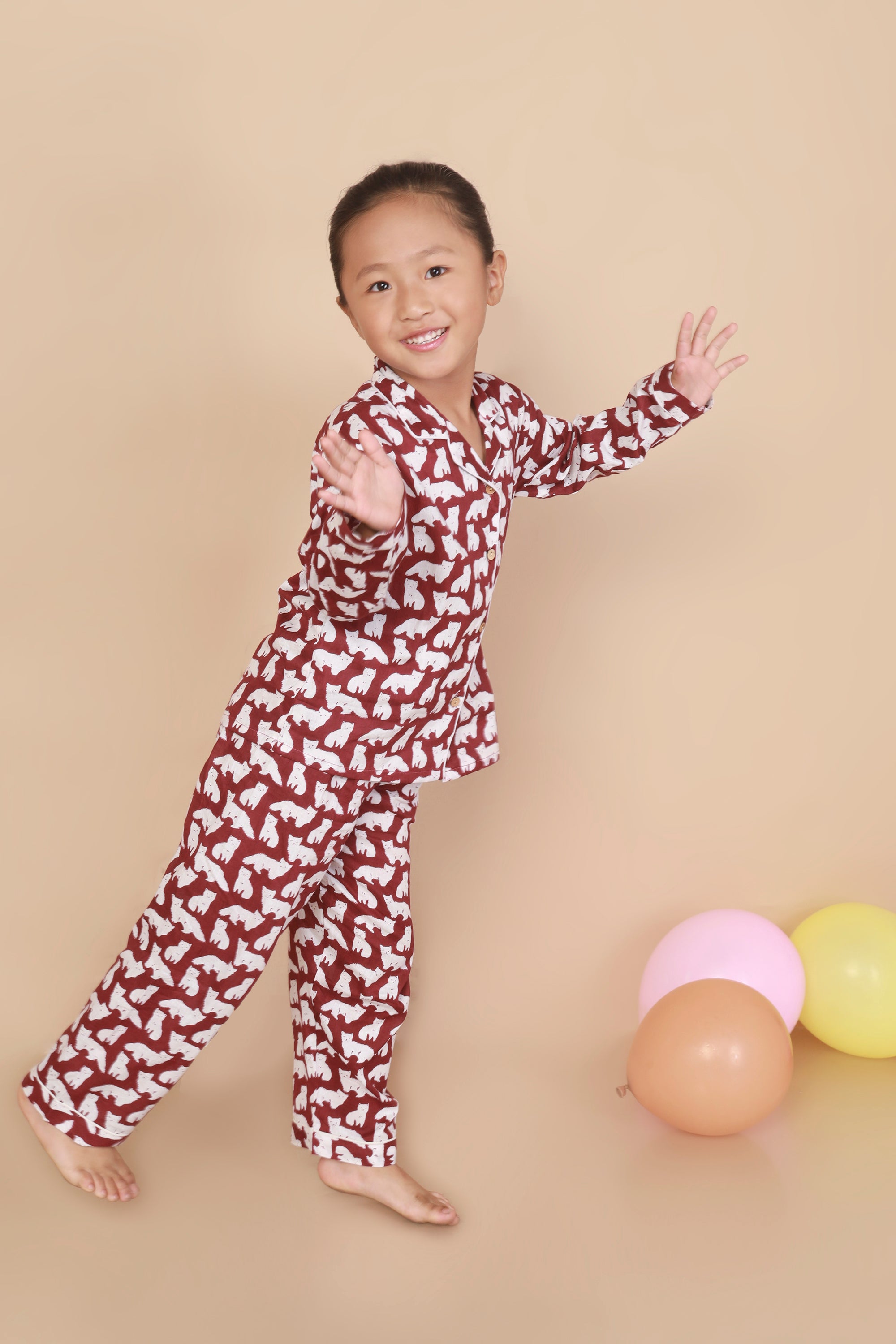 Say hello to purr-fect dreams! Our unisex cotton nightsuit in a playful cat print is designed to make bedtime both comfy and fun. Made with breathable cotton, this co-ord set features a classic notched collar shirt with full sleeves and matching straight-fit pyjamas. The maroon color and whimsical print make it an instant hit with kids. Thoughtfully designed for extra wiggle room and all-night comfort. Ideal for sleepovers, cozy nights, and lazy mornings.