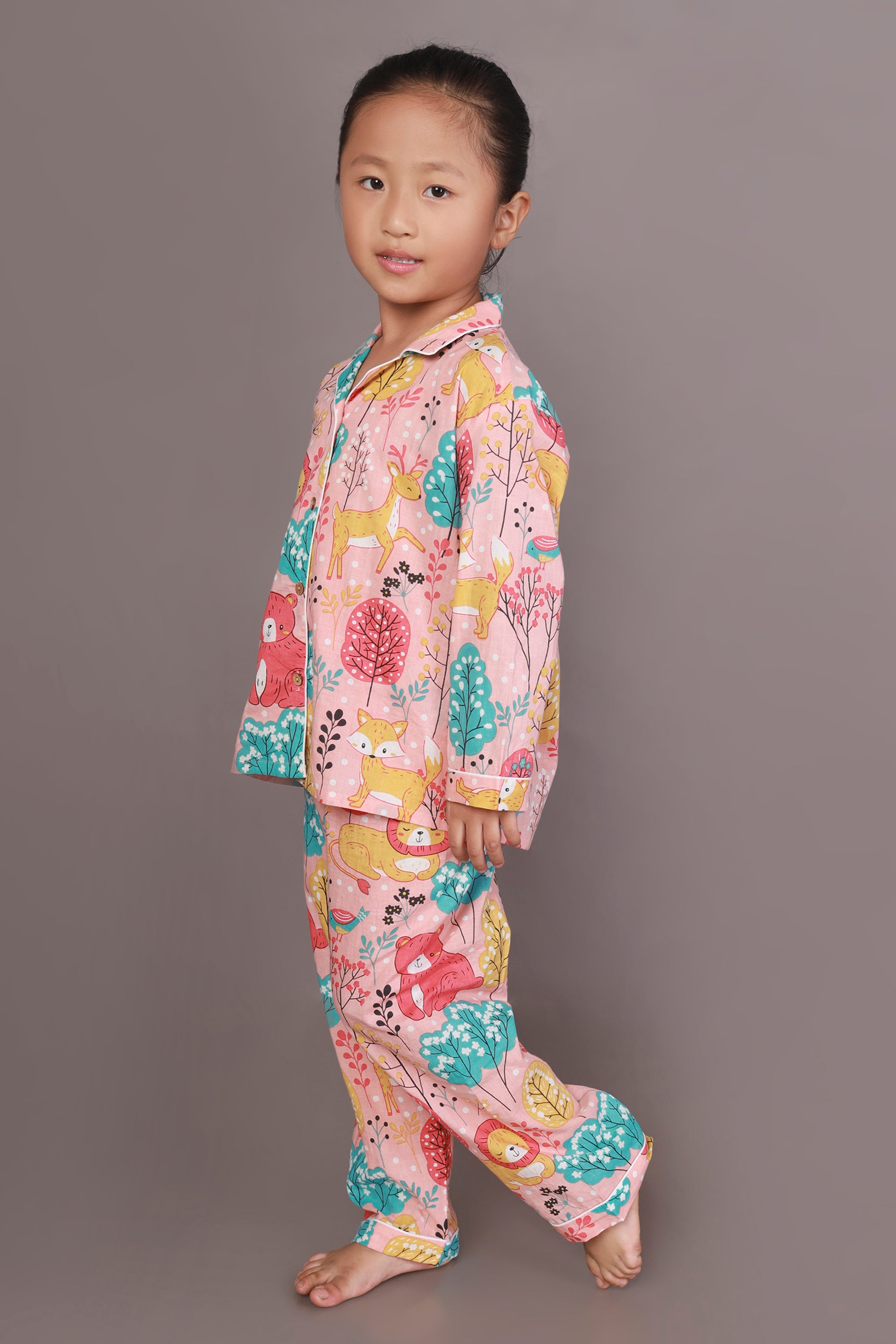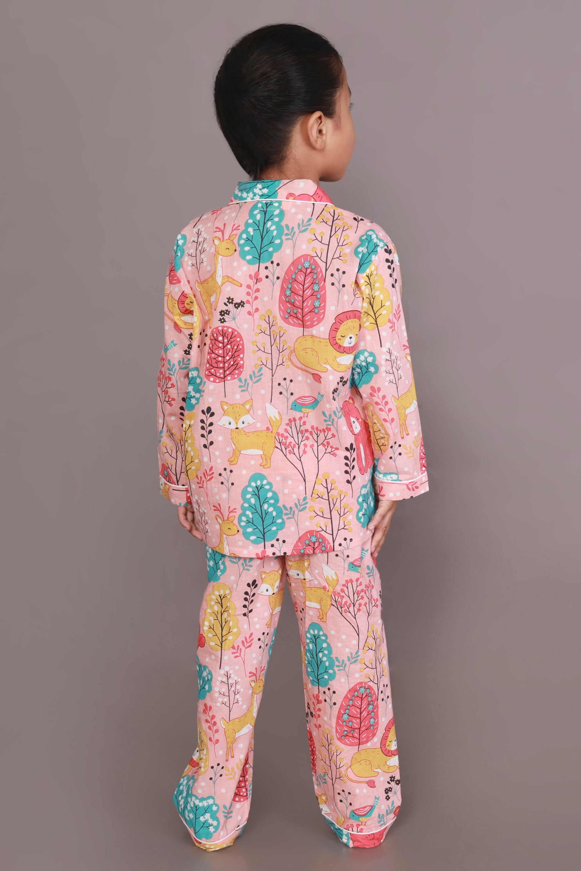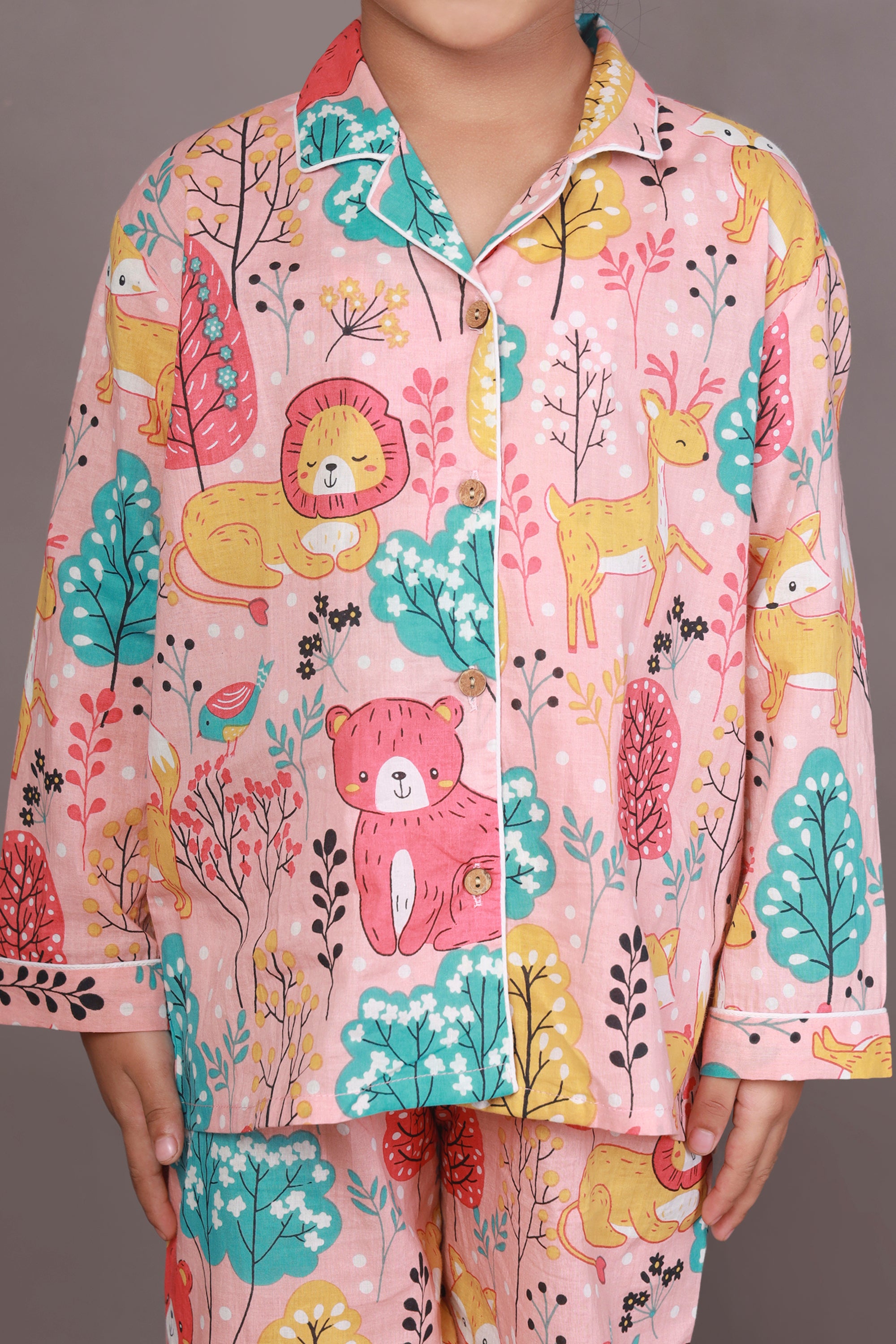 Add a touch of roars and cuddles to bedtime with this peach-toned nightsuit featuring an adorable lion and teddy print. Made from breathable cotton, this full-sleeve shirt and pyjama co-ord keeps kids comfy and cute.