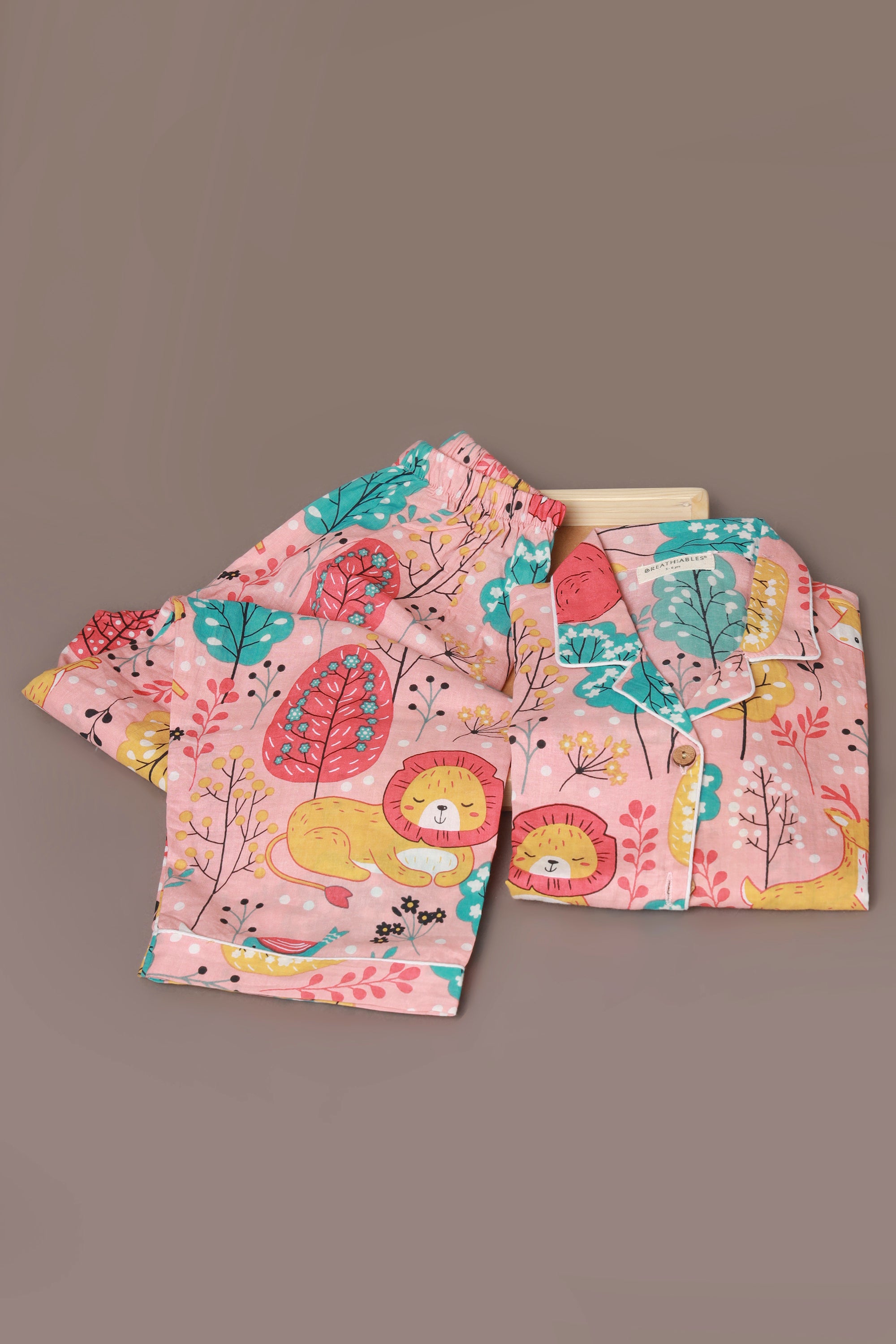 Kids Cotton Nightsuit – Peach Lion & Teddy Shirt & Pyjama Co-ord Set for Boys & Girls