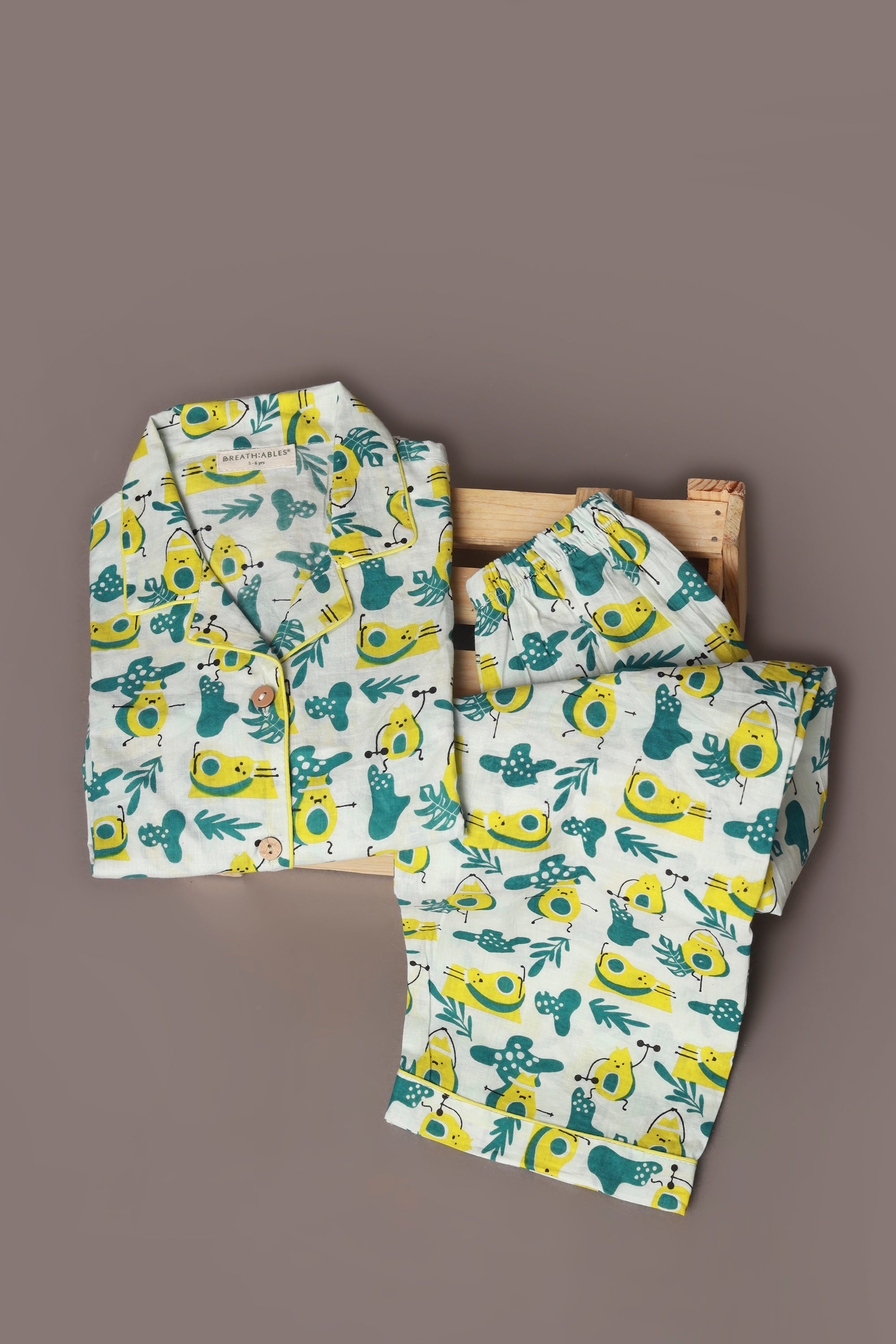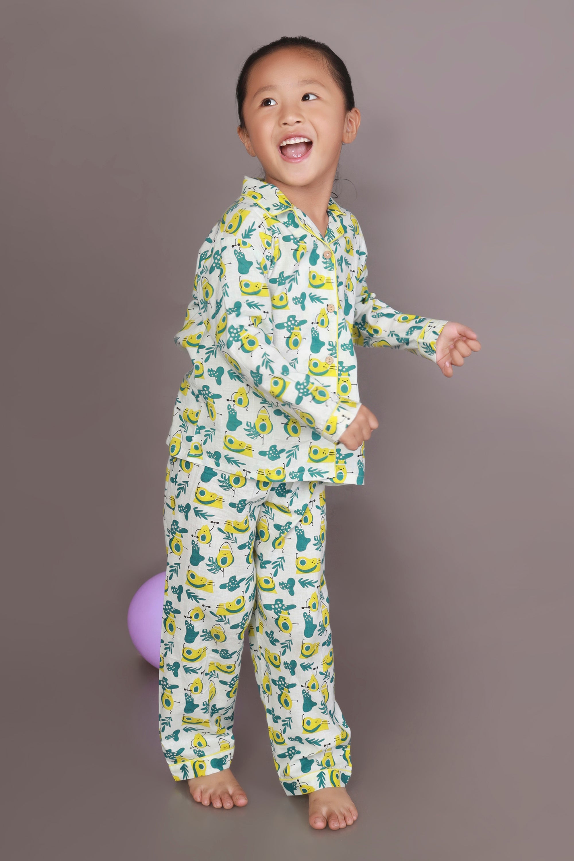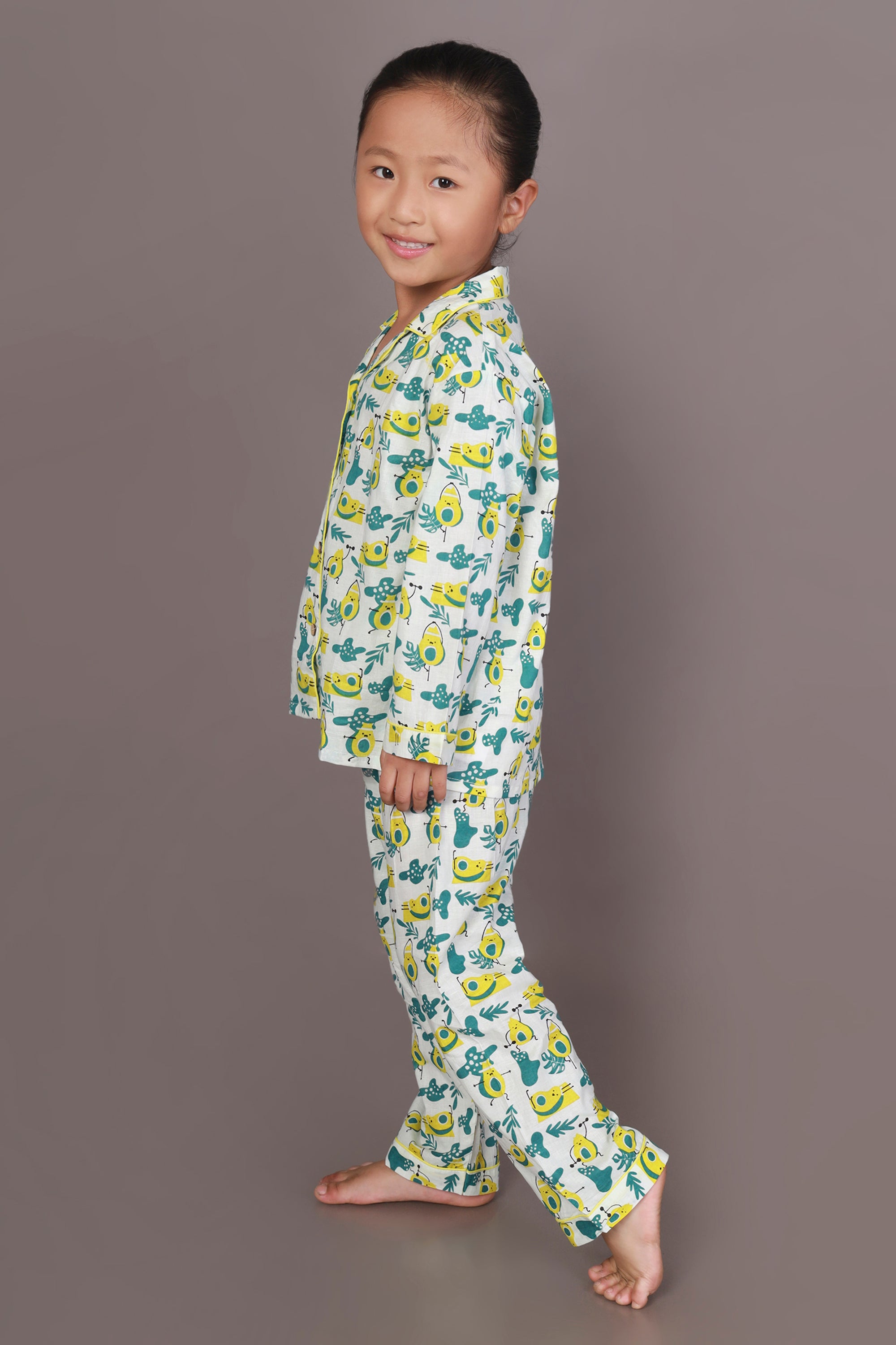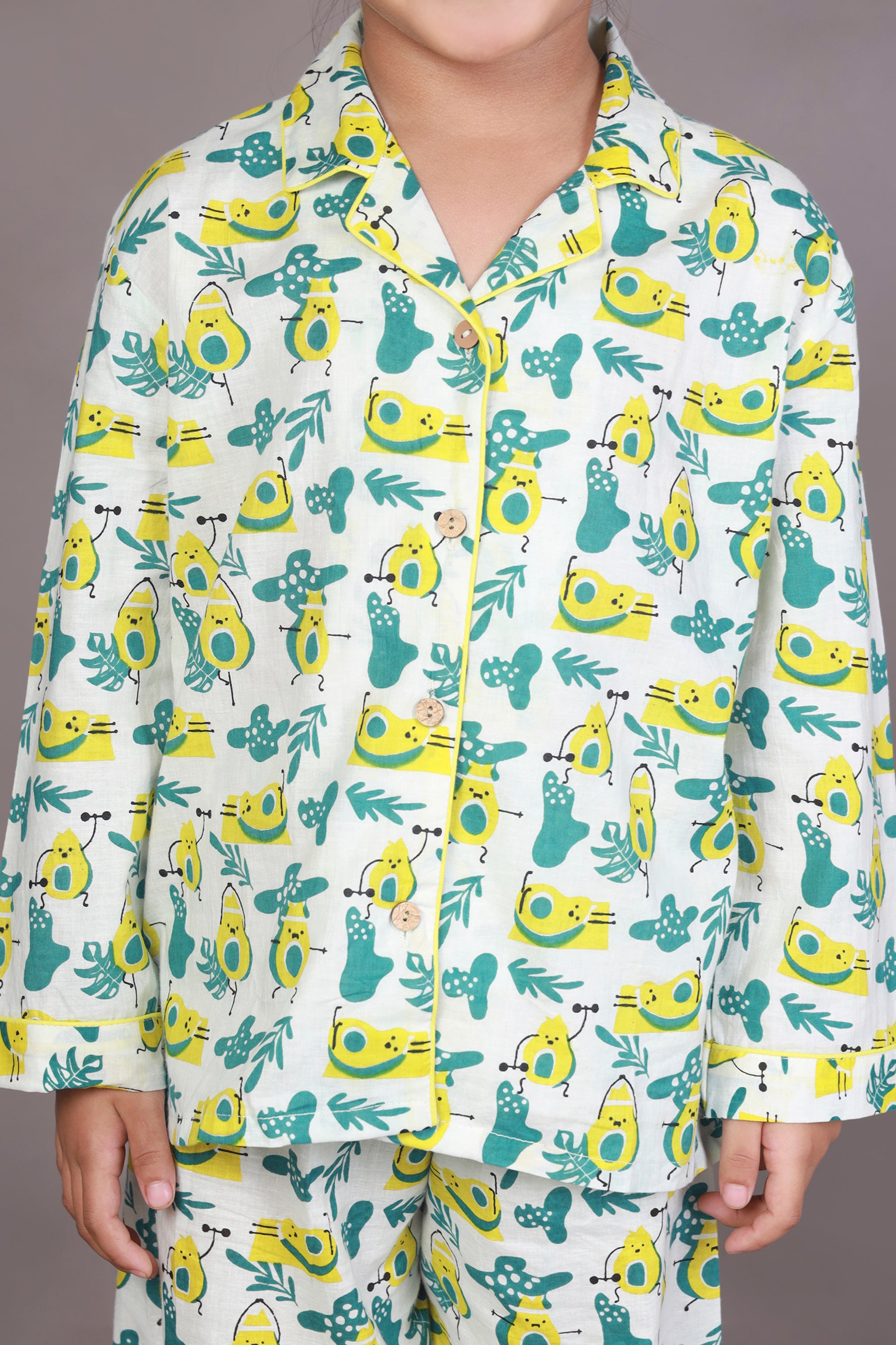 Kids Cotton Nightsuit – White Avocado Print Shirt & Pyjama Co-ord Set for Boys & Girls